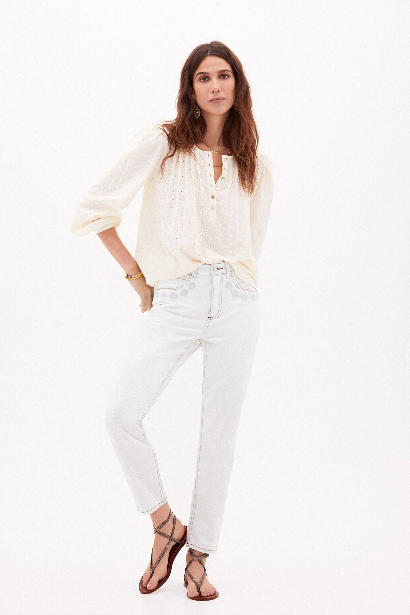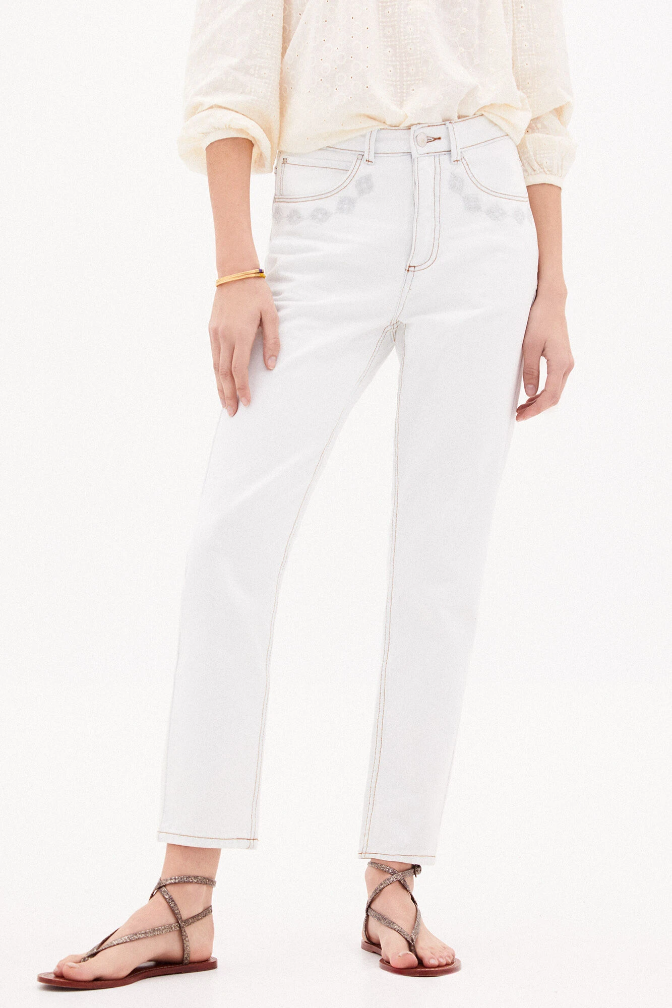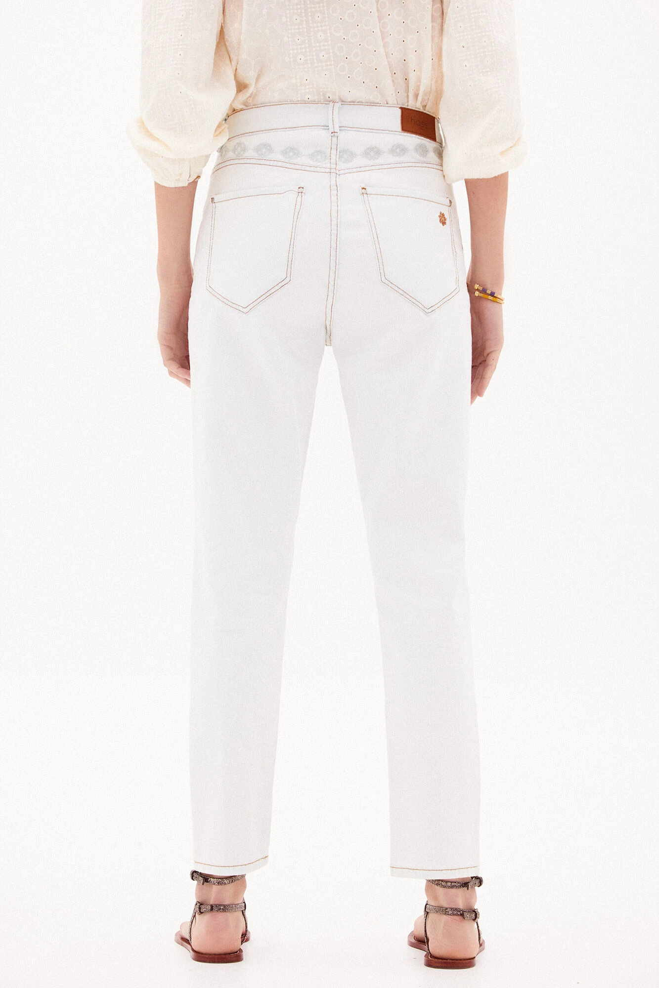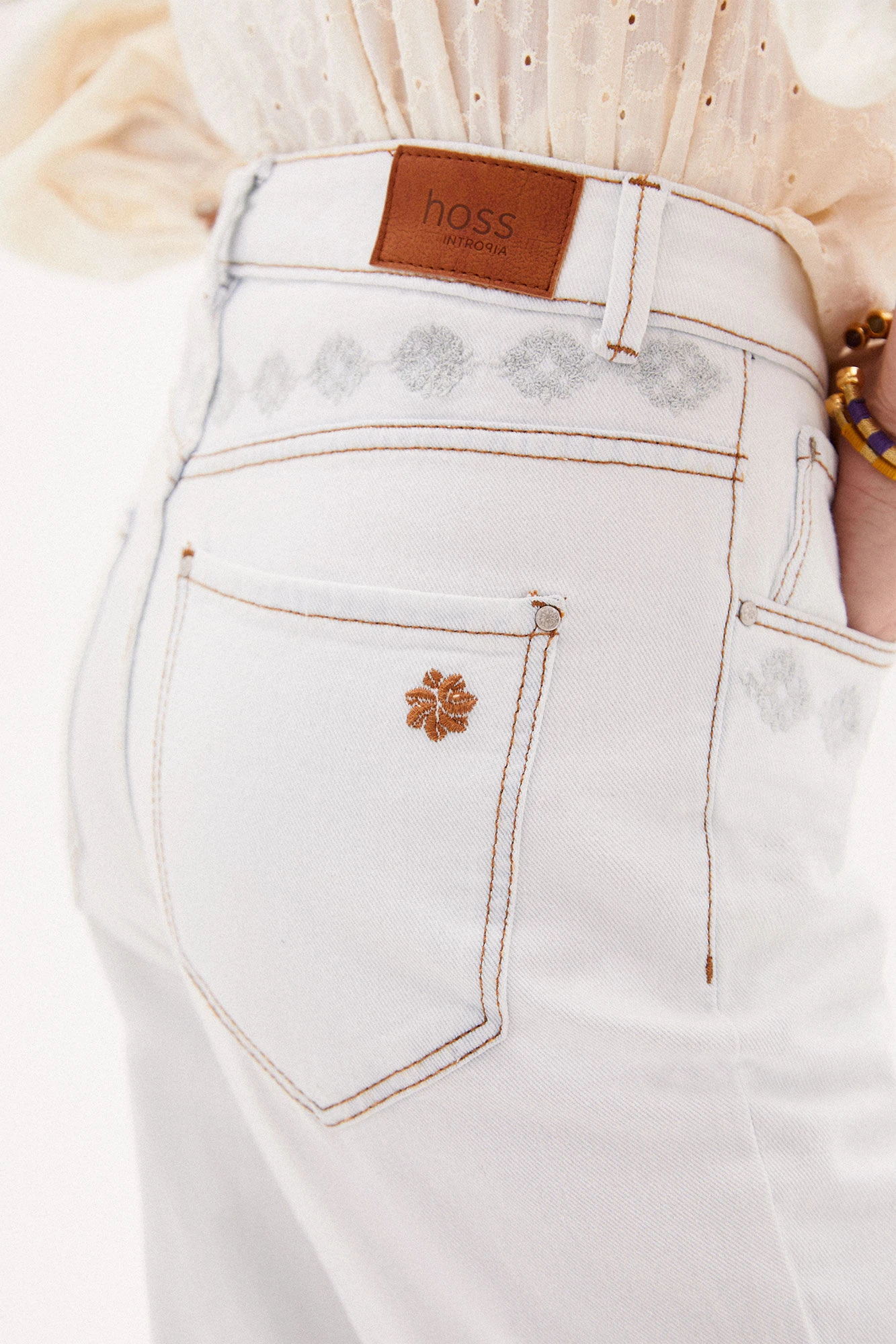 Los vaqueros ANGELA de Hoss Intropia apuestan por la fantasía y las nuevas tendencias. Tiene talle alto y un volumen mom algo redondeado. Su material en algodón … luce un bonito bordado en motivos geométricos a contraste tanto en los bolsillos delanteros como en el canesú trasero. Unos atrevidos vaqueros que se llevan con los bajos remangados y con una camiseta lisa para contrarrestar su marcado carácter.