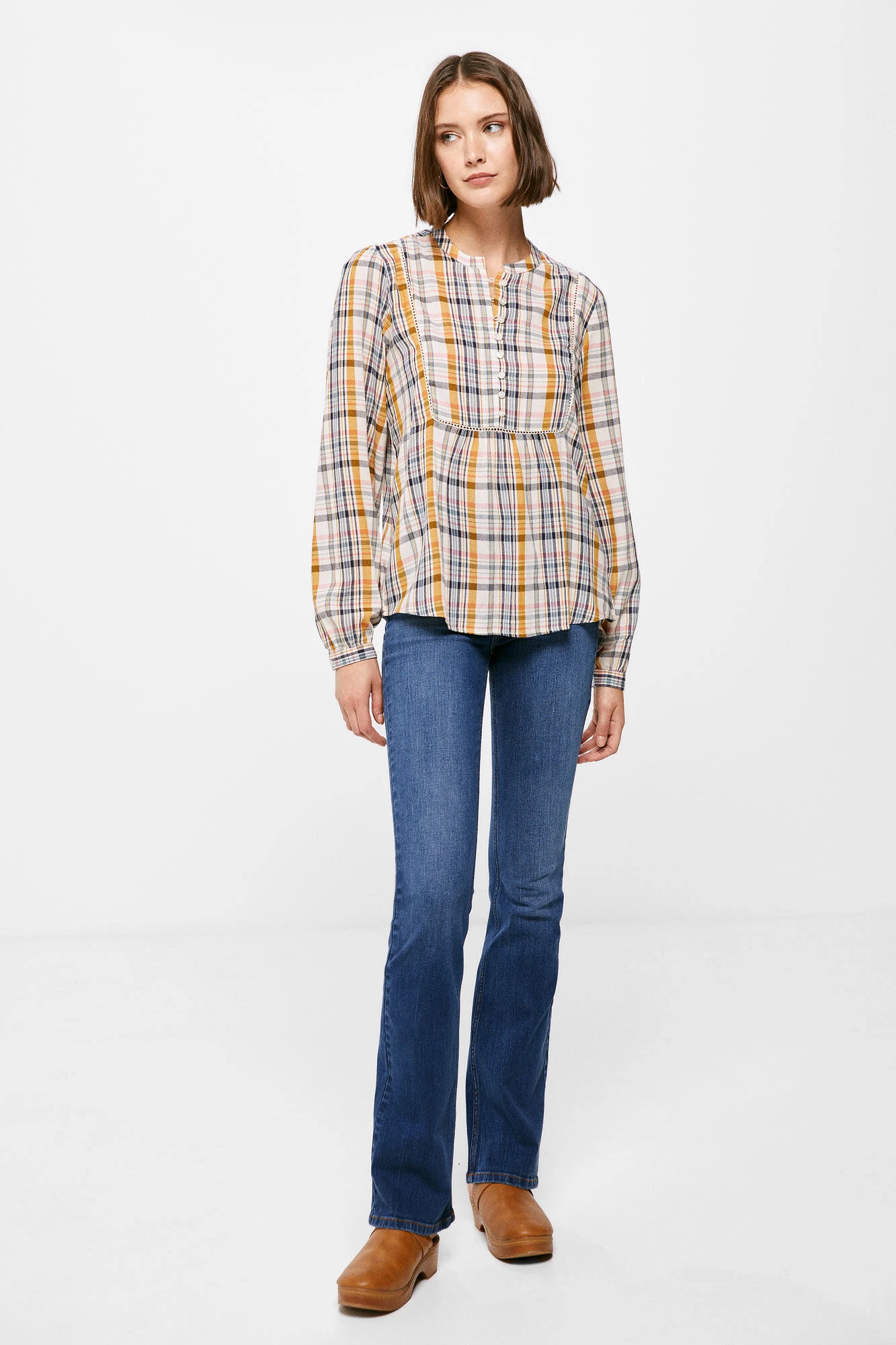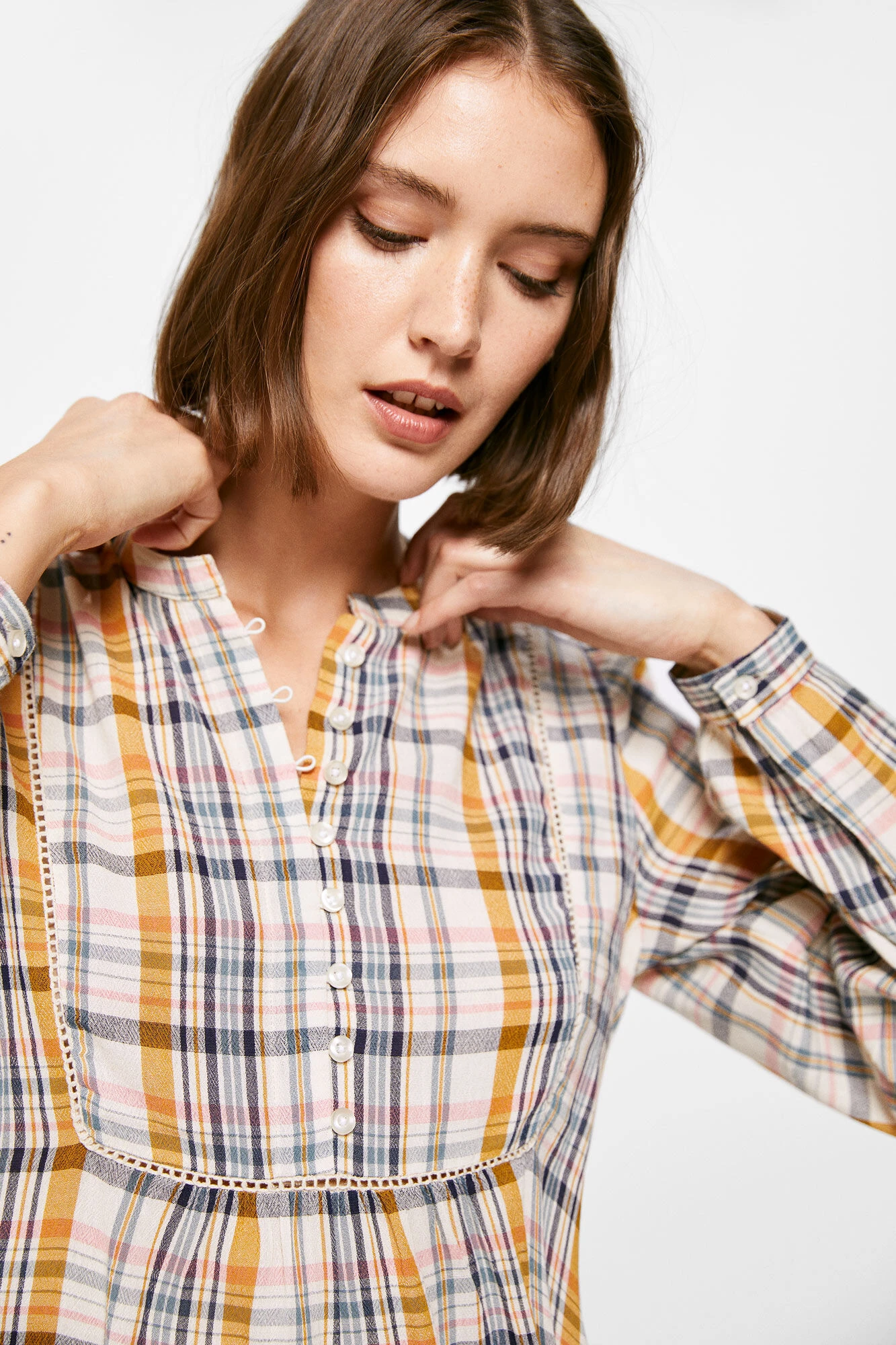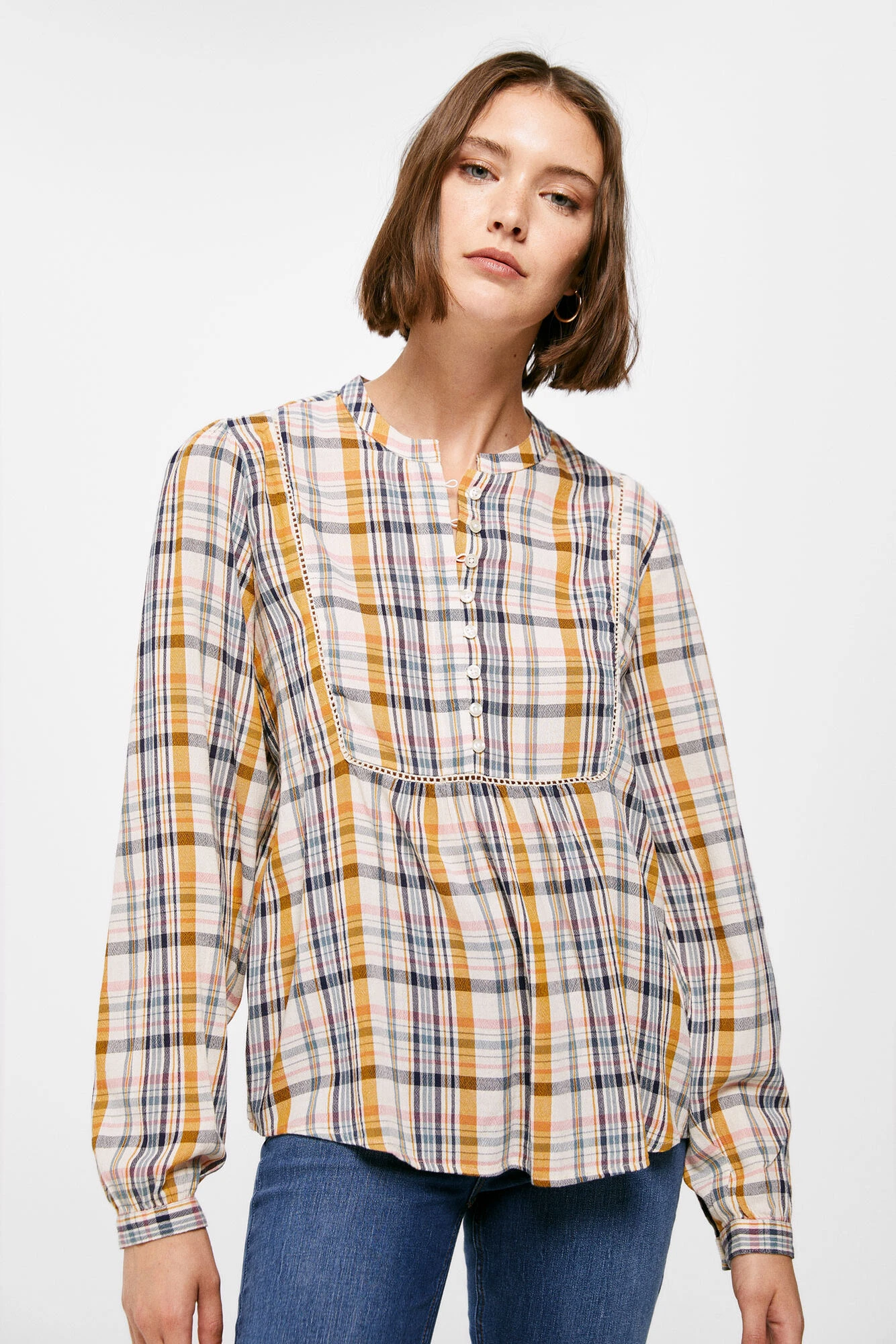Blusa de manga larga, con cuello redondo estilo mao, con pieza en el canesú con botones, con bajo con volumen y con estampado de cuadros.