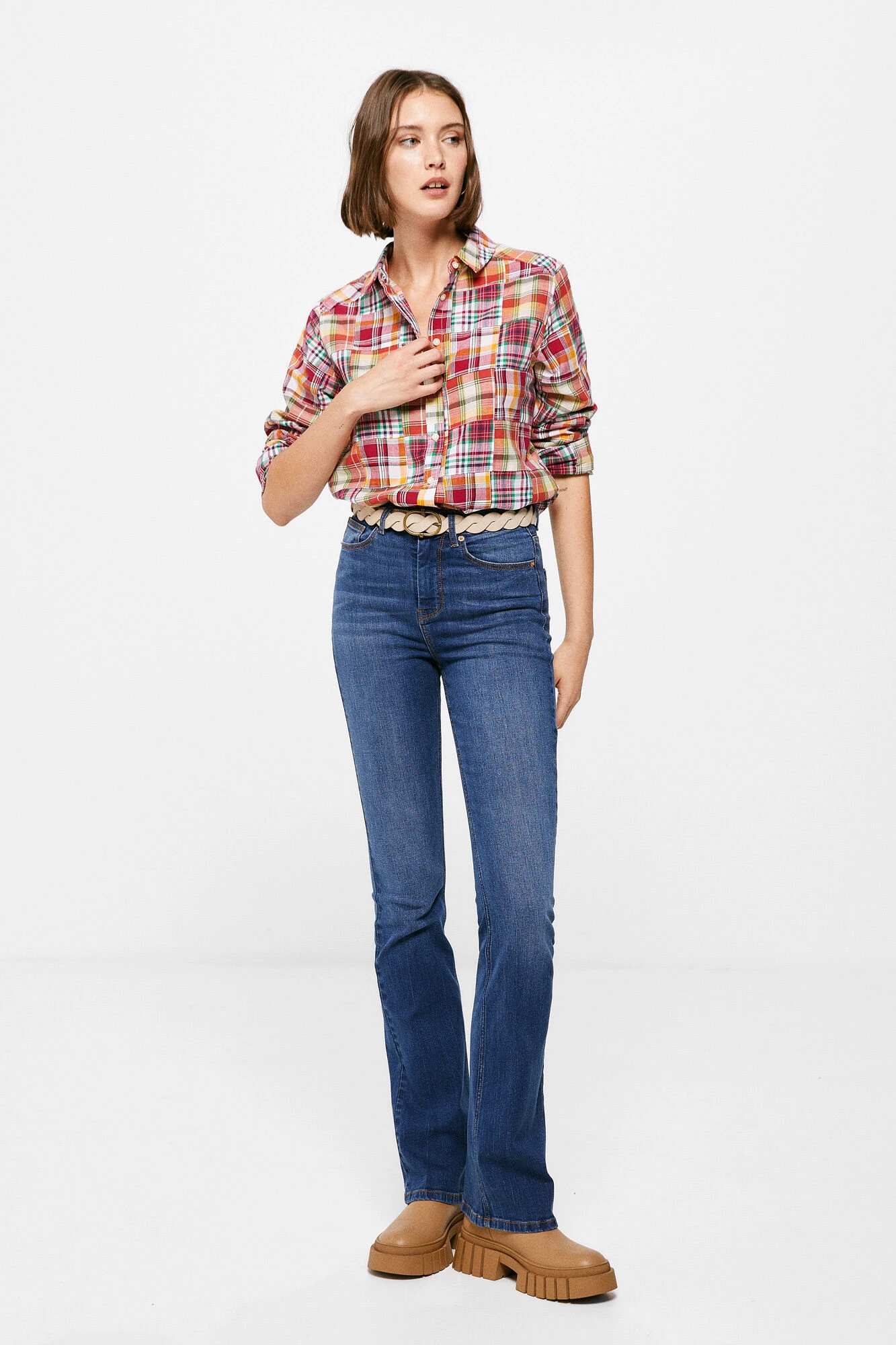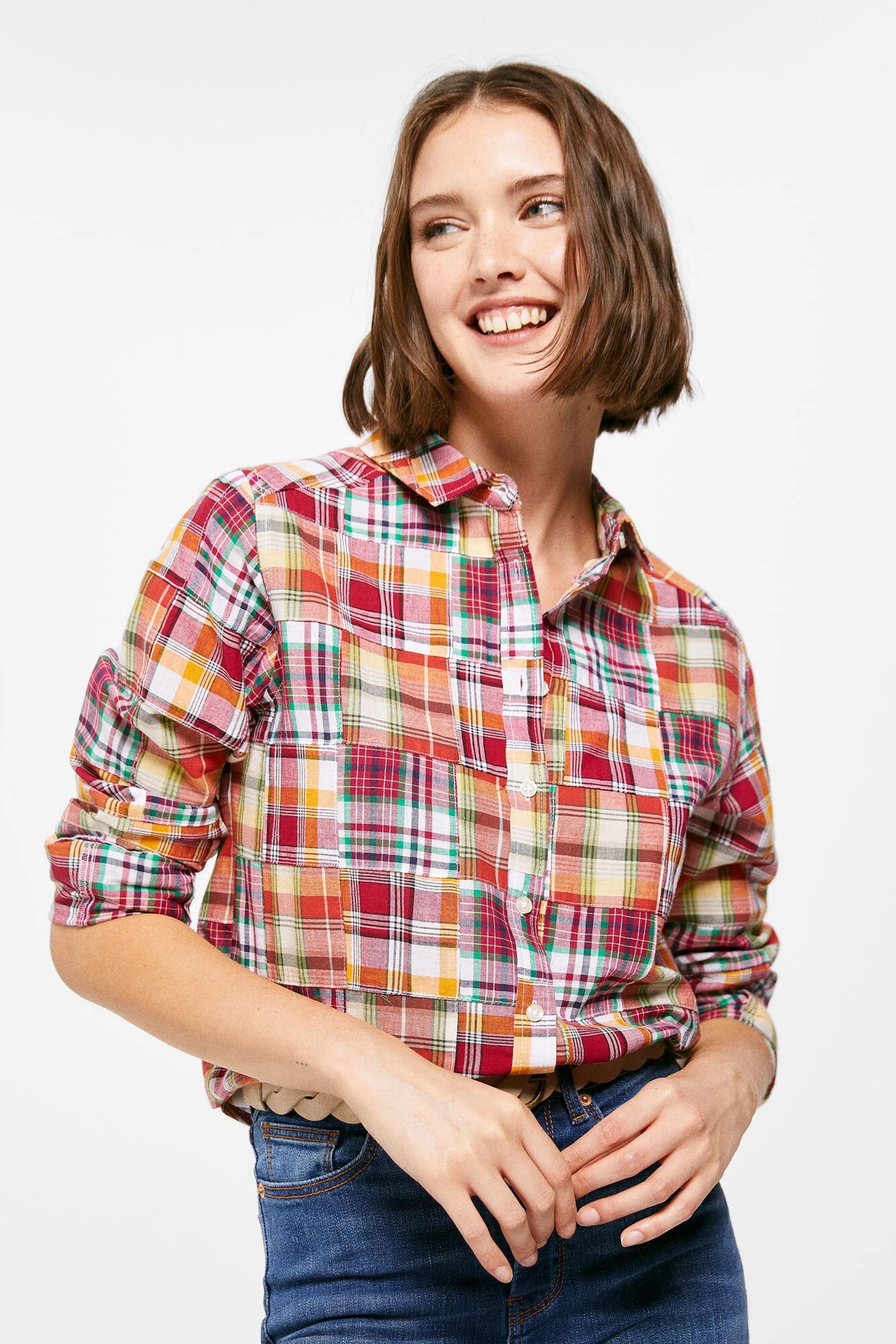 Blusa de manga larga, con cuello camisero, con botones en el delantero y en los puños, con estampado de cuadros patchwork.