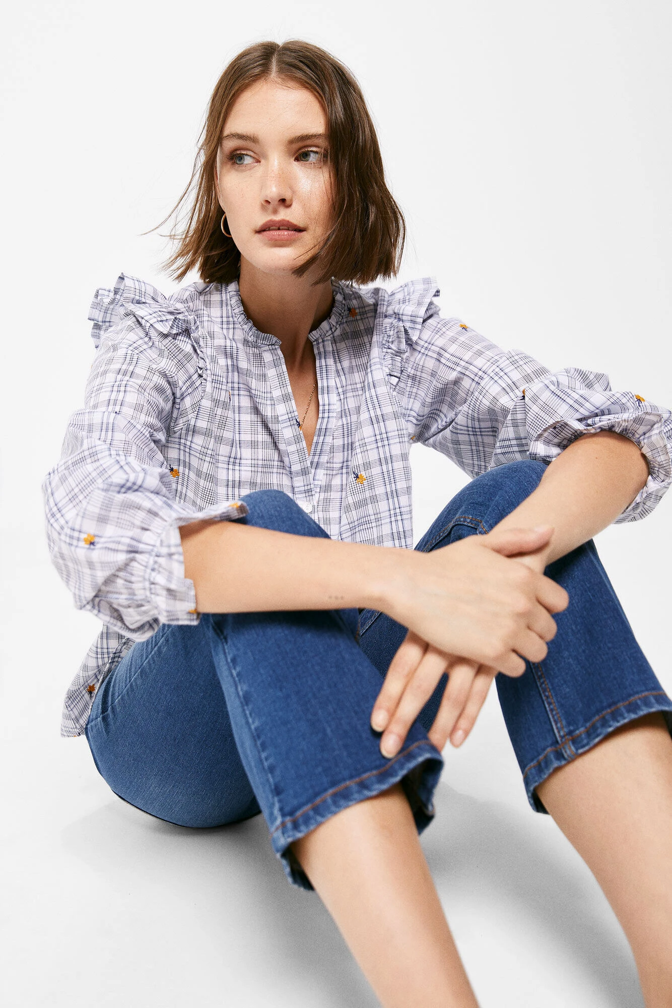 Blusa de manga larga con volumen, con cuello redondo con abertura en uve, con botones en el delantero, con cuadros y con volantes en los hombros y en los puños.