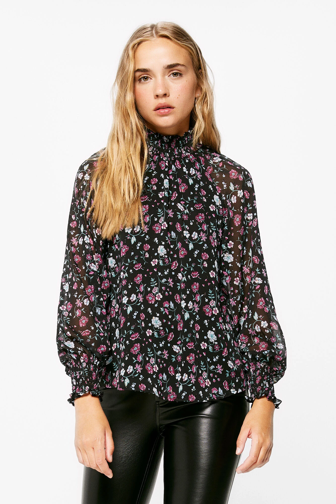 Blusa de manga larga con volumen, con cuello estilo perkins, con nido de abeja en el cuello y en los puños, con cuerpo fluido y con estampado.