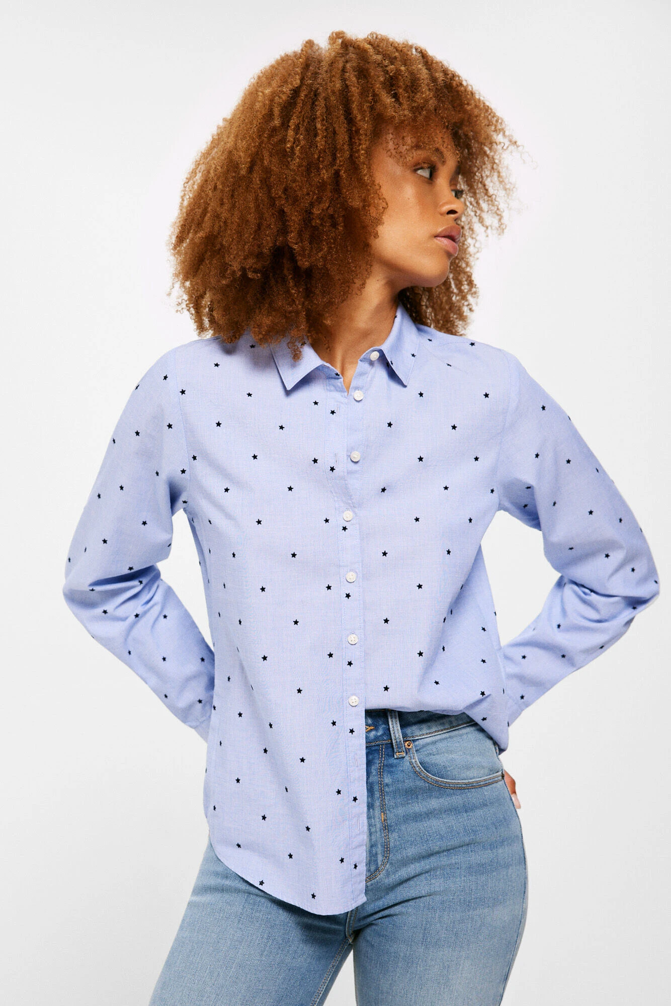 Blusa de manga larga, con cuello camisero, con botones en el delantero, con doble botón en el puño, con detalle de estrellas flocadas.