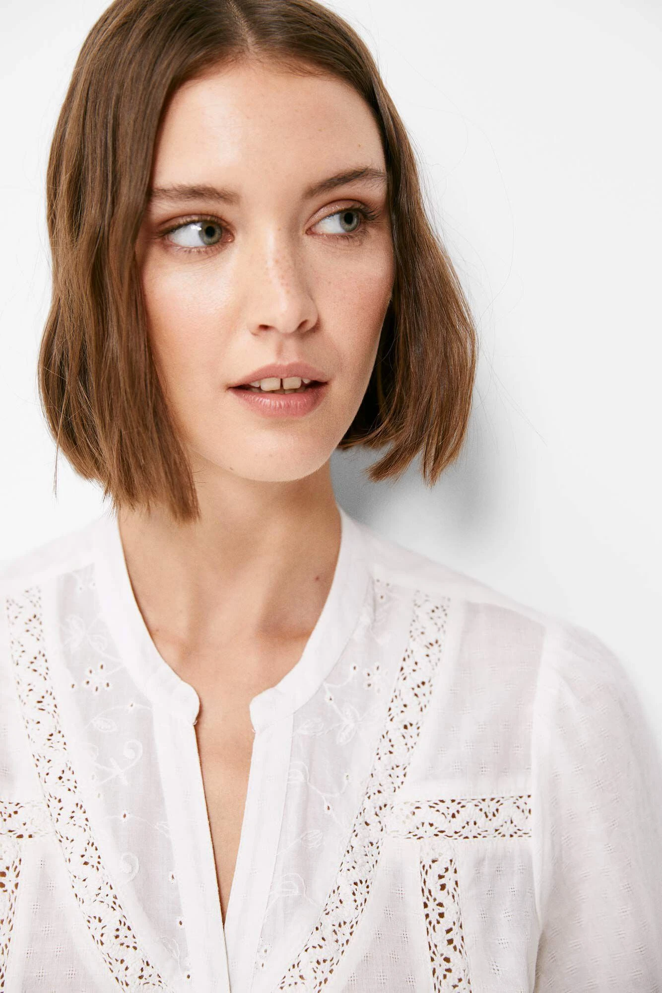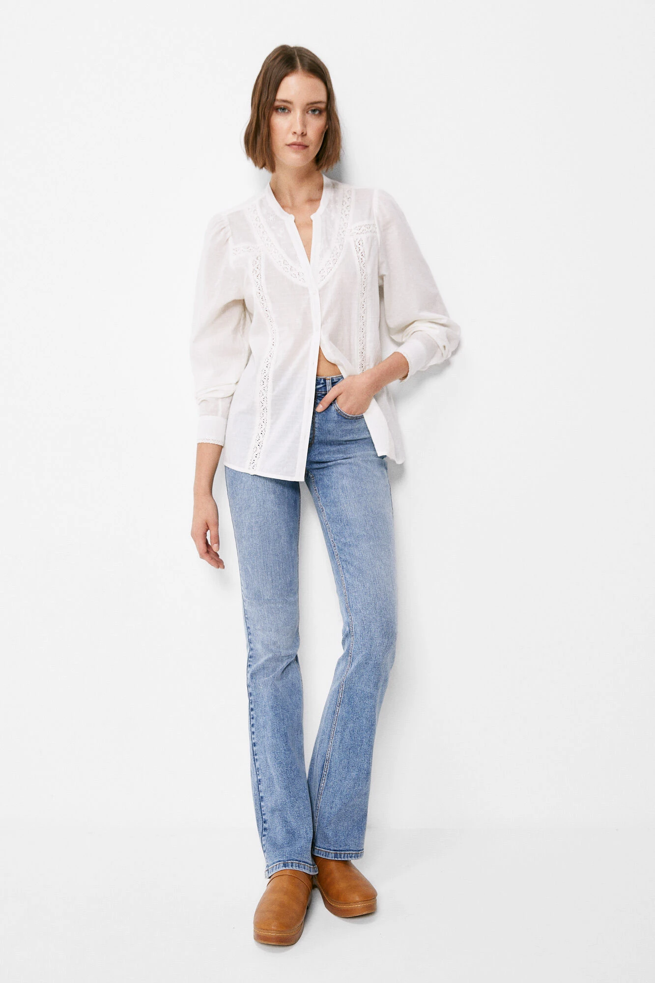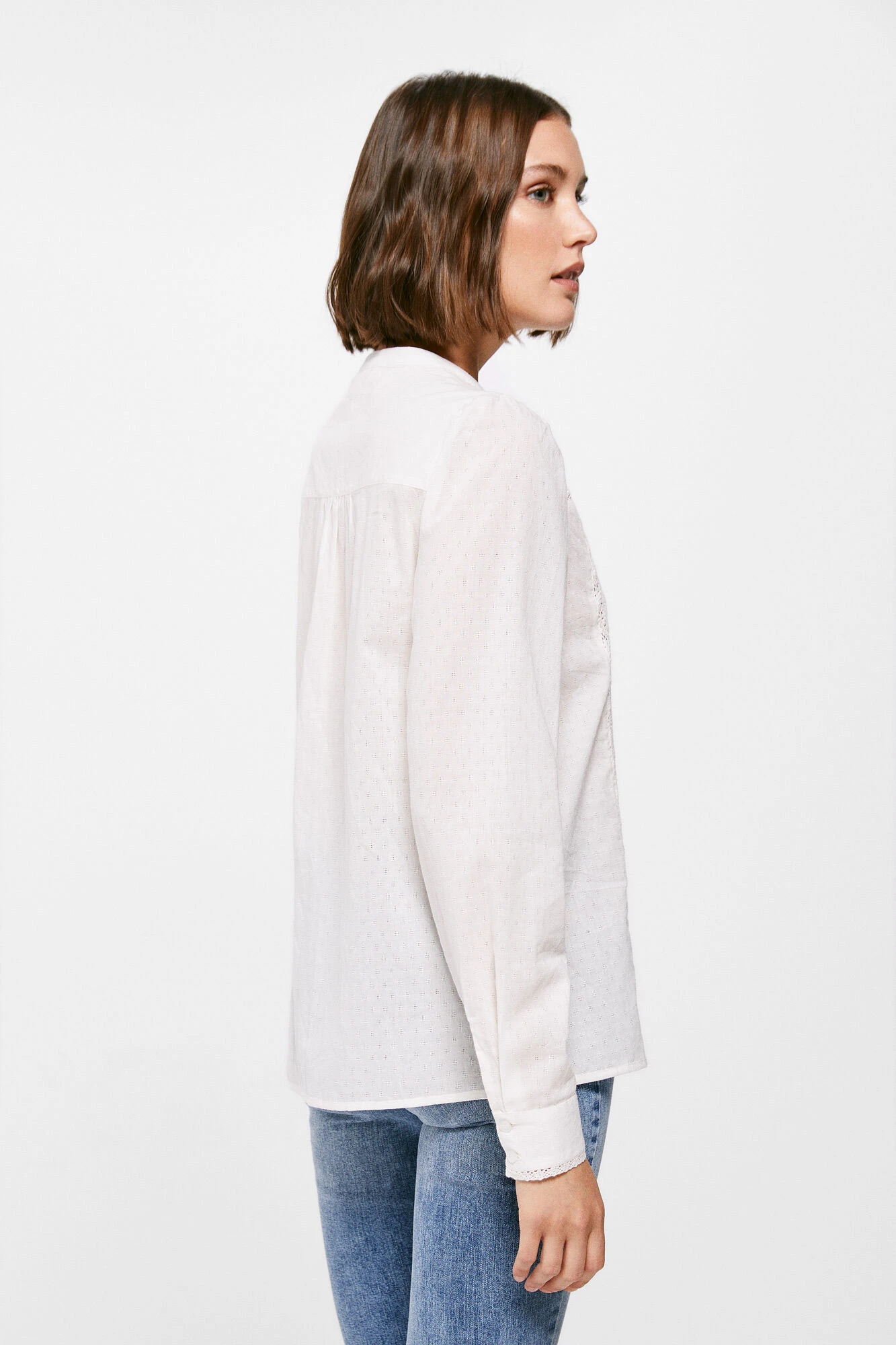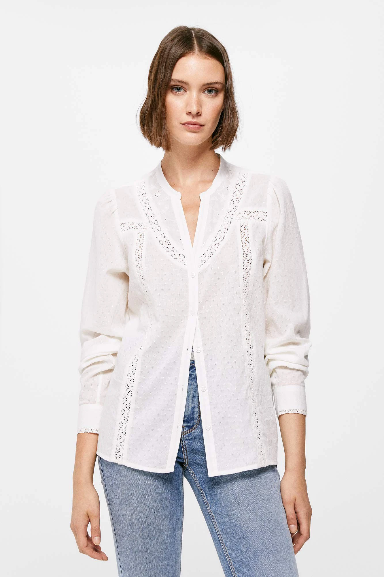 Blusa de manga larga, con cuello estilo mao con abertura en uve, con detalle de lace en el canesú en el delantero y en los puños y con botones en el delantero.