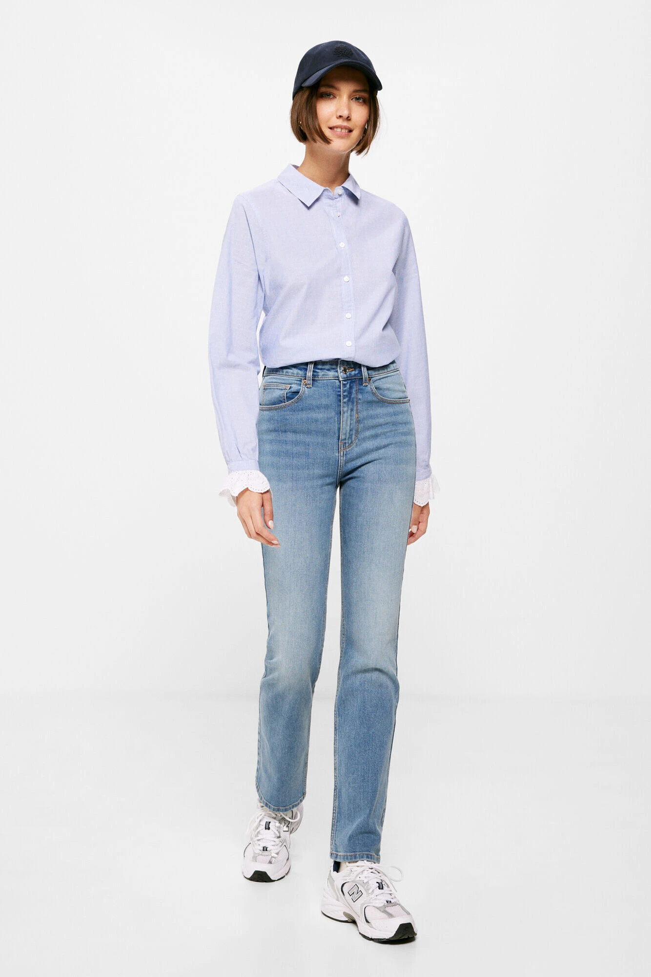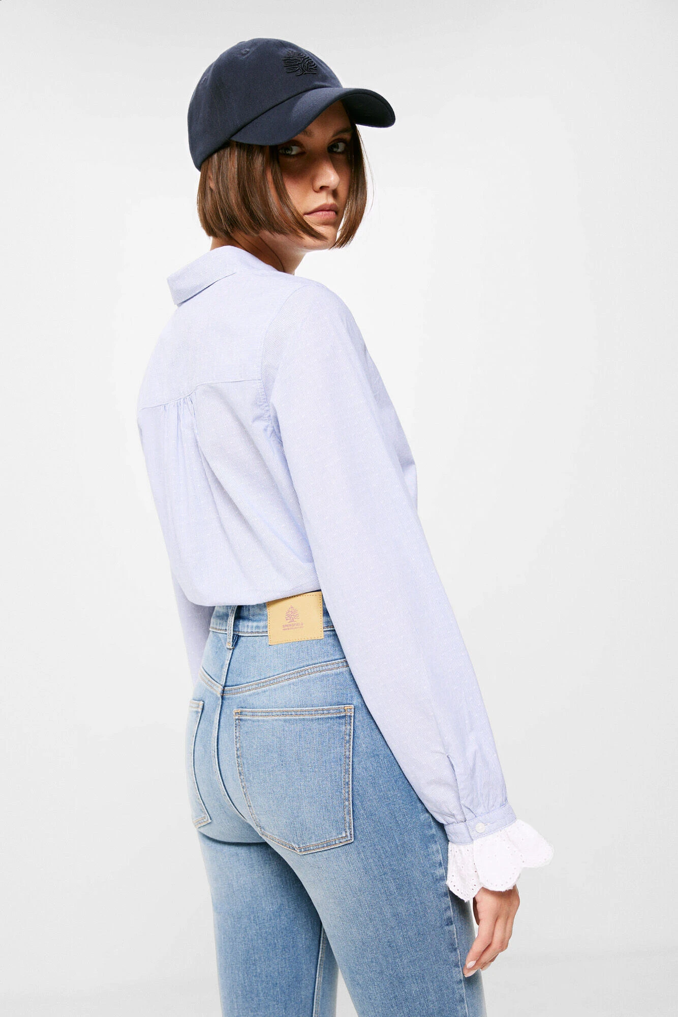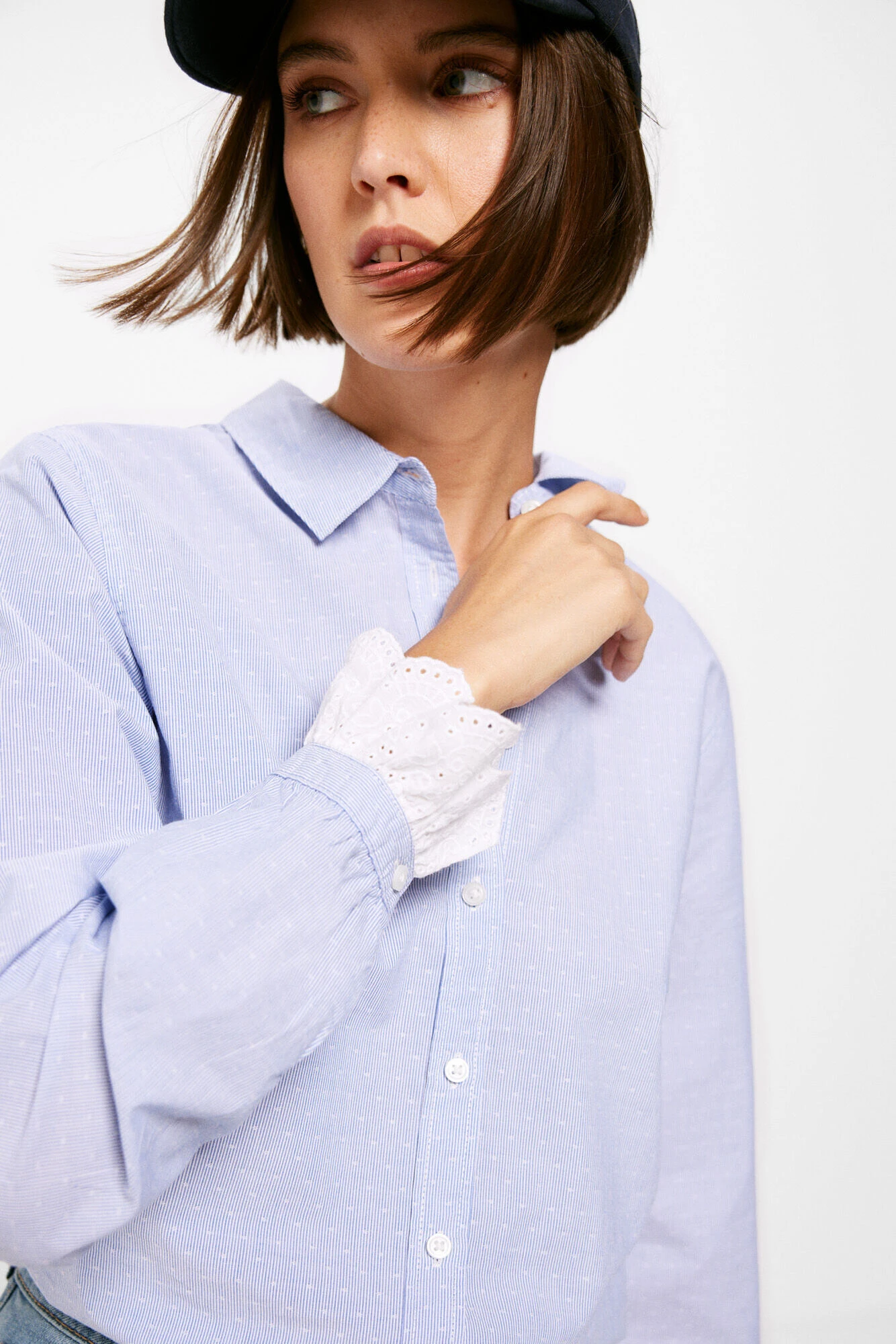 Blusa de manga larga con cuello camisero, con botones en el delantero, con detalle de puños de schiffly y con rayas.