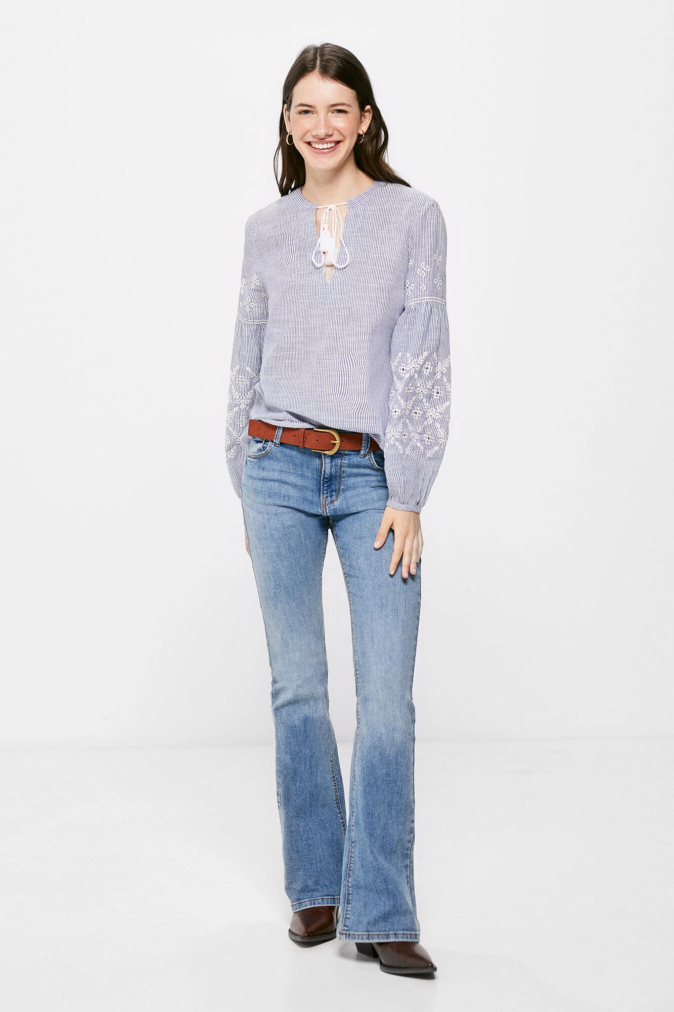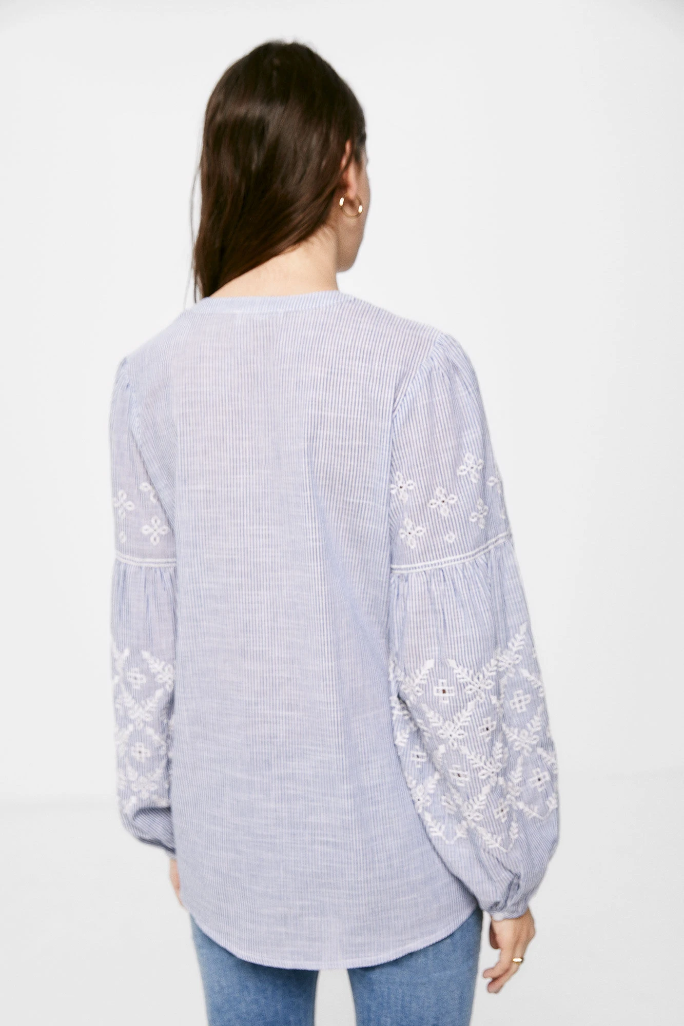 Blusa de manga larga con volumen, con cuello redondo estilo mao, con abertura en uve con lazo con borlas, con rayas y con detalles bordados en las mangas.
