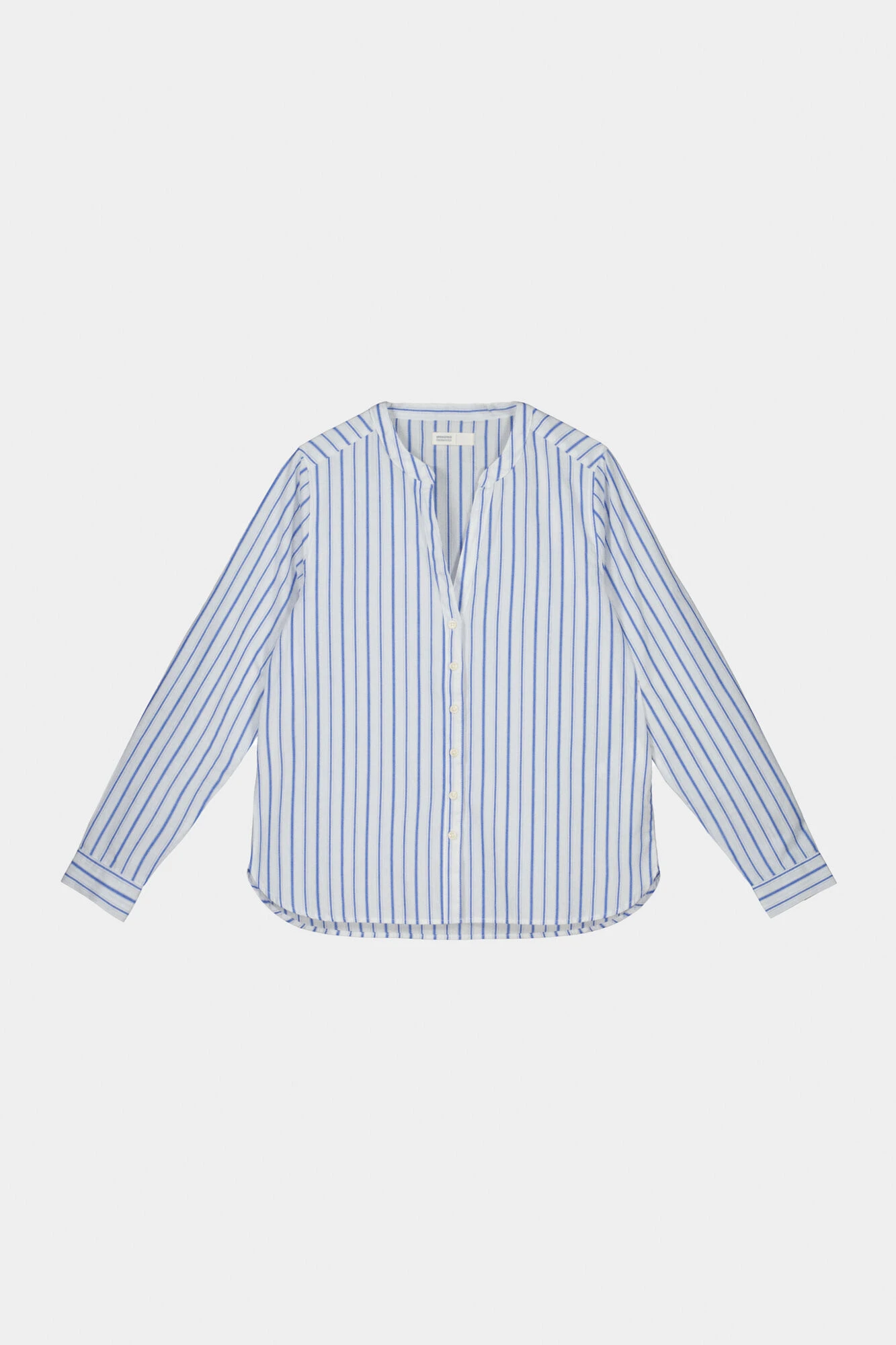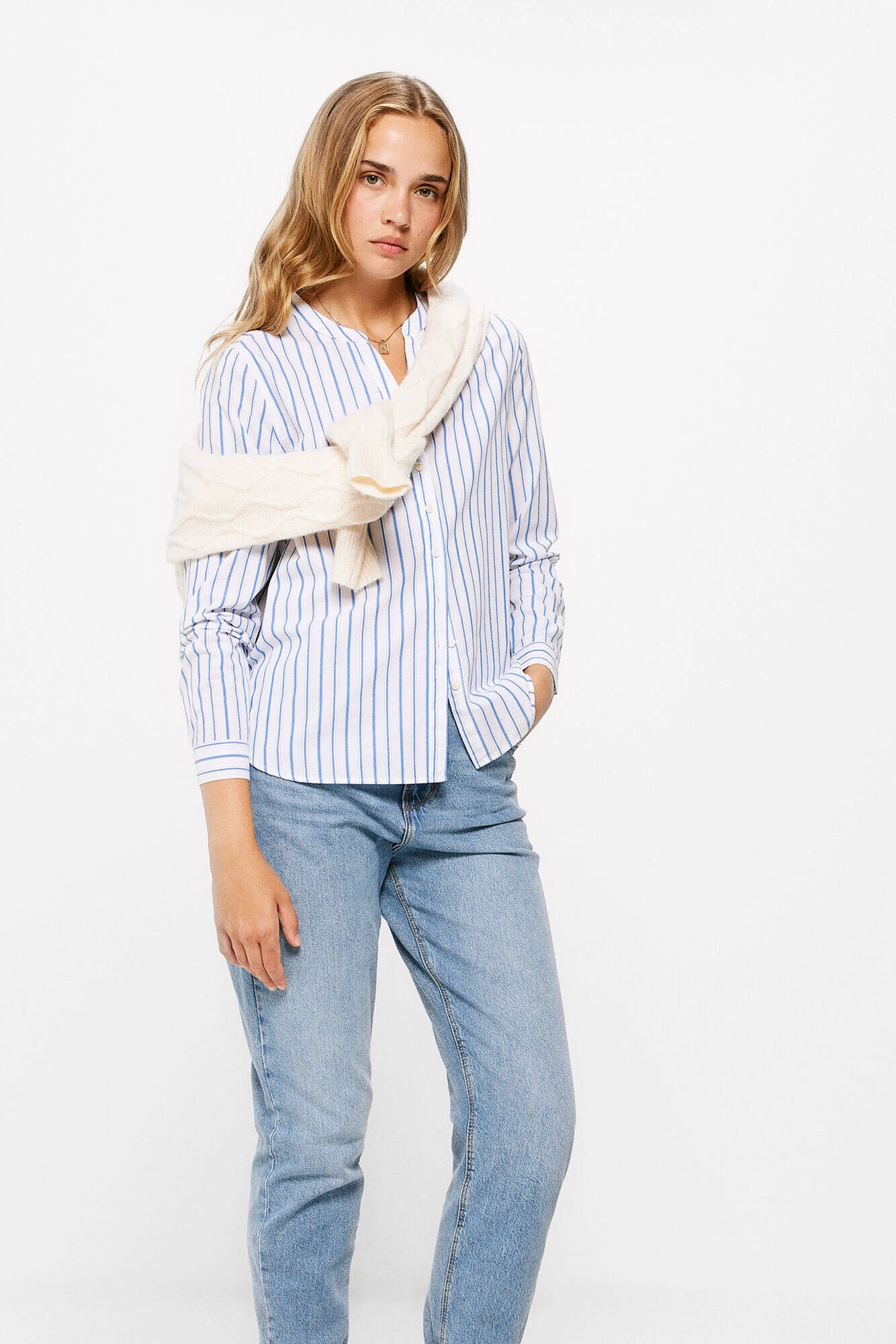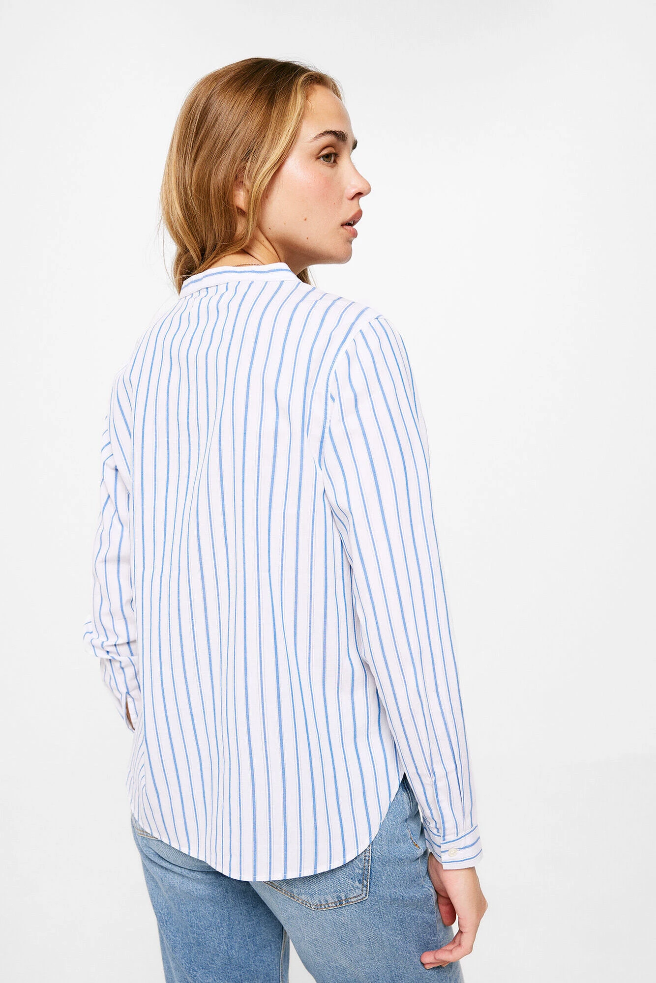 Blusa de manga larga, con cuello mao con abertura en uve, con botones en el delantero y en los puños, con rayas verticales.