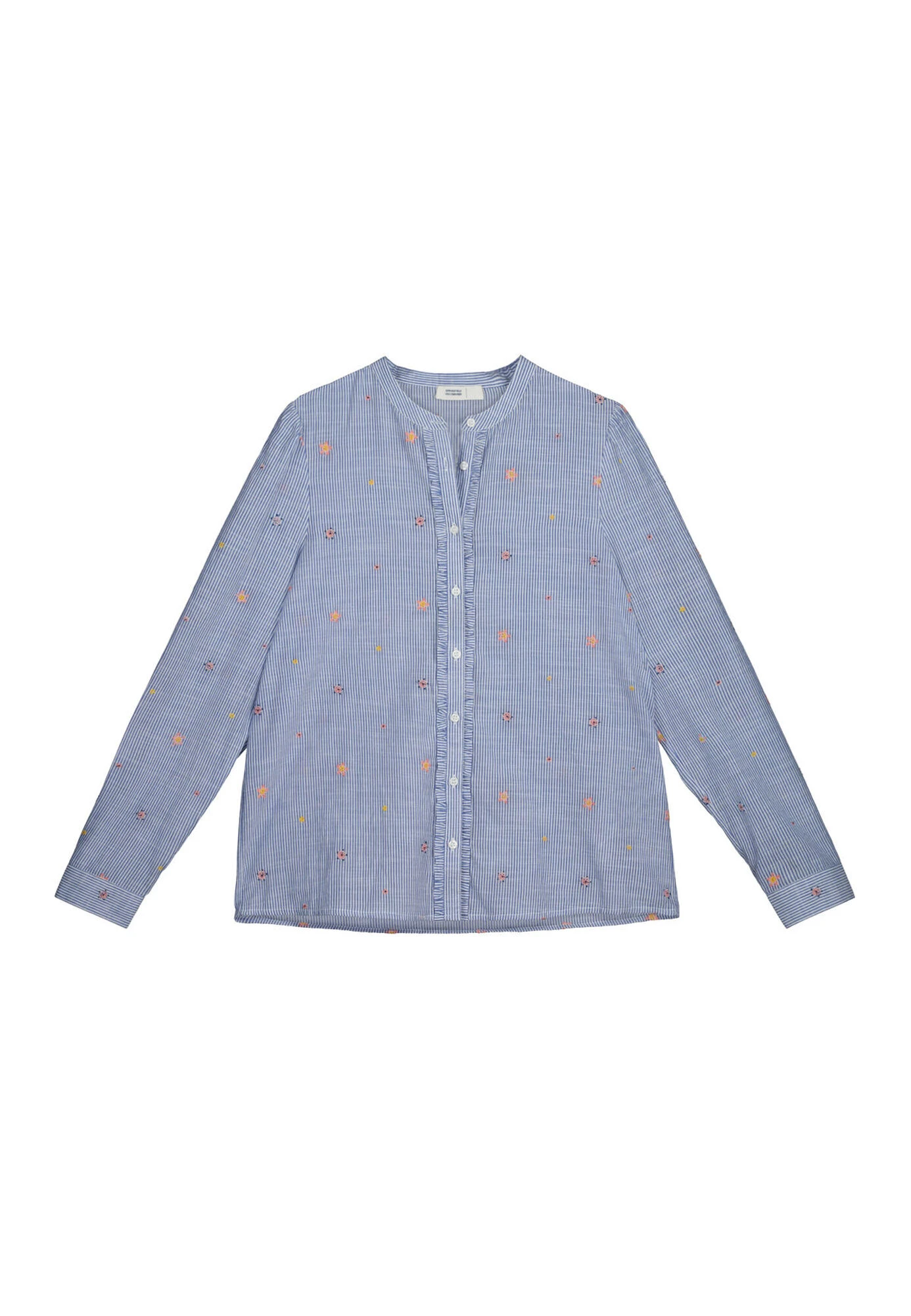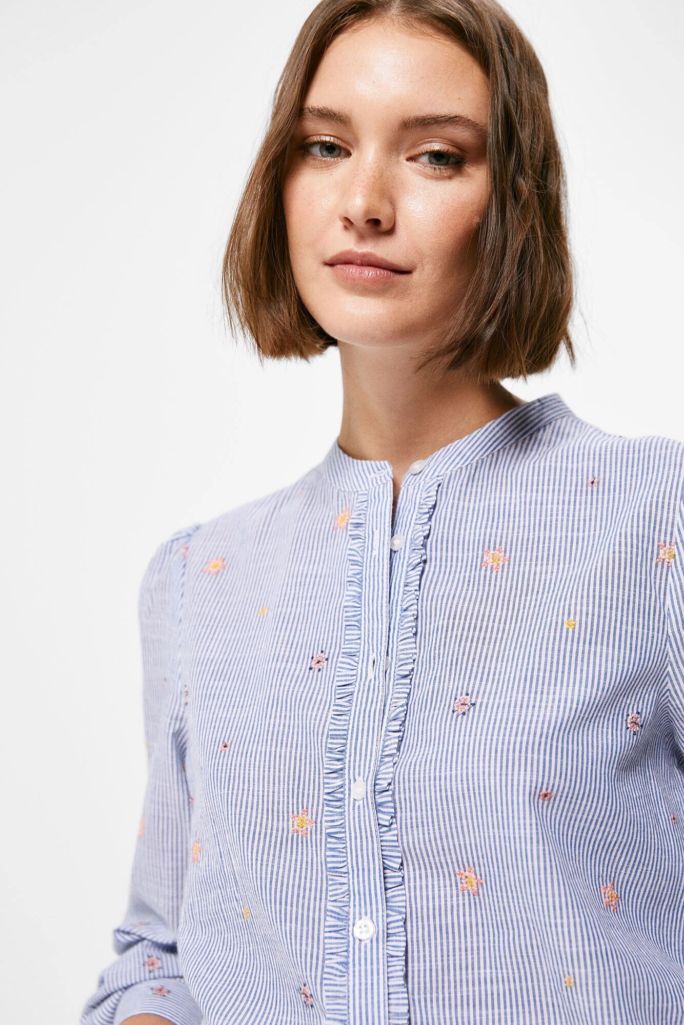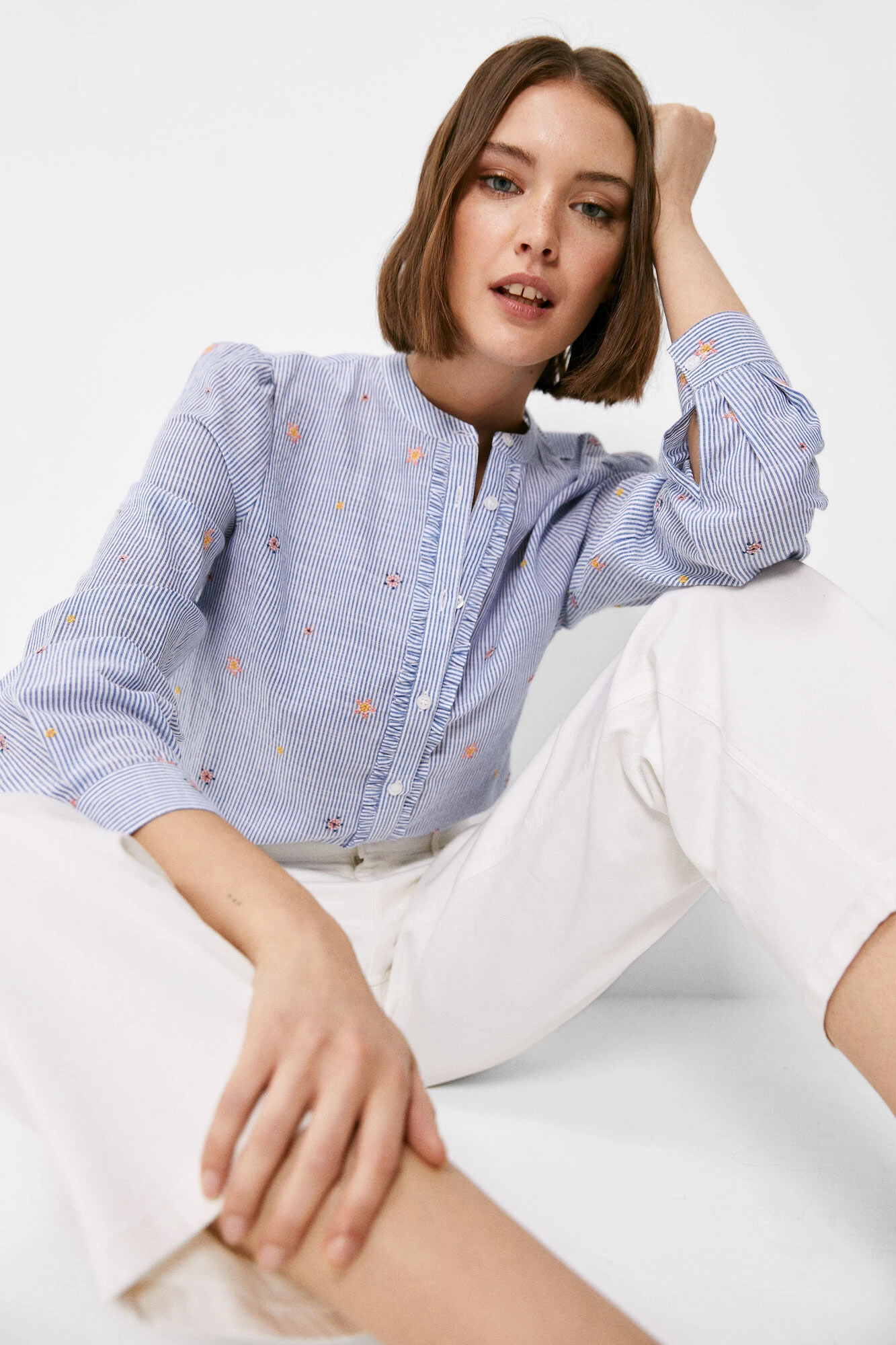 Blusa de manga larga, con cuello mao, con botones en el delantero con tapeta con mini volantes, con rayas y flores.