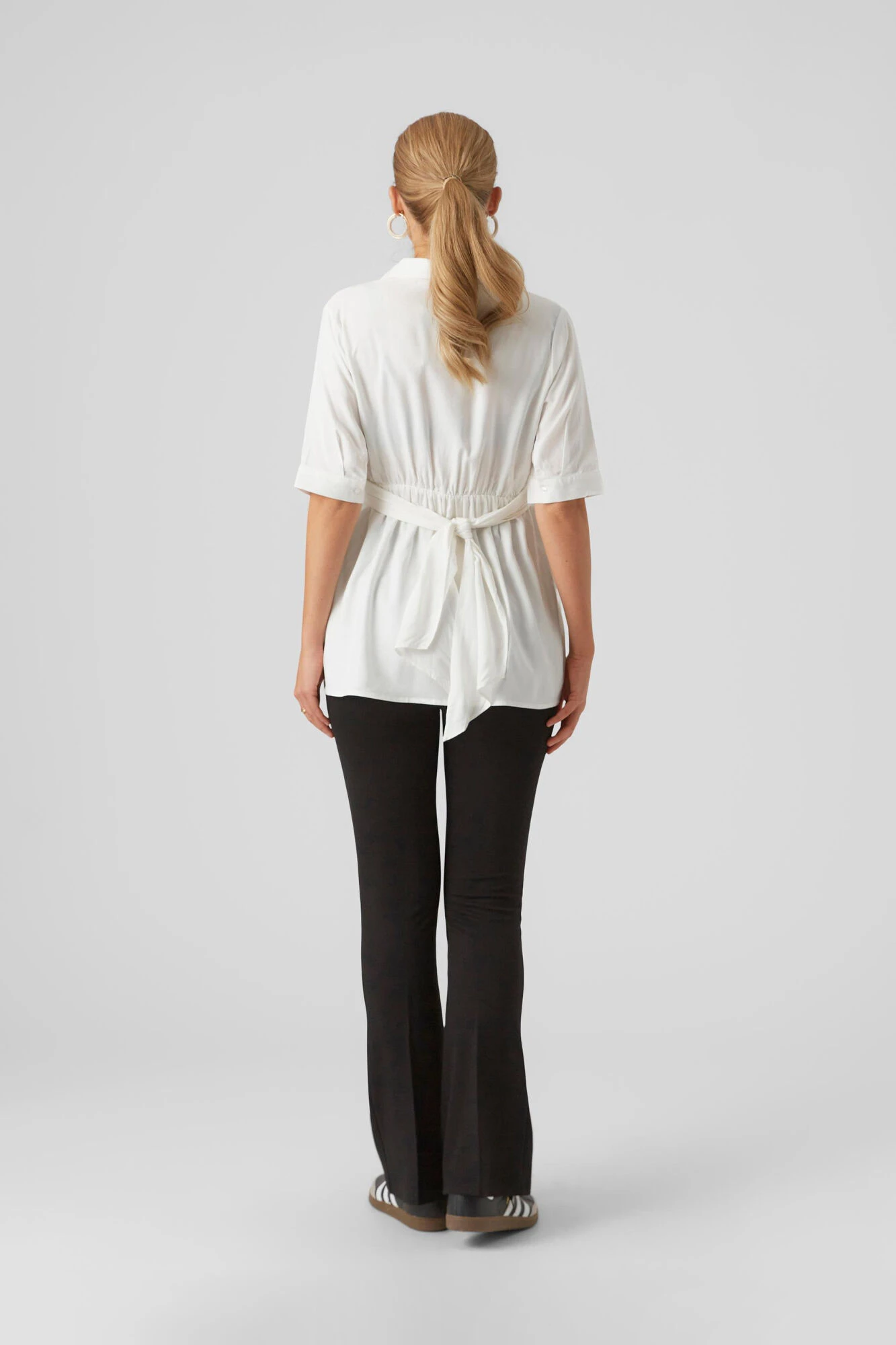 Camisa manga 2/4 y cuello pico, cruzado de solapa. Detalle de elástico en la espalda y cinturón cruzado ajustable.