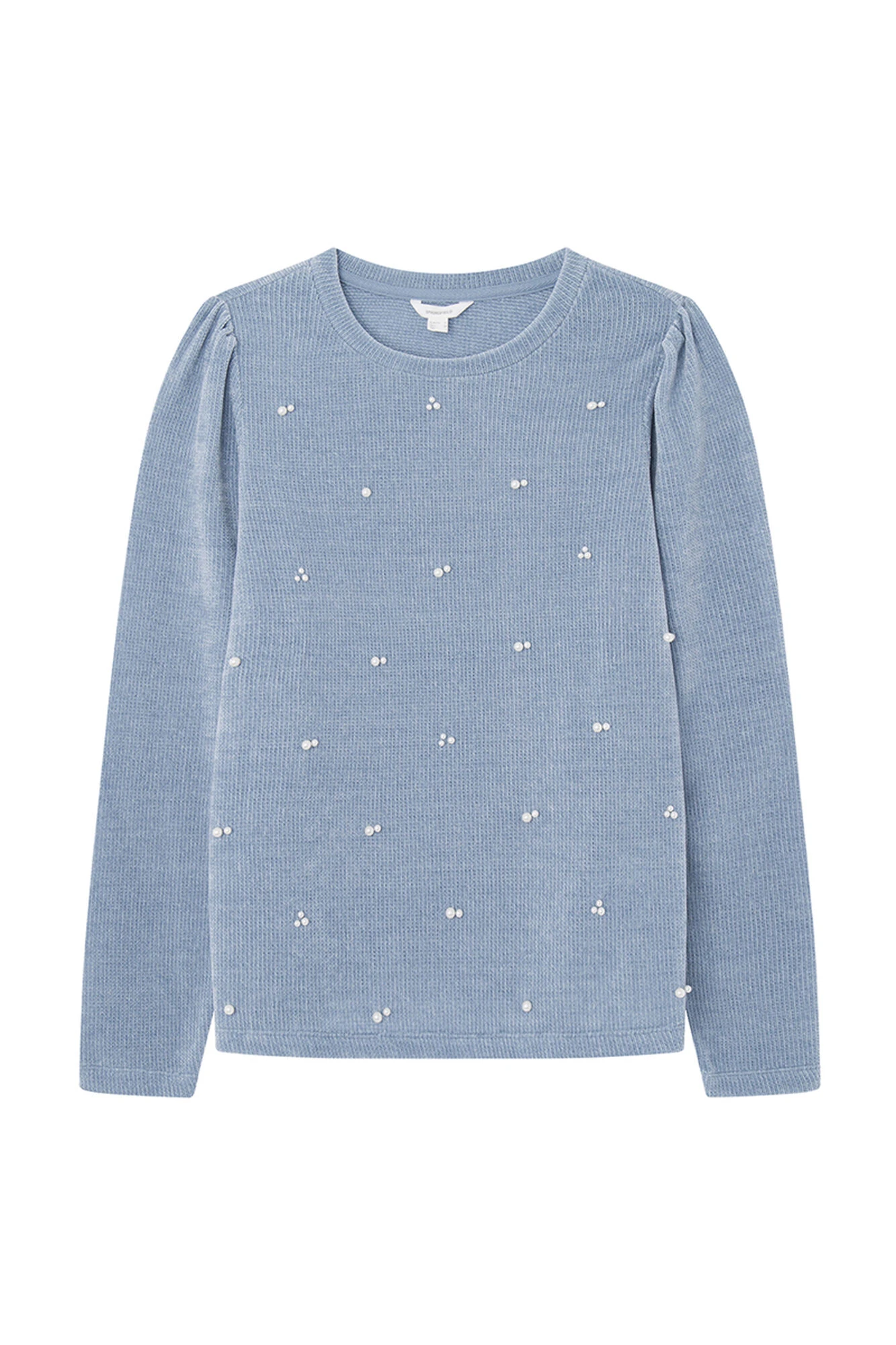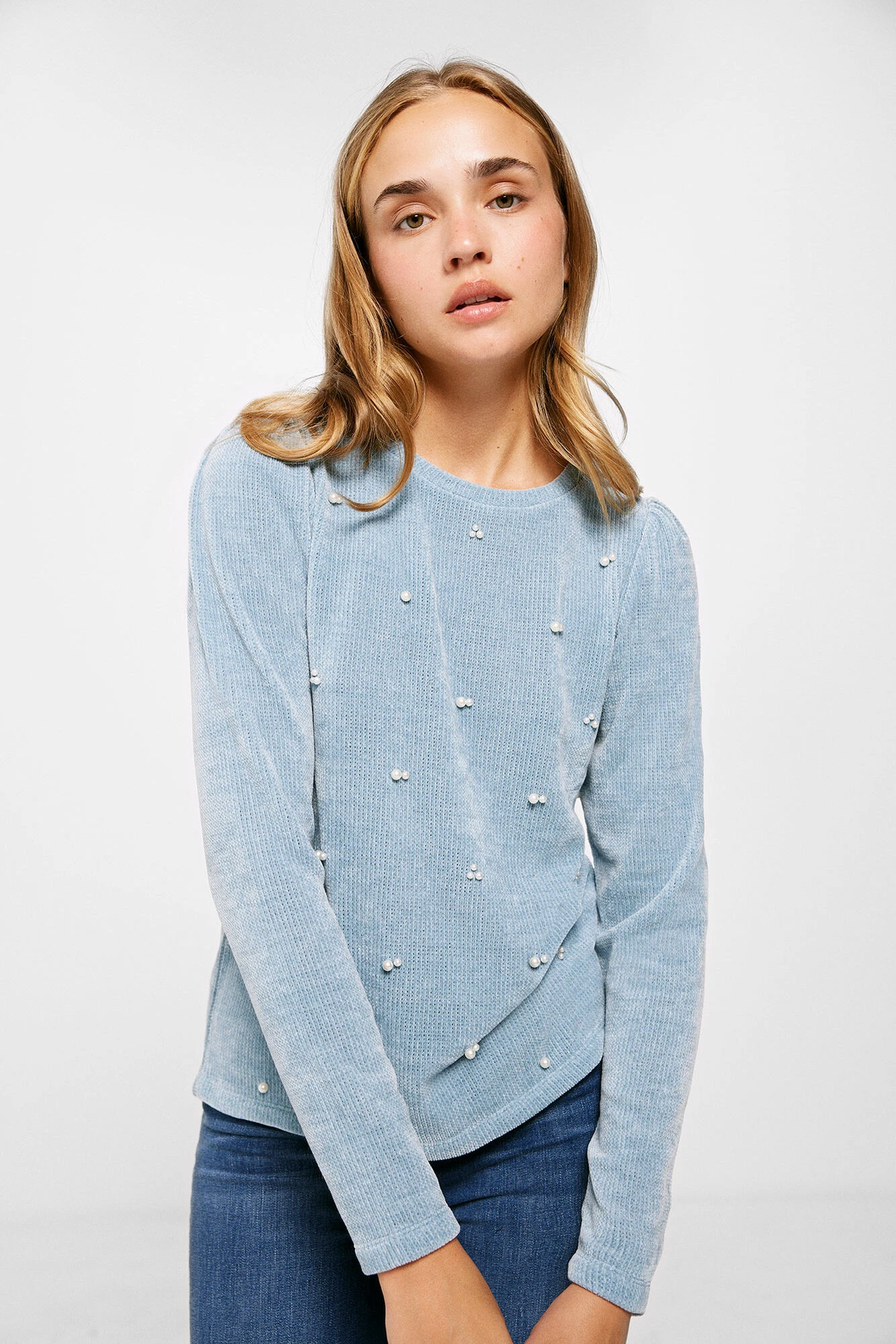 Camiseta de manga larga, con cuello redondo, con frunces en los hombros y con detalle de perlas en el delantero.