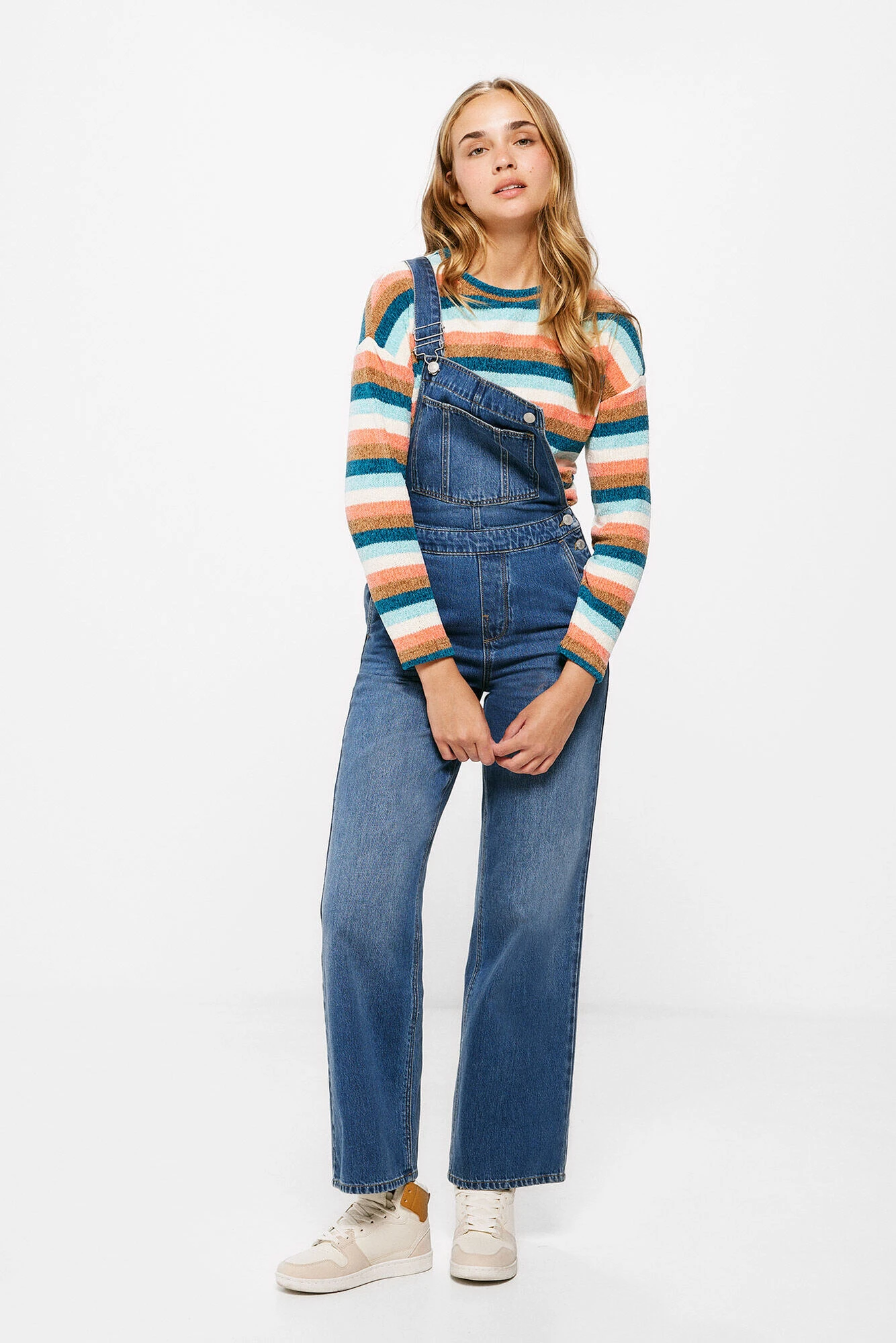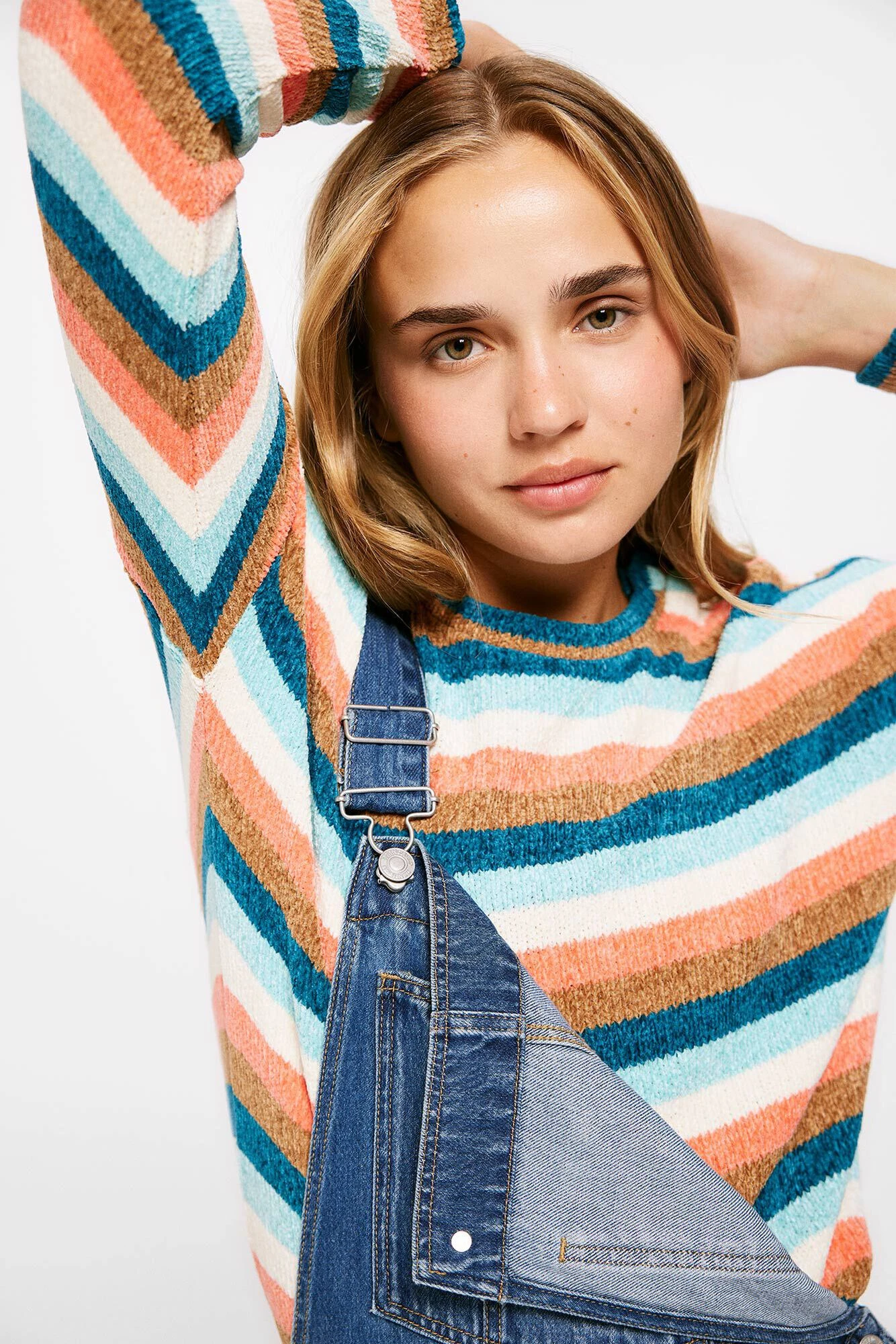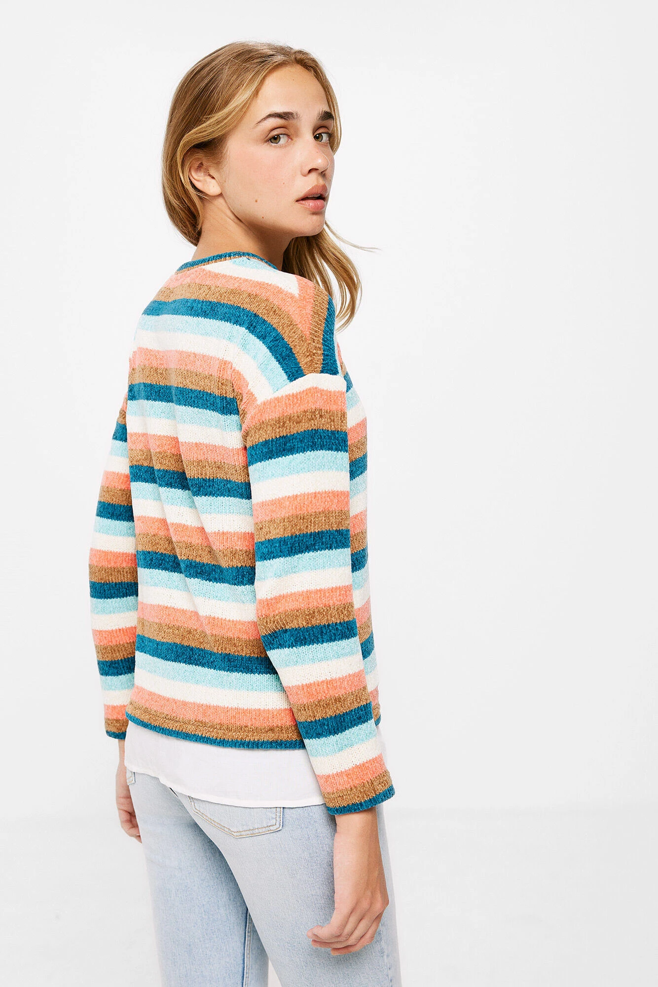 Camiseta de manga larga caída, con cuello redondo, con detalle de botones forrados en el hombro, con rayas horizontales multicolor.