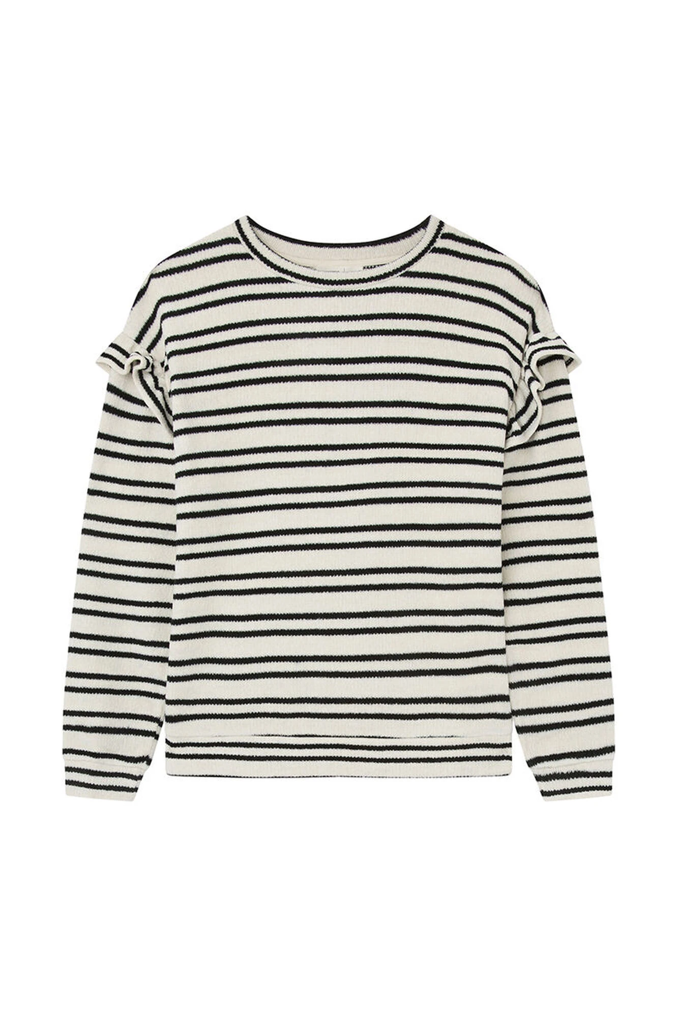 Camiseta de manga larga caĂda con volumen, con cuello redondo, con detalle de volante en las mangas y con raya doble horizontal.