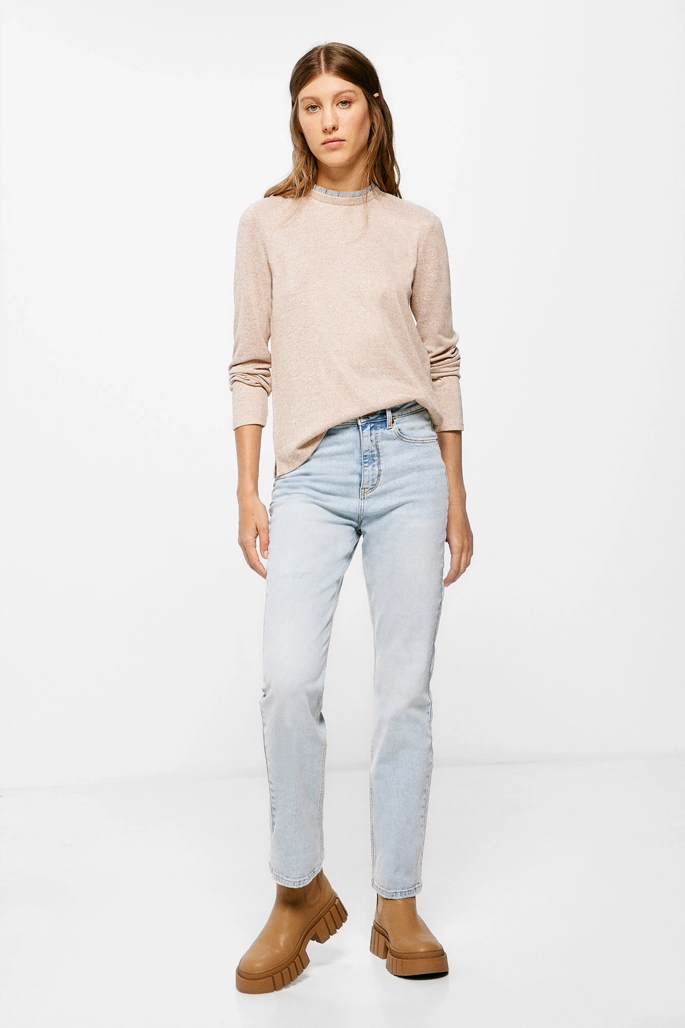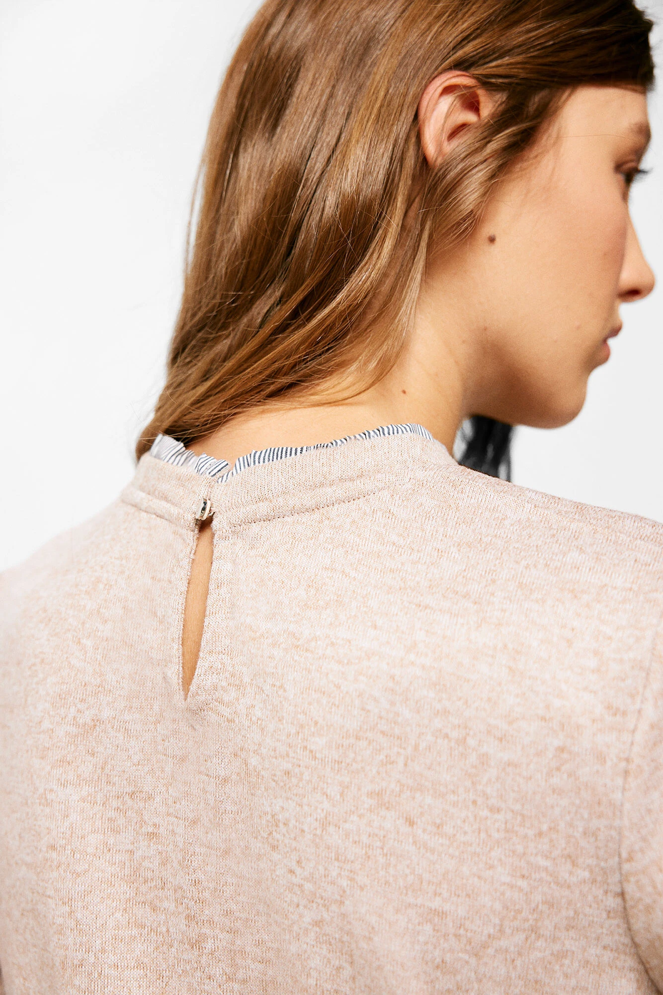 Camiseta lisa de manga larga, con cuello redondo con detalle de mini volantes, con abertura en la espalda en forma de lágrima con cierre de botĂłn, de punto cort … ado con tacto suave.