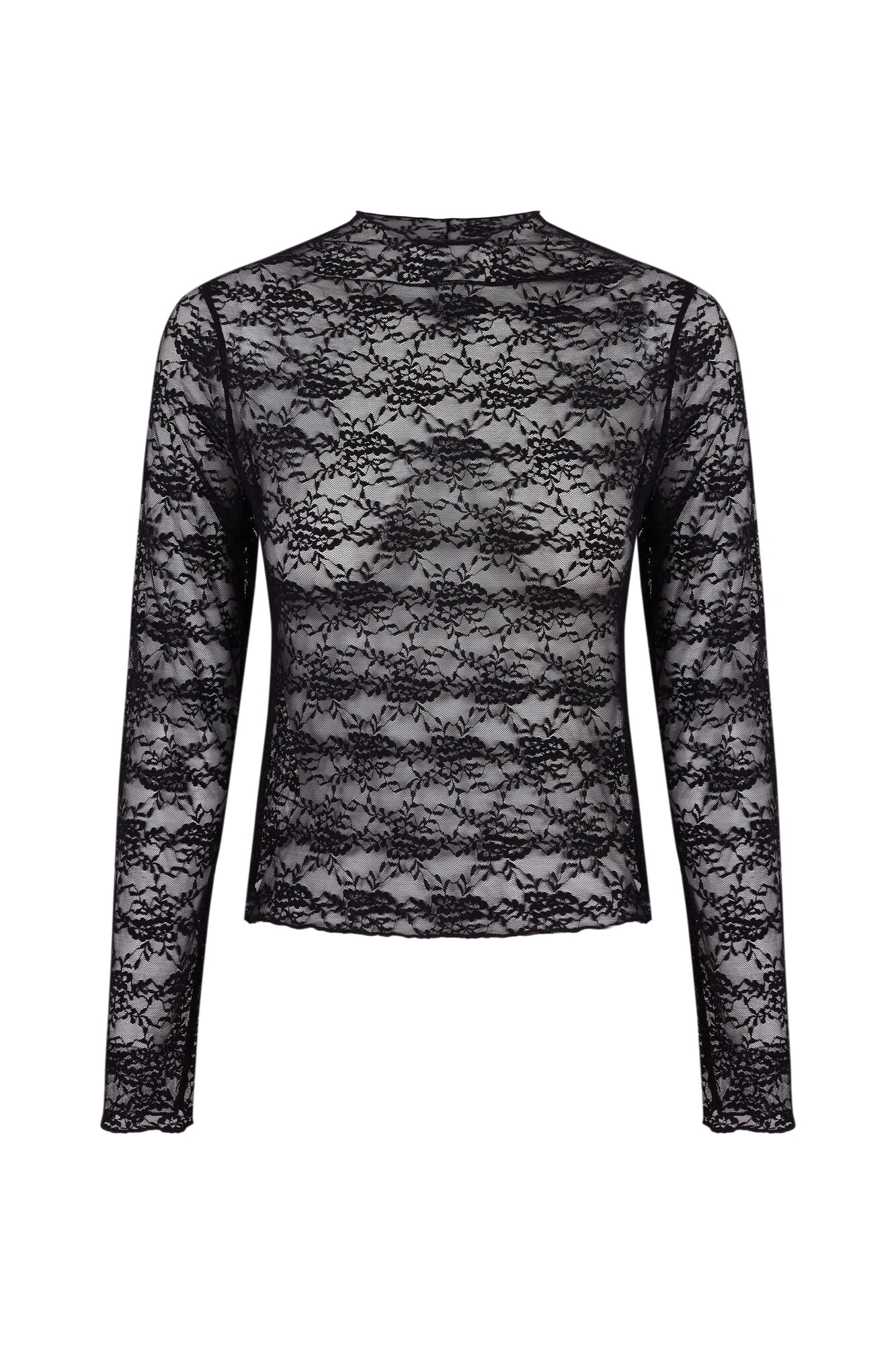 Camiseta de manga larga confeccionada con tejido de encaje. En elegante color negro, úsalo como prenda de ropa interior o deja que se vea y lúcela en tus looks … más festivos.