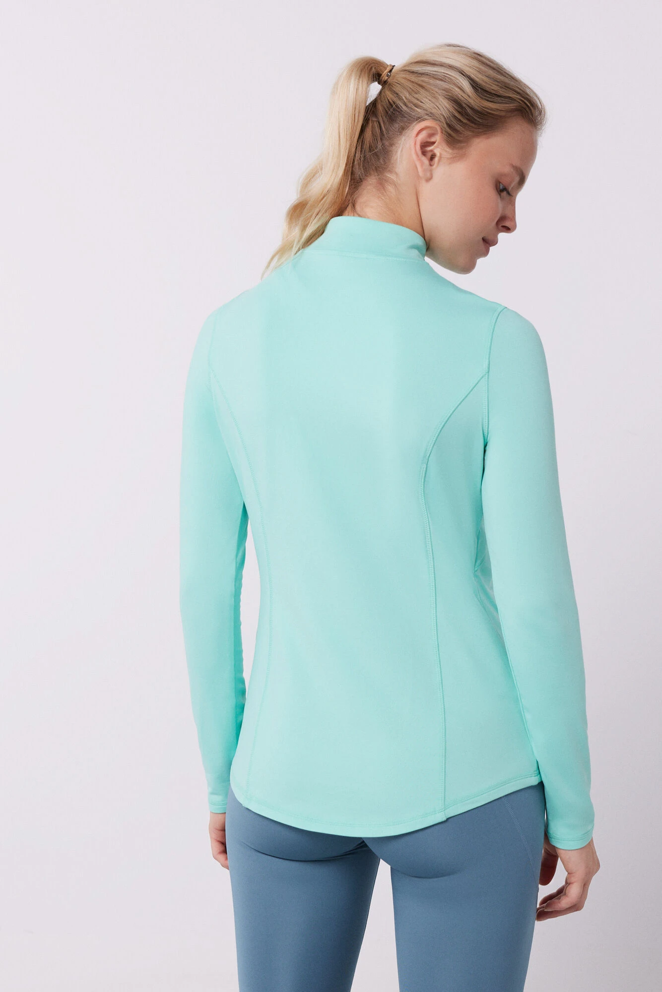 – Camiseta de manga larga, cuello alto con cremallera y talle ajustado de color azul turquesa. Además, es ligeramente más larga por la parte trasera y está … perchada en su cara interior.