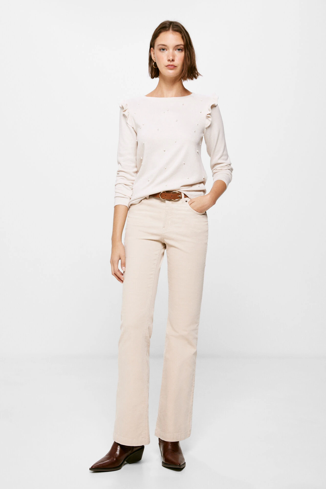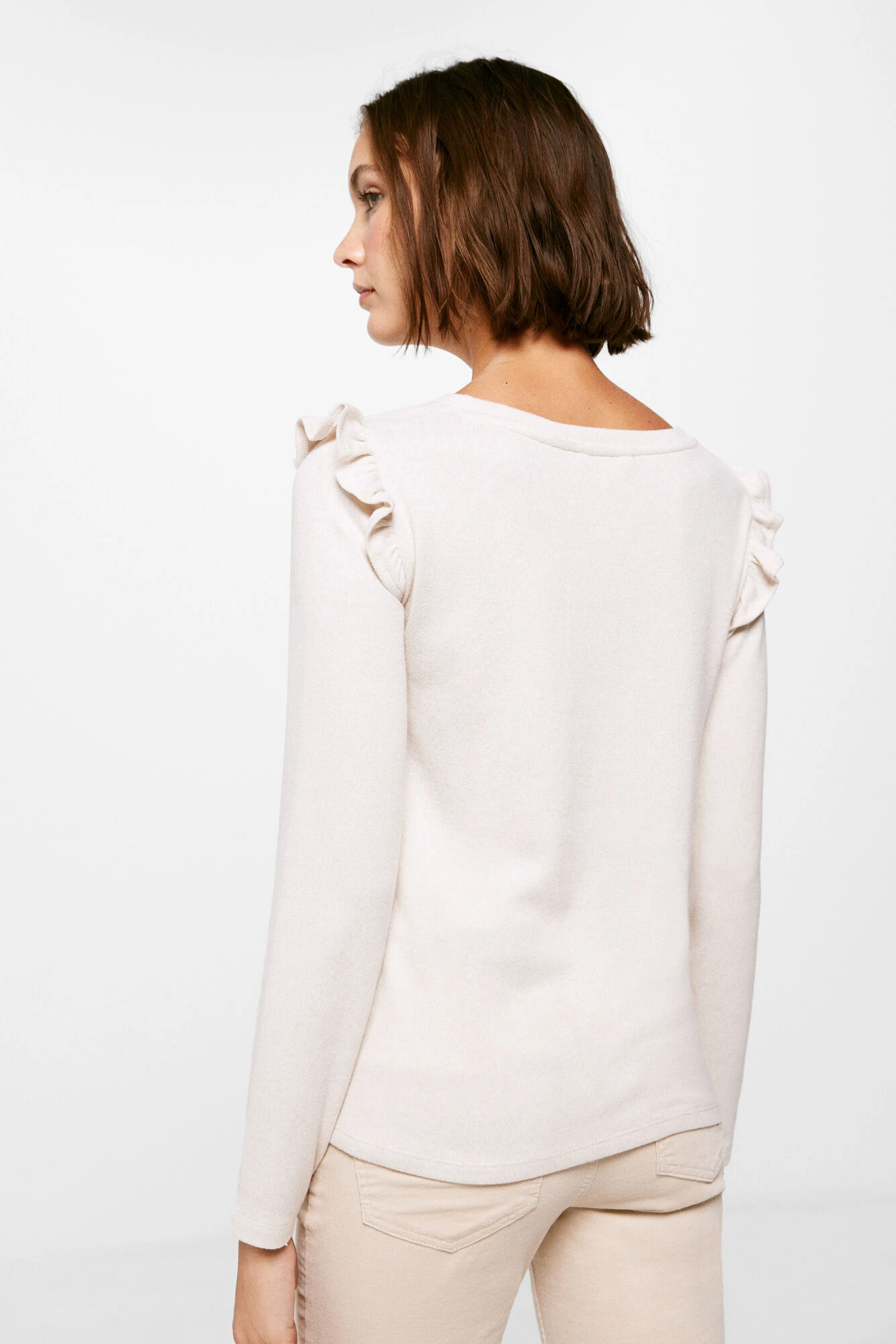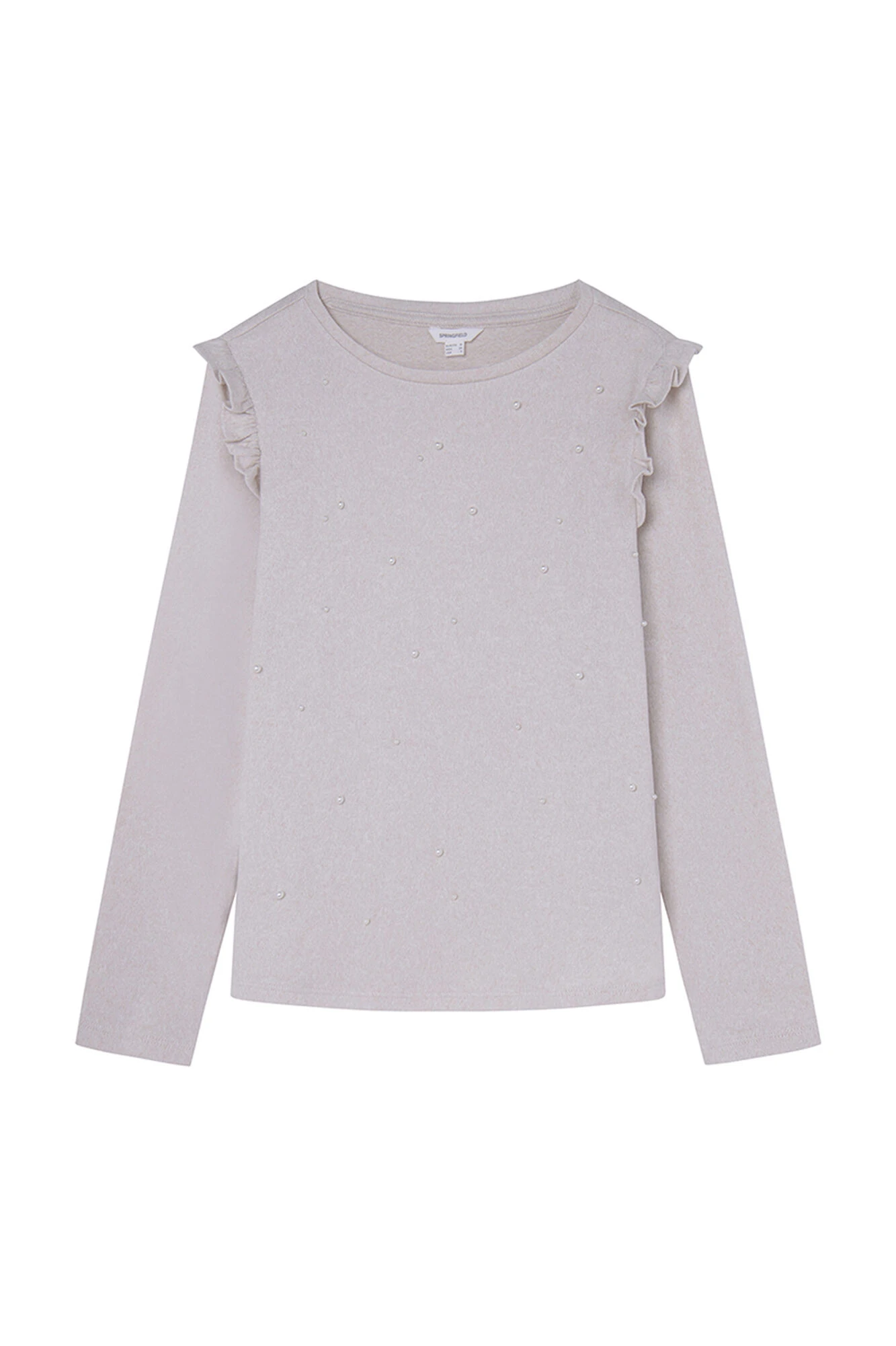 Camiseta de manga larga, con cuello redondo, con volantes en los hombros y con detalle de perlas en el delanteo.