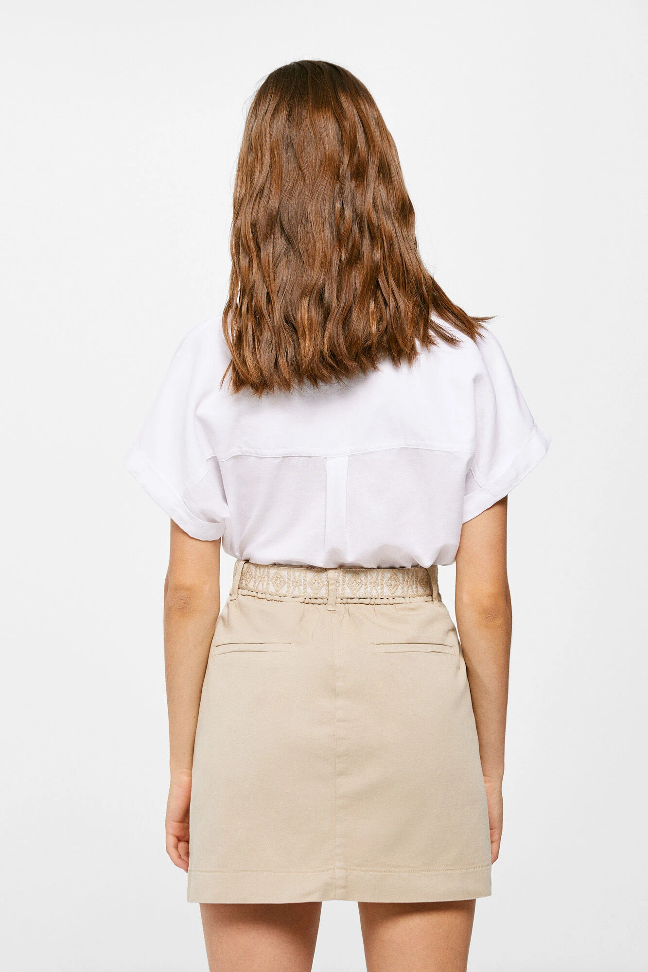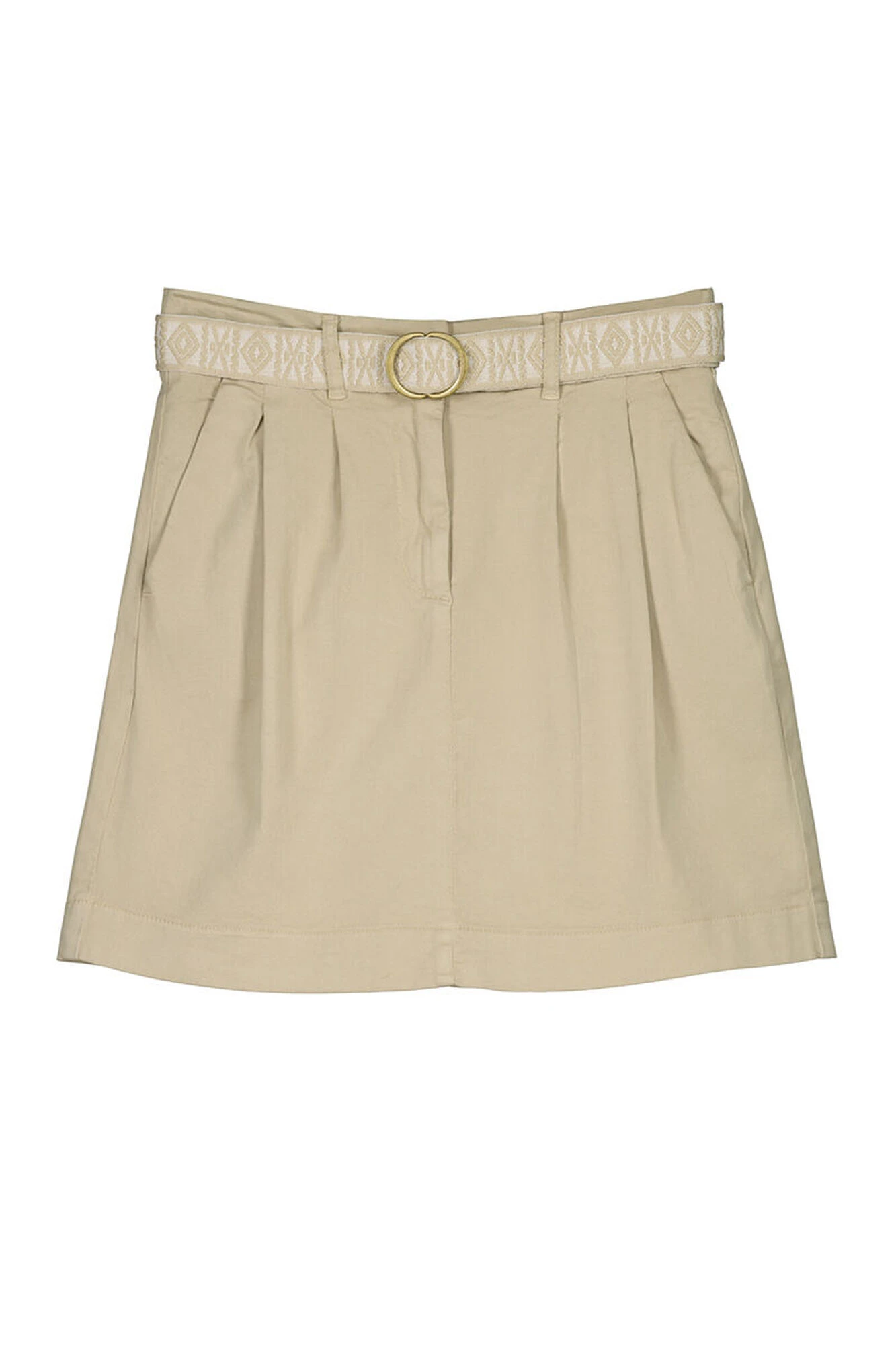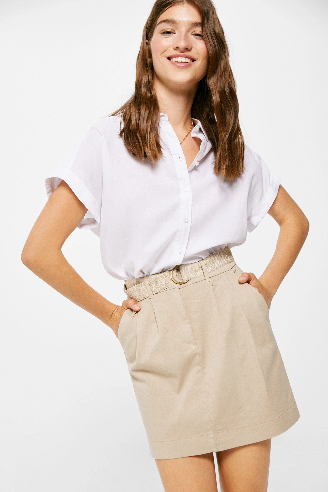Falda corta estilo chino, con bolsillos en los laterales, con dos bolsillos falsos de vivos en la parte trasera, con goma en la espalda con cierre de botón y cr … emallera, con detalle de pliegues en el delantero.