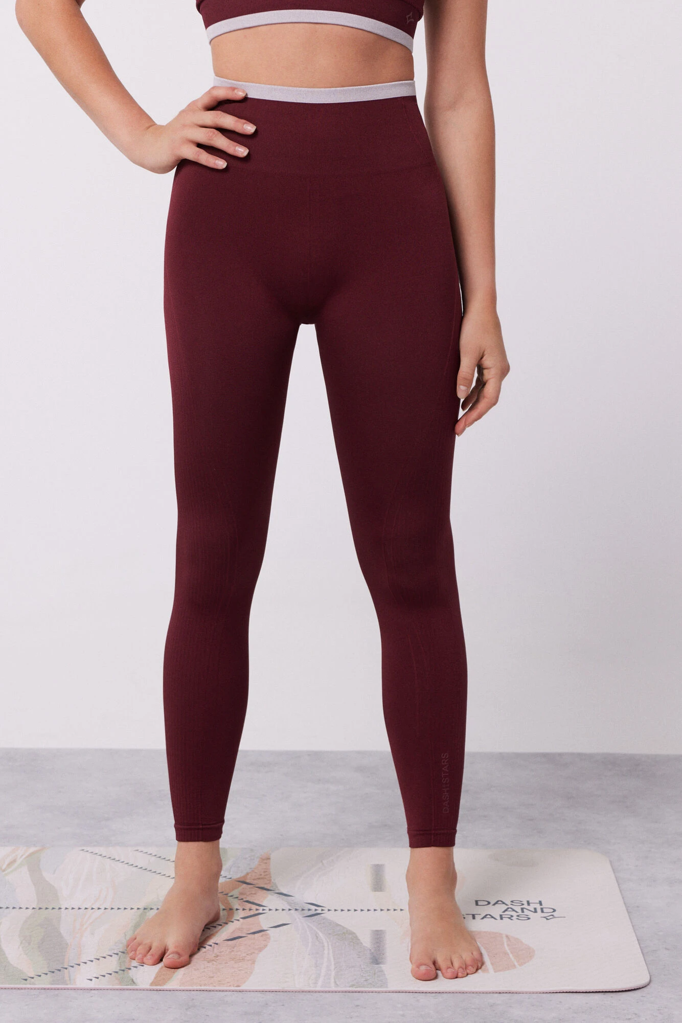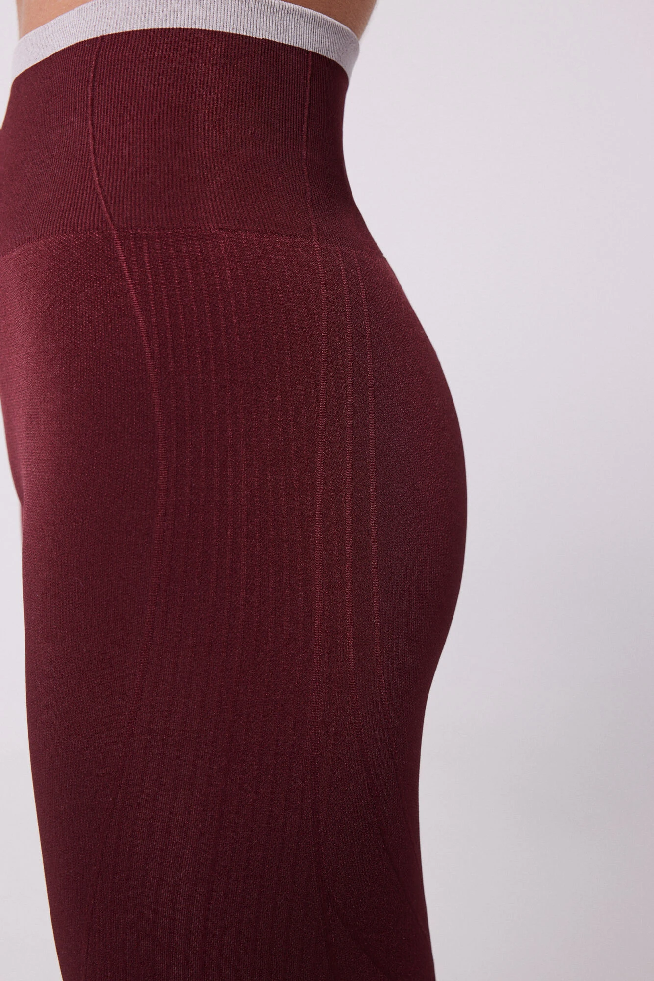 – Leggings SEAMLESS COMFORT de largo tobillero y cintura alta en un bonito color granate con cinturilla a contraste. Diseño con textura en los laterales y b … rillo en la hilatura.