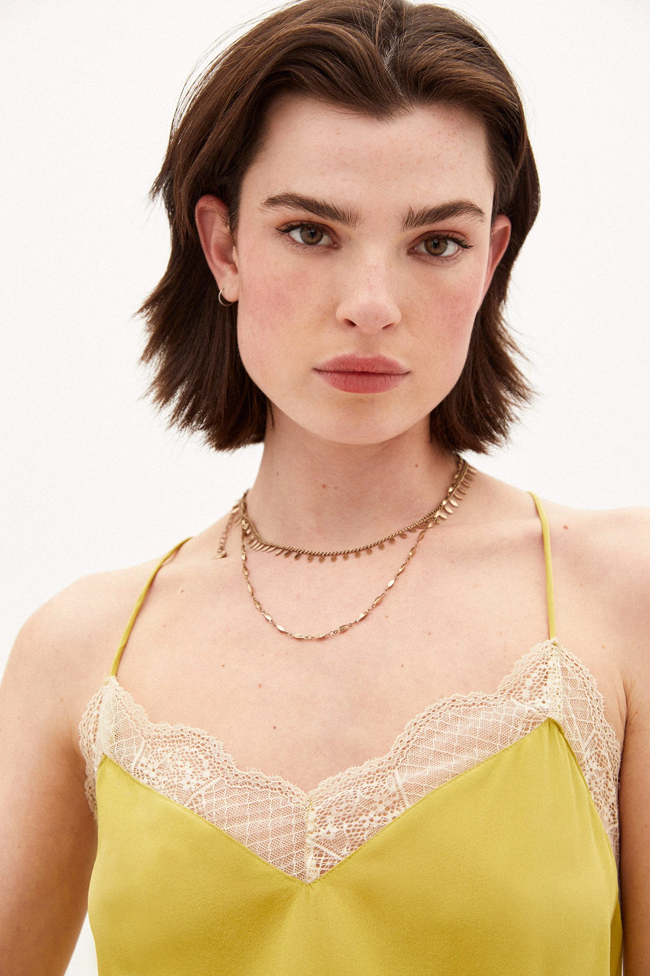 El glamuroso top MARCELA de Hoss Intropia destaca por su feminidad. Te encantará por su escote en V y por su delicado trabajo de encaje. Está confeccionado en u … n material de seda, fluido y ligeramente brillante. Pero el detalle que atrae definitivamente las miradas son sus tirantes finos de material satinado, que destacan sobre la piel y se juntan por detrás para sostener a la perfección. Un top de lo más sensual.- Top de tirantes finos- Cuello en V- 100% seda- TALLA: Este artículo talla normal, elige tu talla habitual