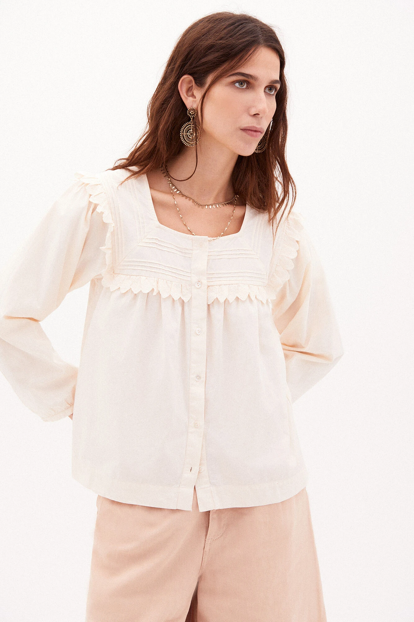 La blusa MARTINA de Hoss Intropia se distingue por su espíritu femenino y delicado. Combina un escote cuadrado con pequeños pliegues y volantes y unas mangas la … rgas con frunces en los hombros. Está confeccionada en un algodón, agradable y ligero. Una blusa vintage refinada, perfecta en contraste con una prenda vaquera.- Blusa romántica en algodón- Escote cuadrado- Manga larga