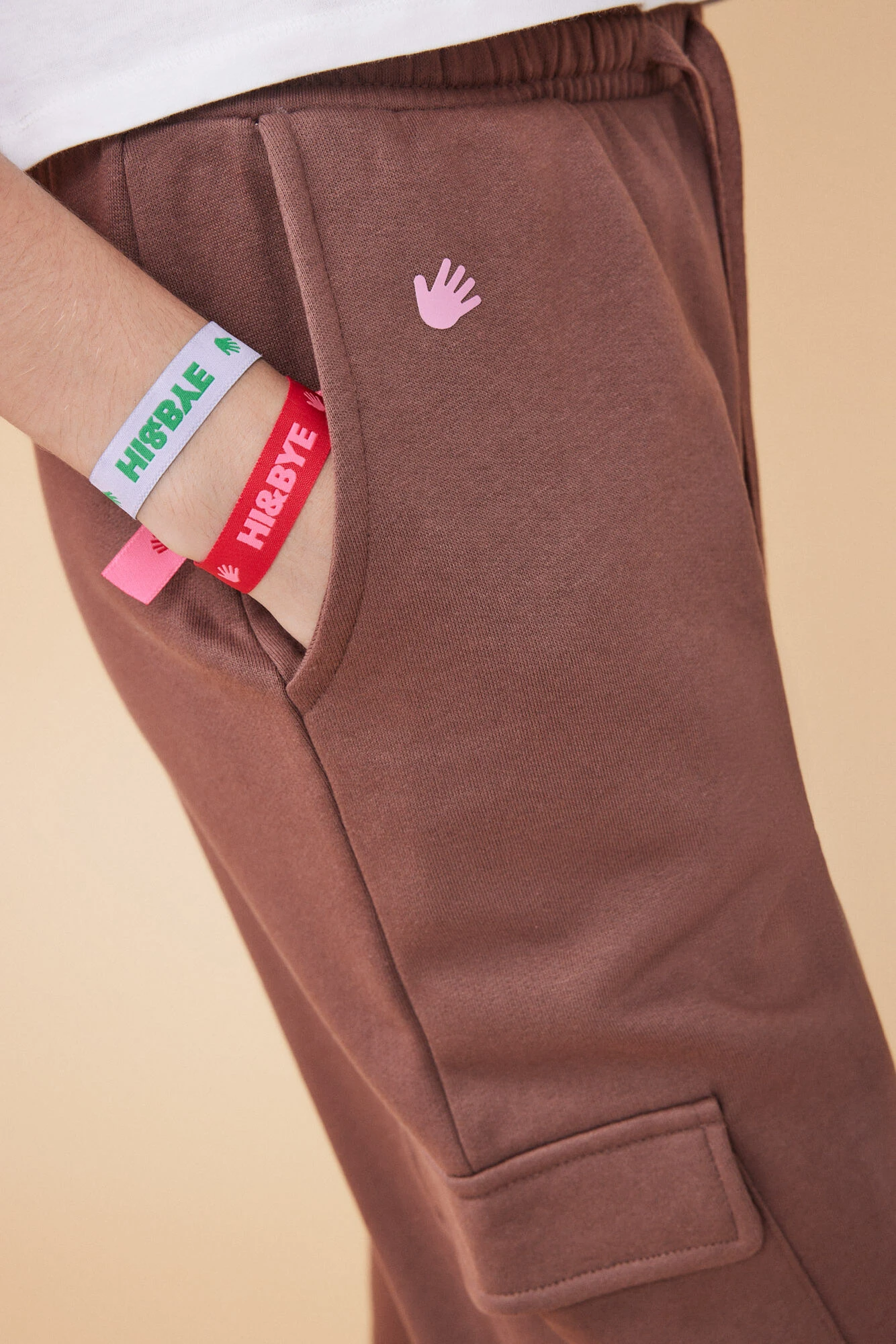 Pantalón jogger largo tipo cargo, de felpa, con goma en el bajo. De color marrón, confeccionado en algodón, con bolsillos laterales y bolsillos de plastrón con … tapeta y detalle de logo a contraste.