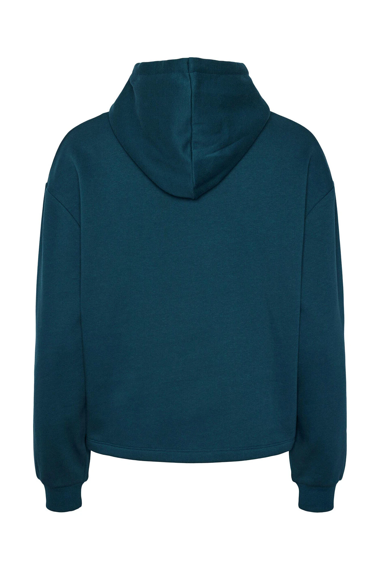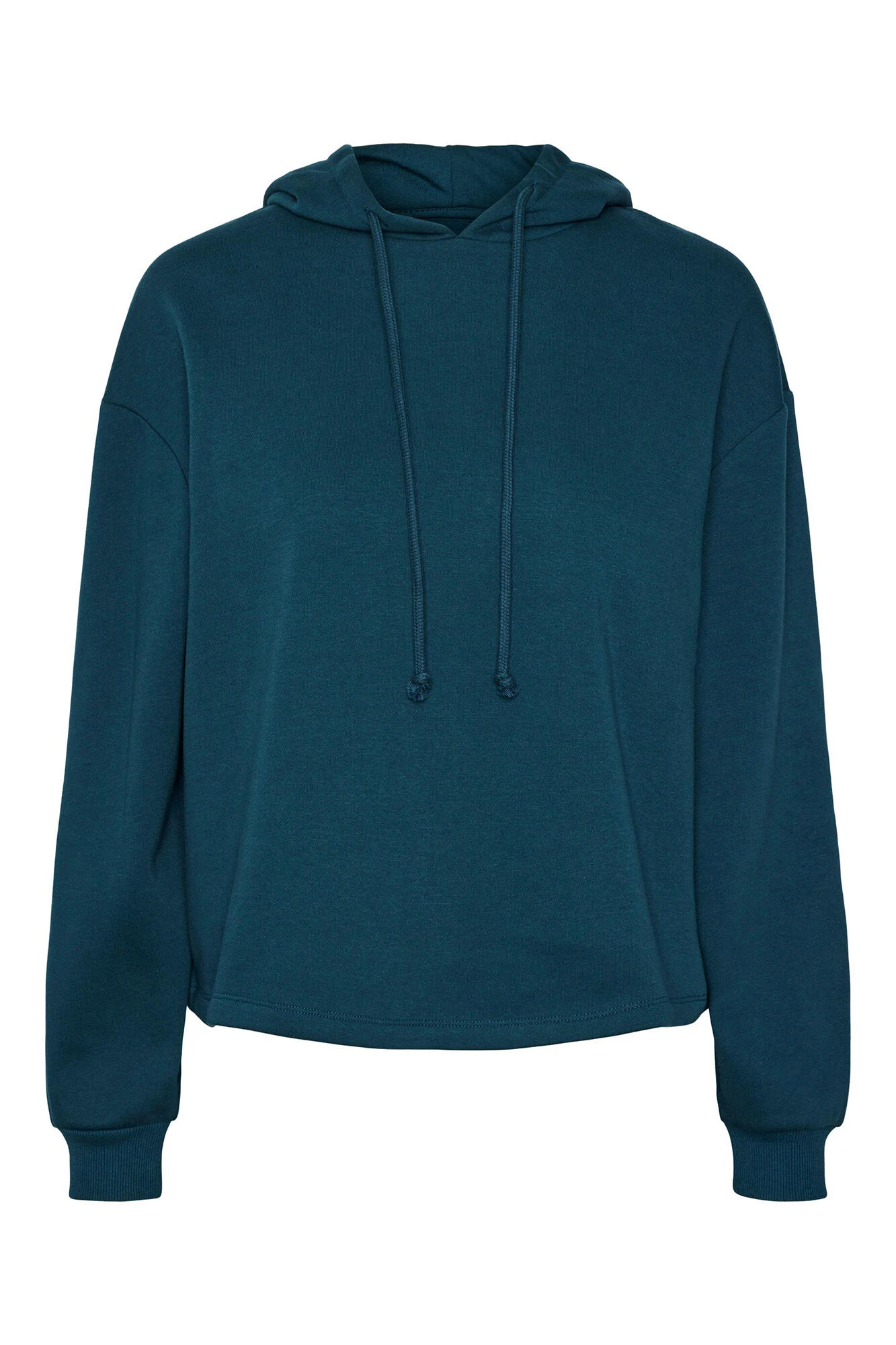 Sudera de manga larga, hombro caido y cuello redondo con capucha y cordones.