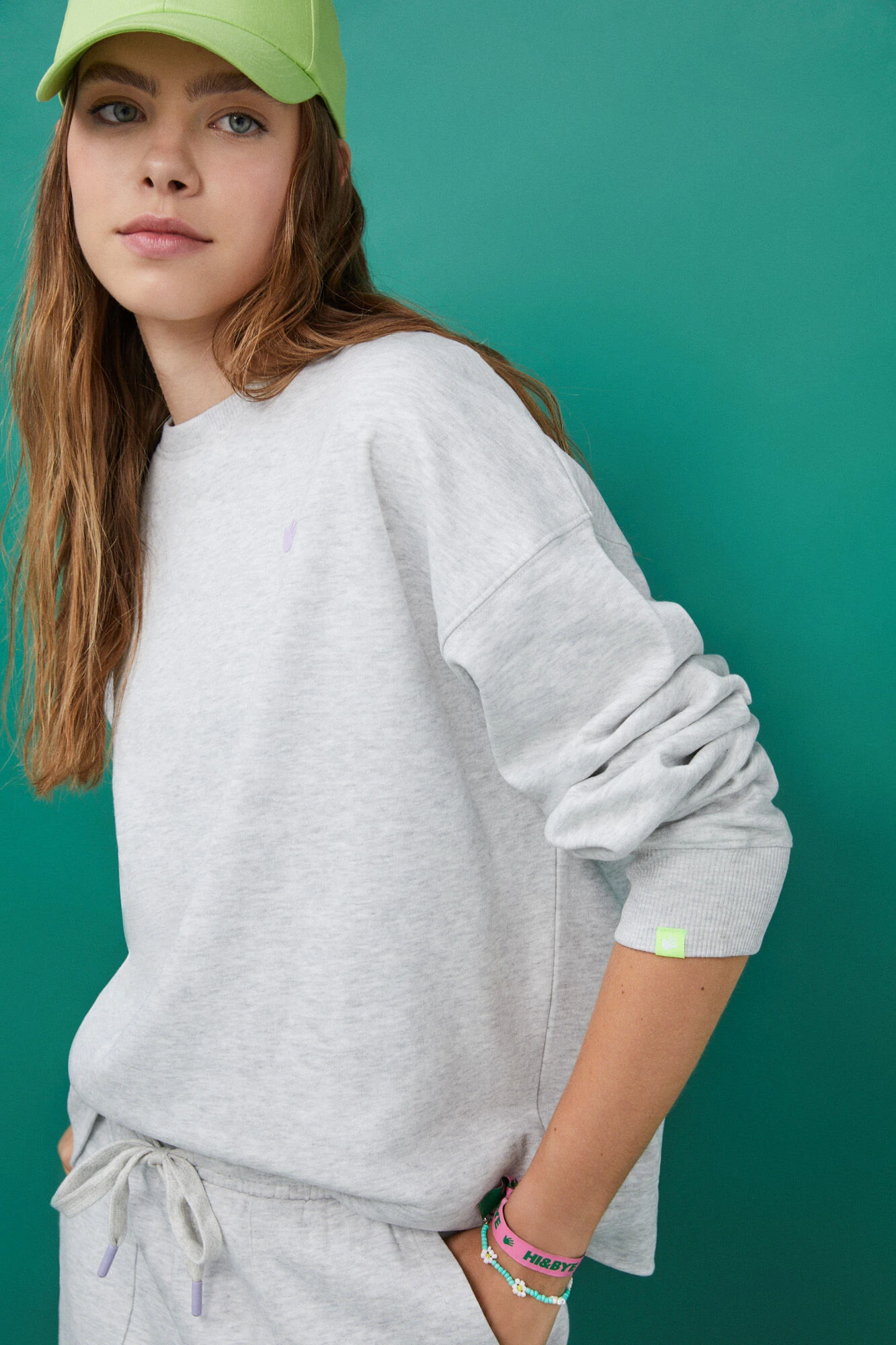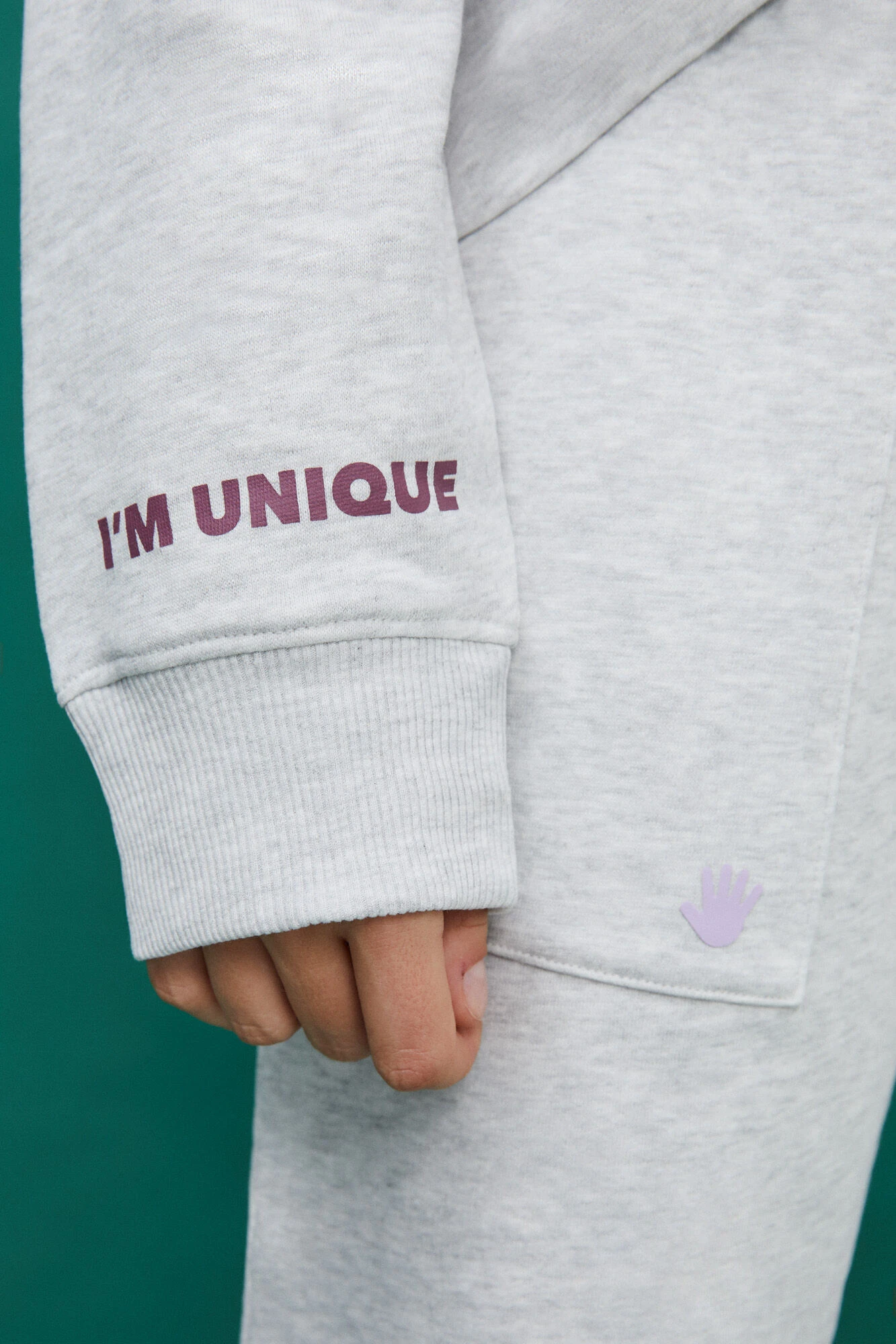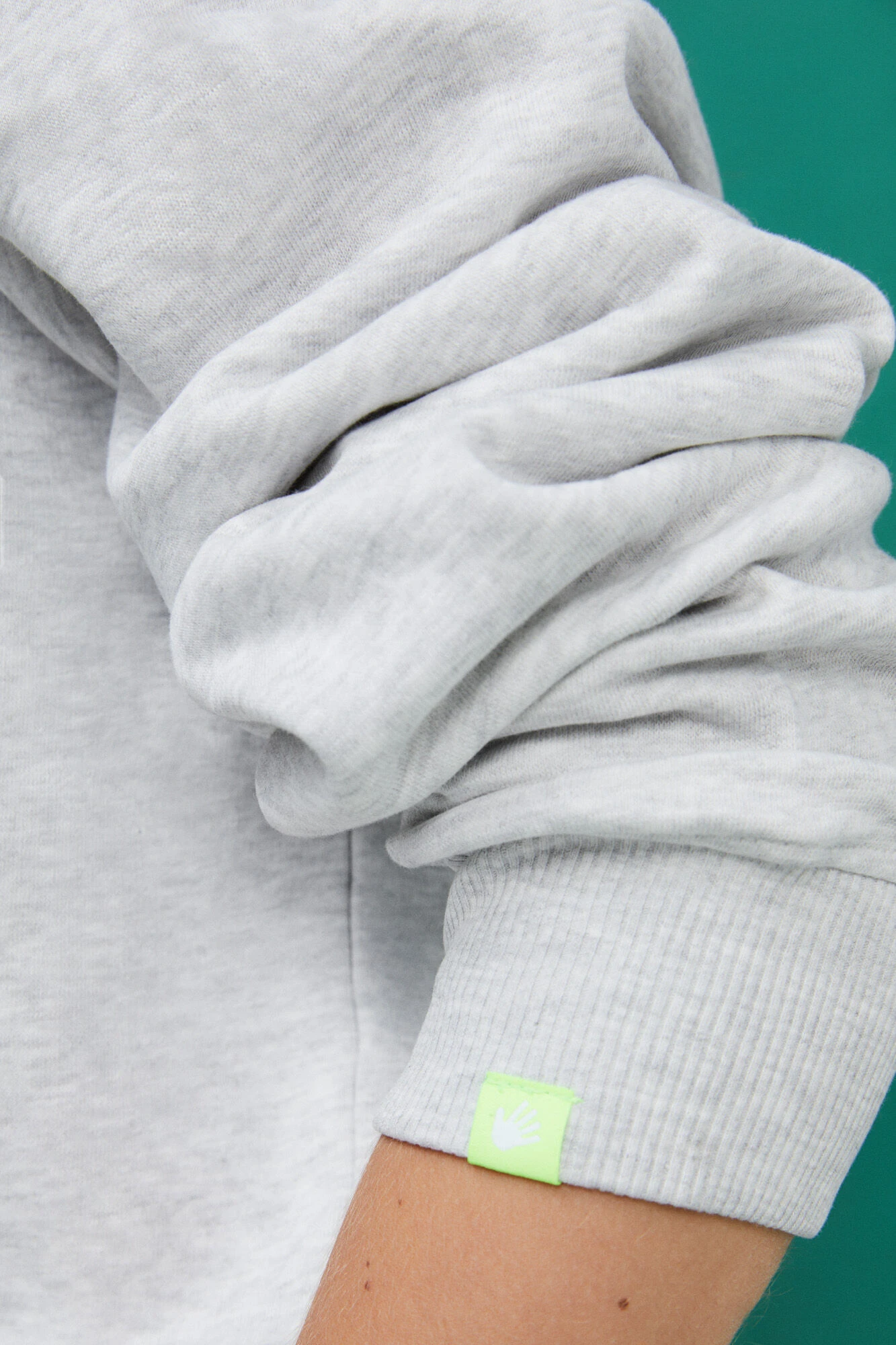 – Cuello y puños confeccionados en rib elástico de algodón. Detalle de costuras decorativas a tono y etiqueta flúor posicionada en el puño.