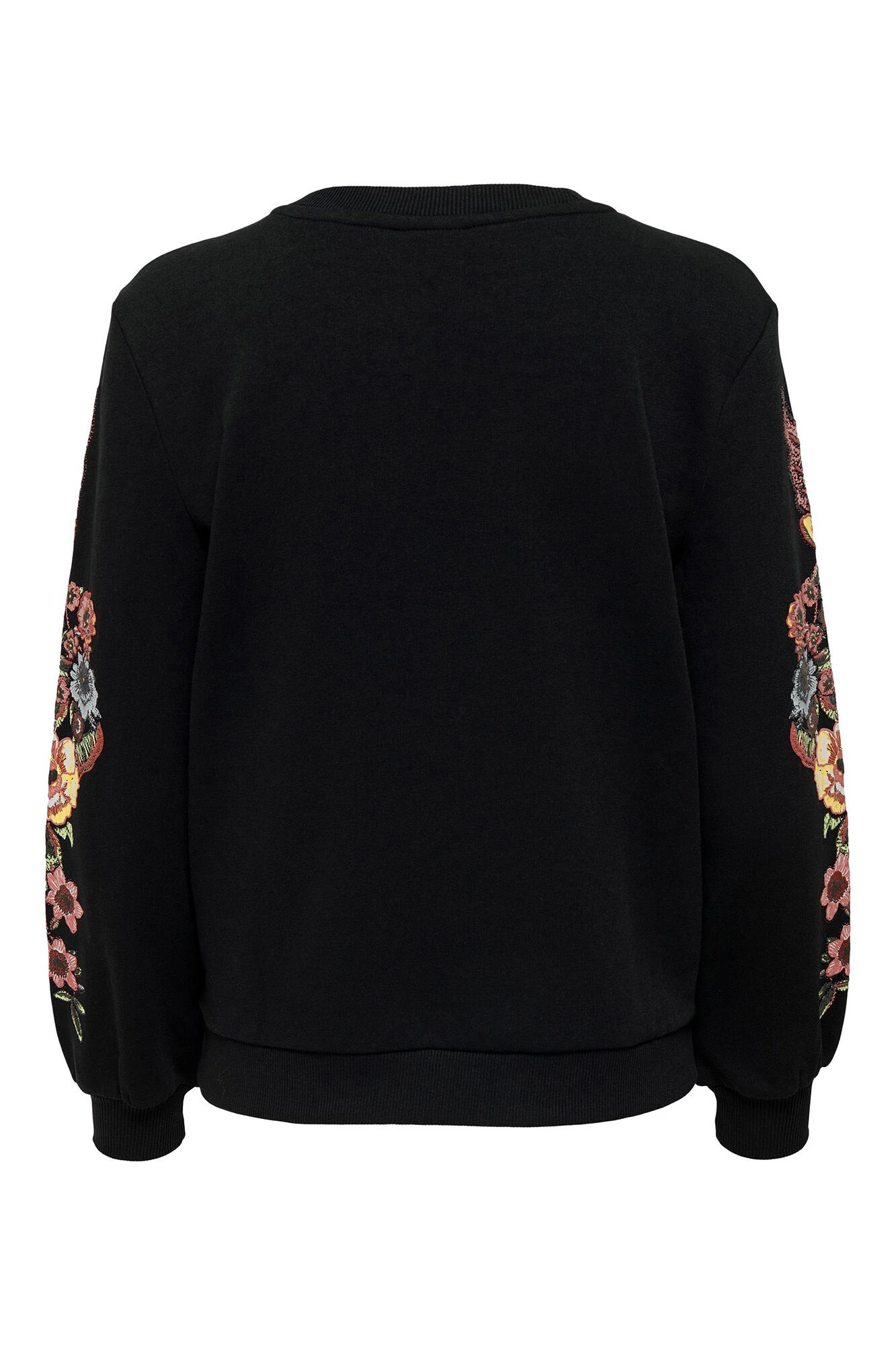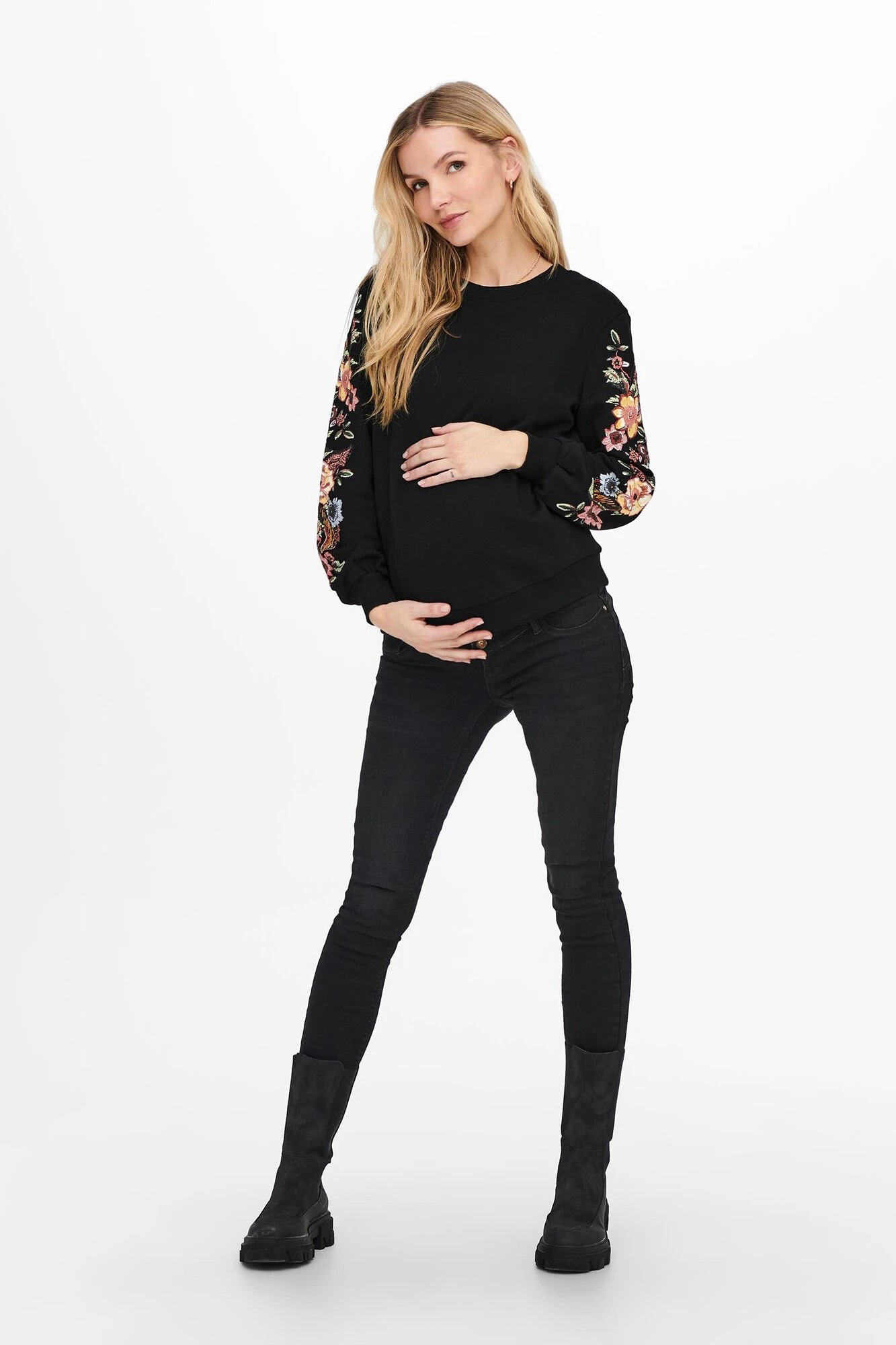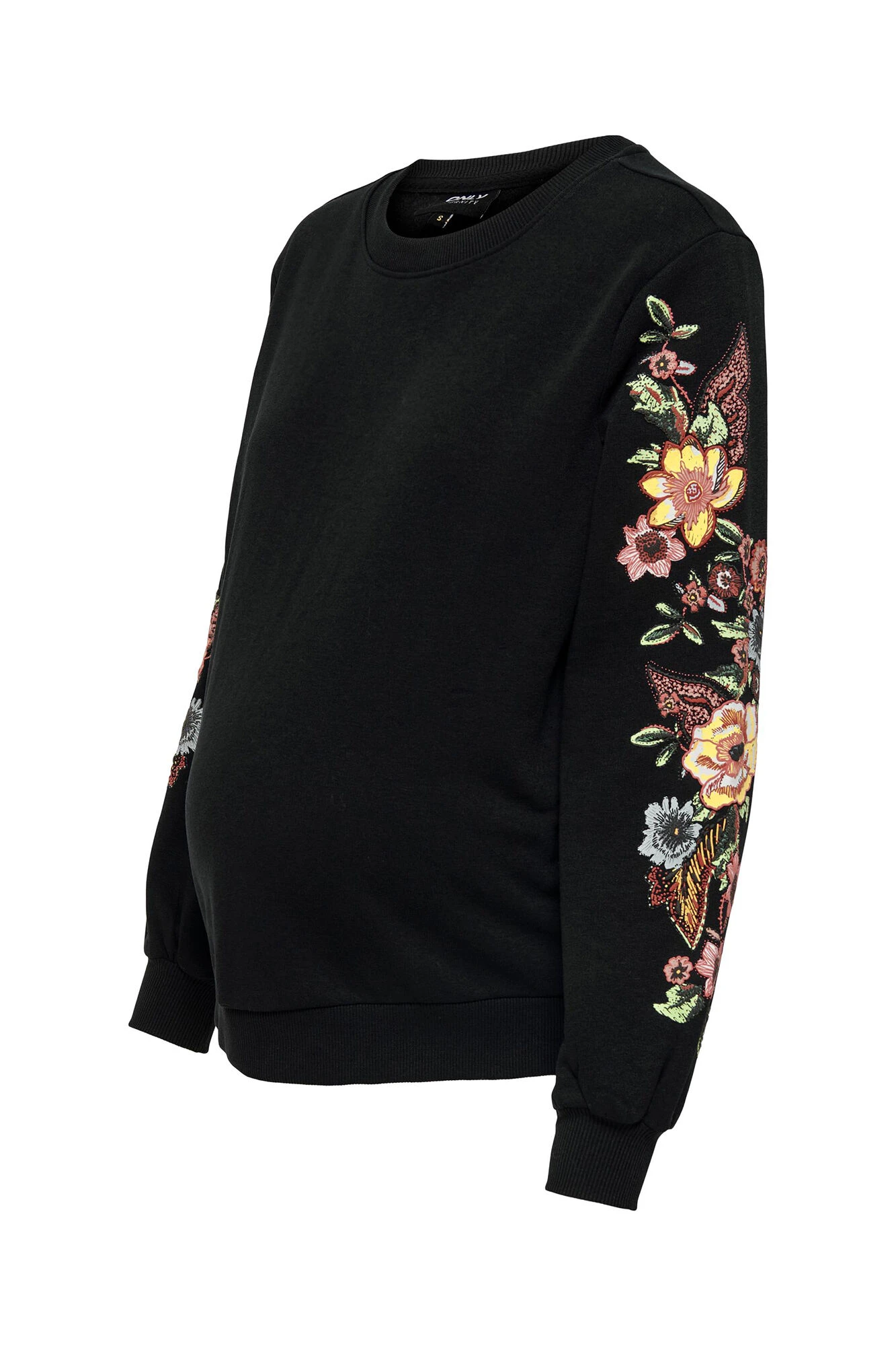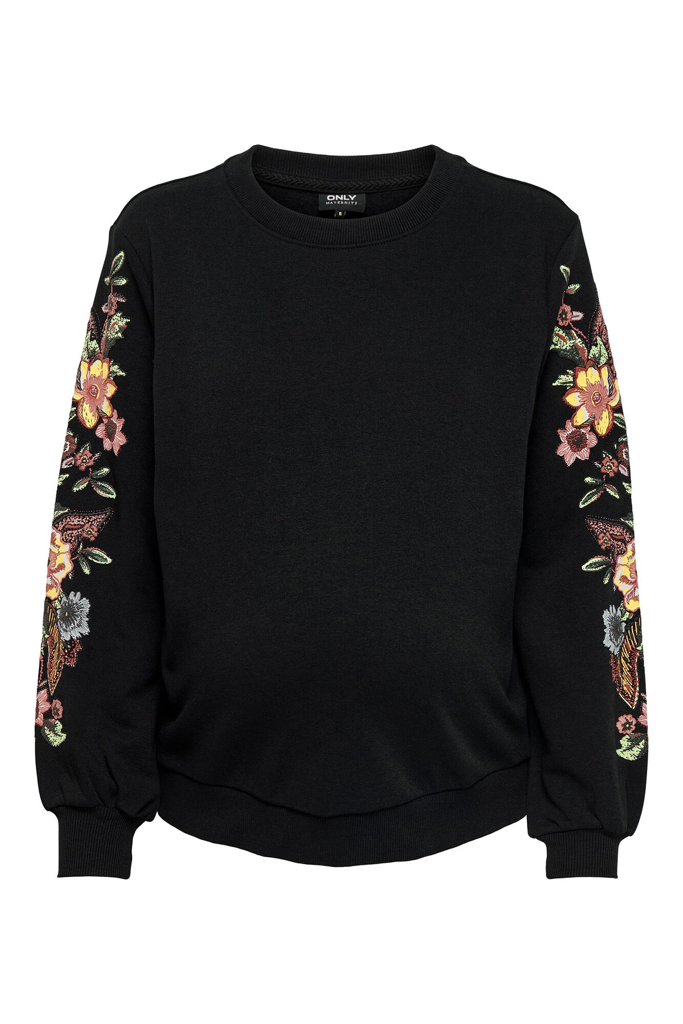 Sudadera maternity, cuello redondo, y mangas largas con detalles bordados.