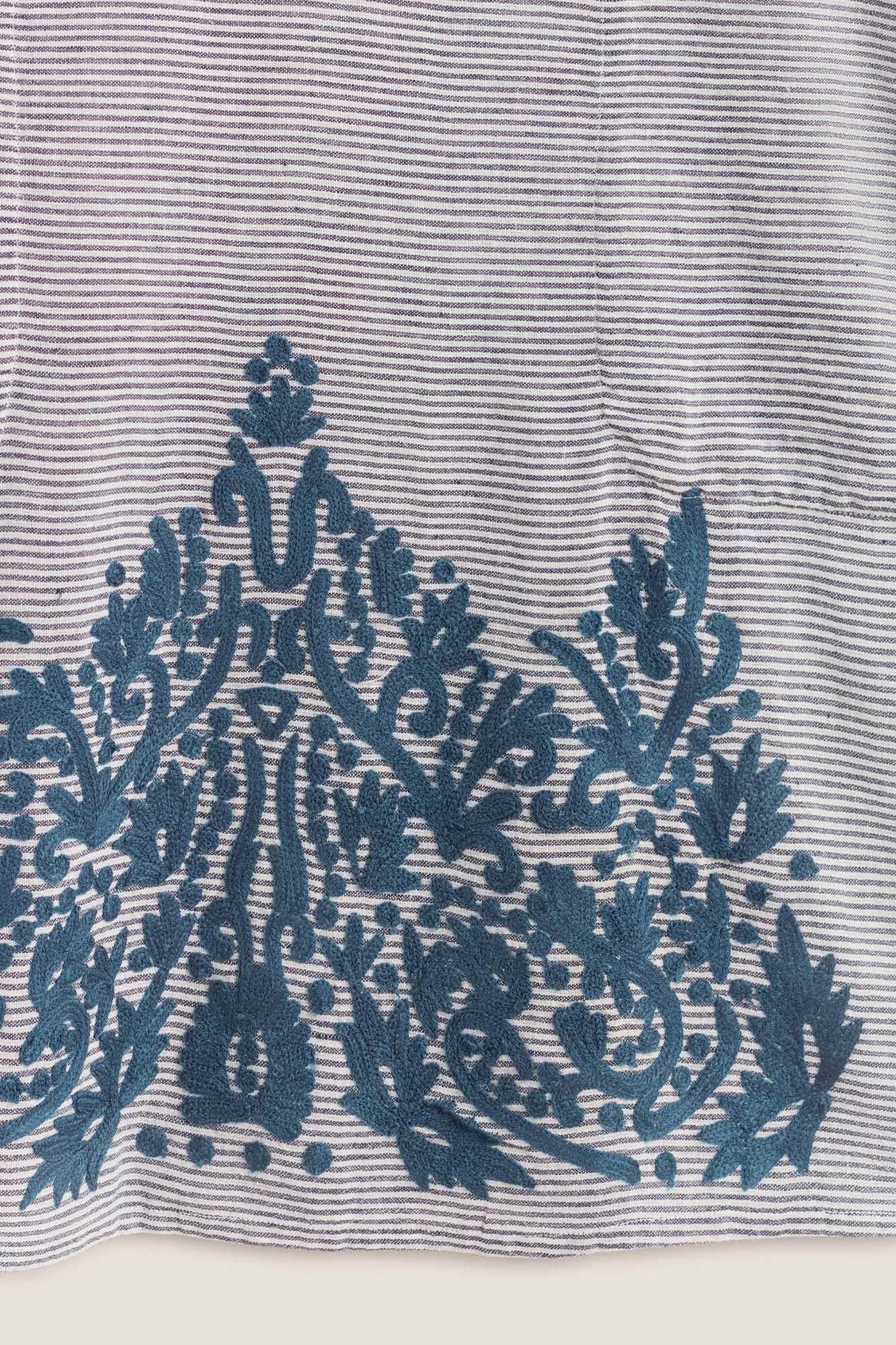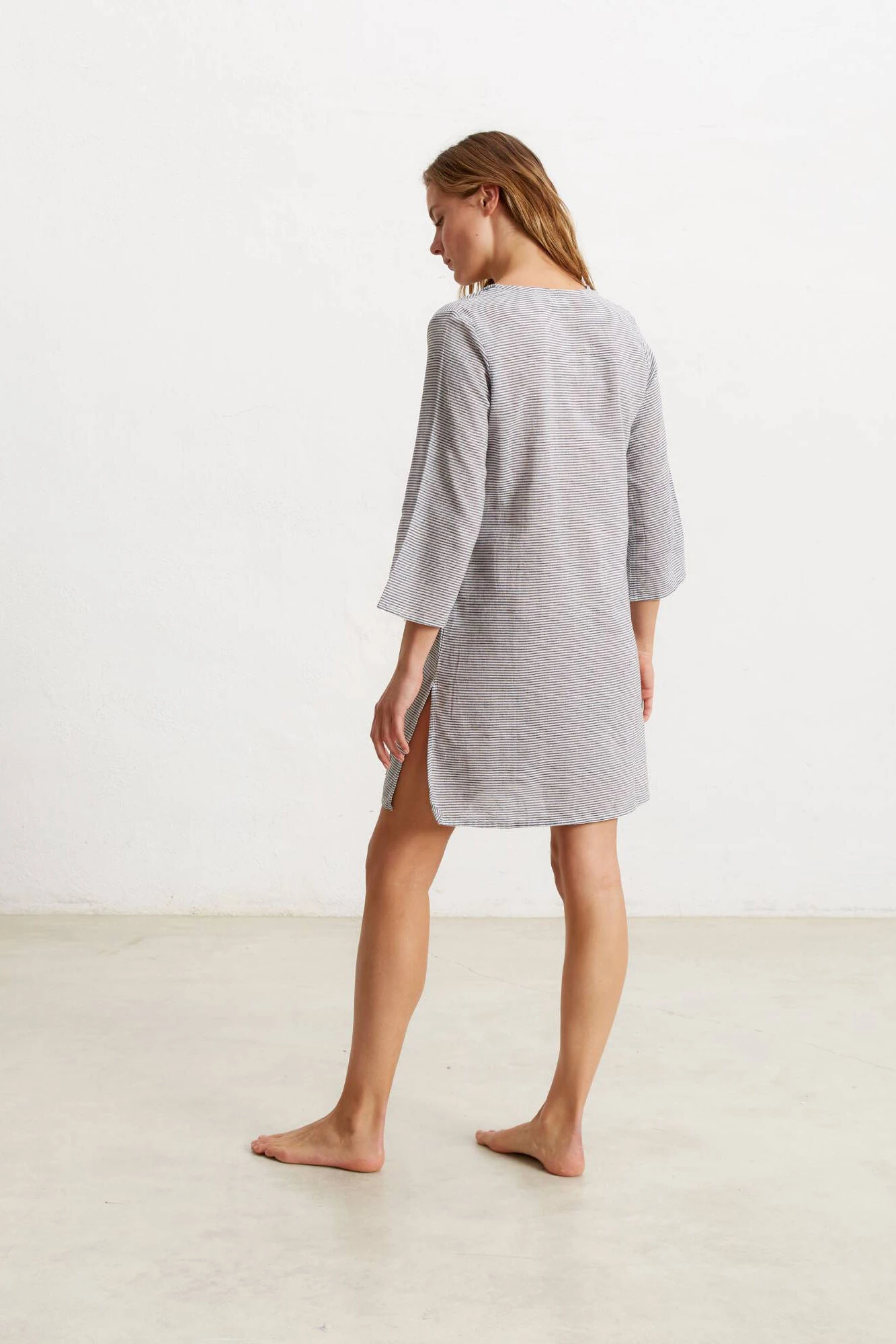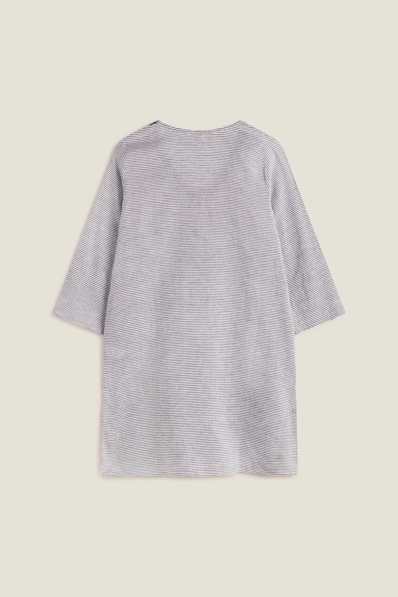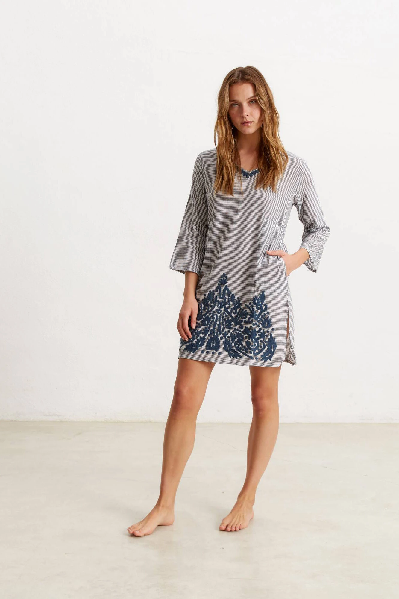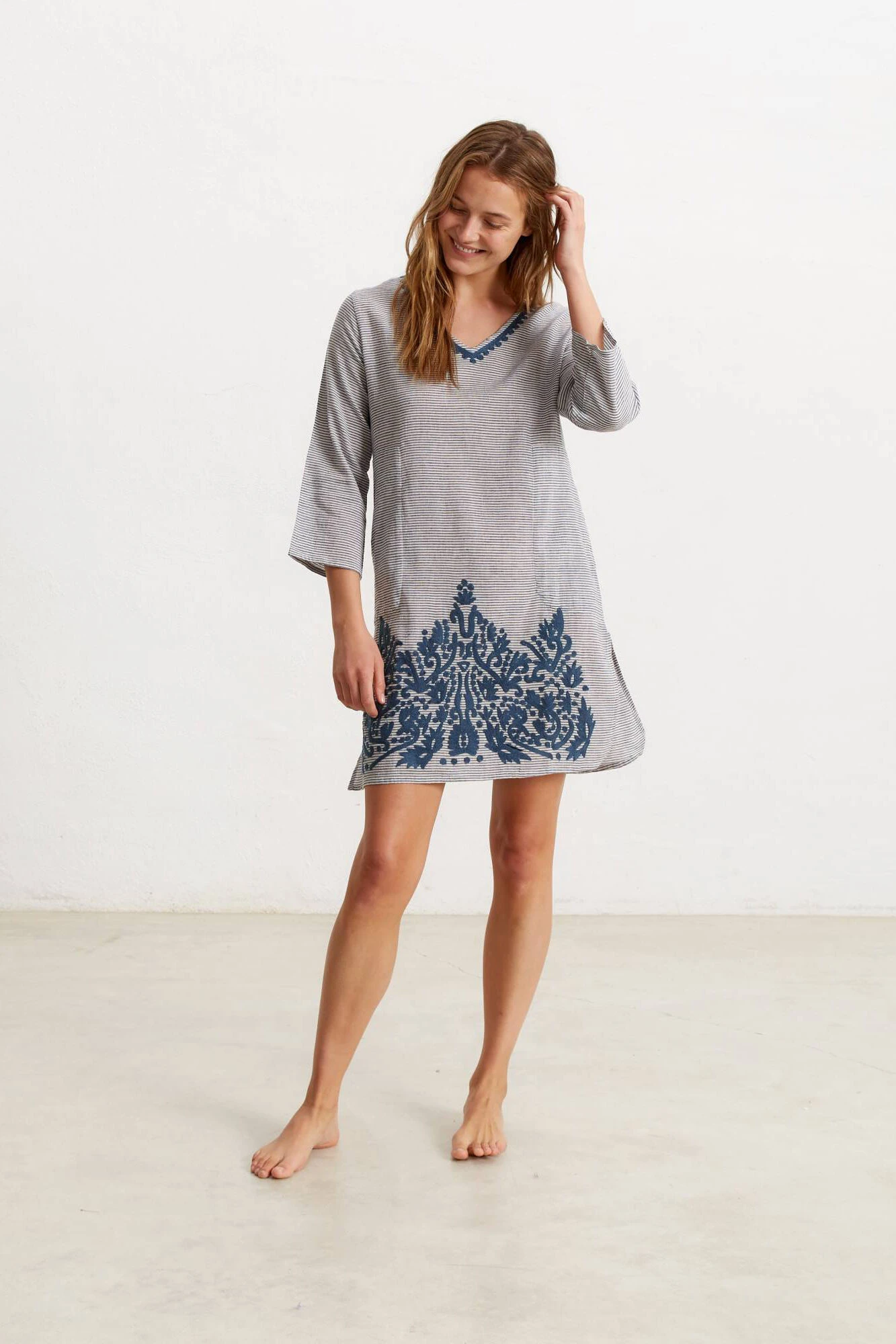 Túnica/vestido de algodón 100% y corte recto. Diseño de finas rayas con bordado en la parte inferior bolsillos laterales. Cuello en V con detalle bordado y larg … o por la rodilla. Tejido de algodón fino y ligero.