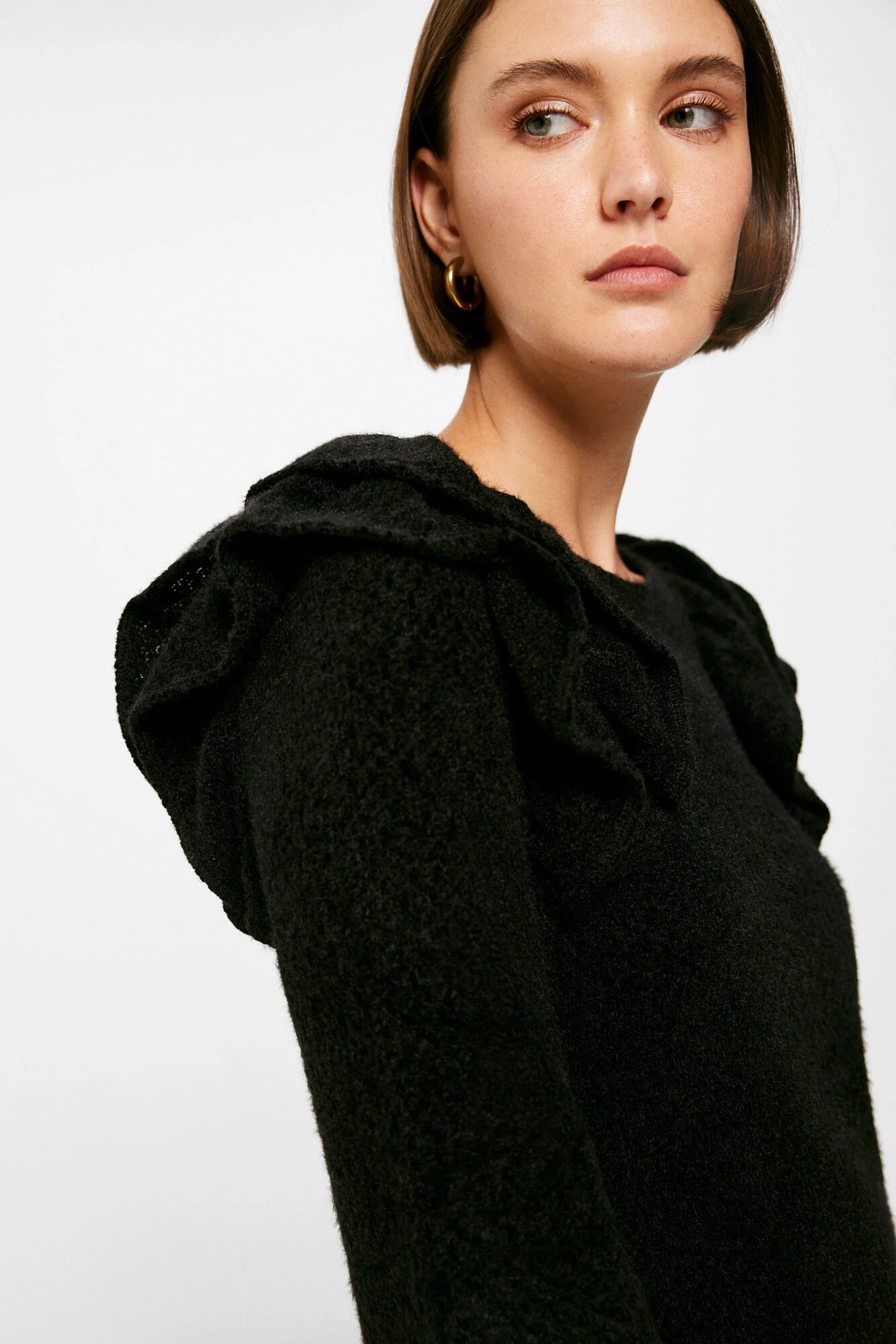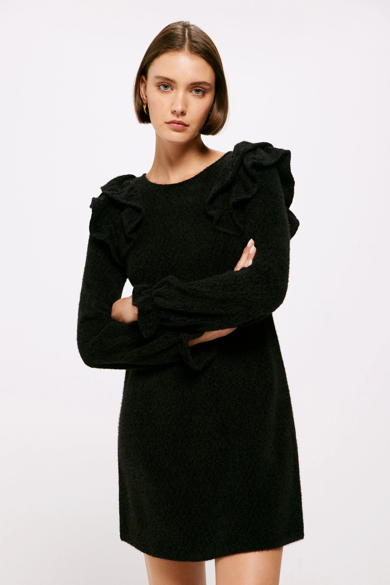Vestido corto de manga larga, con cuello redondo, con detalle de doble volante en los hombros y con volante en los puños.