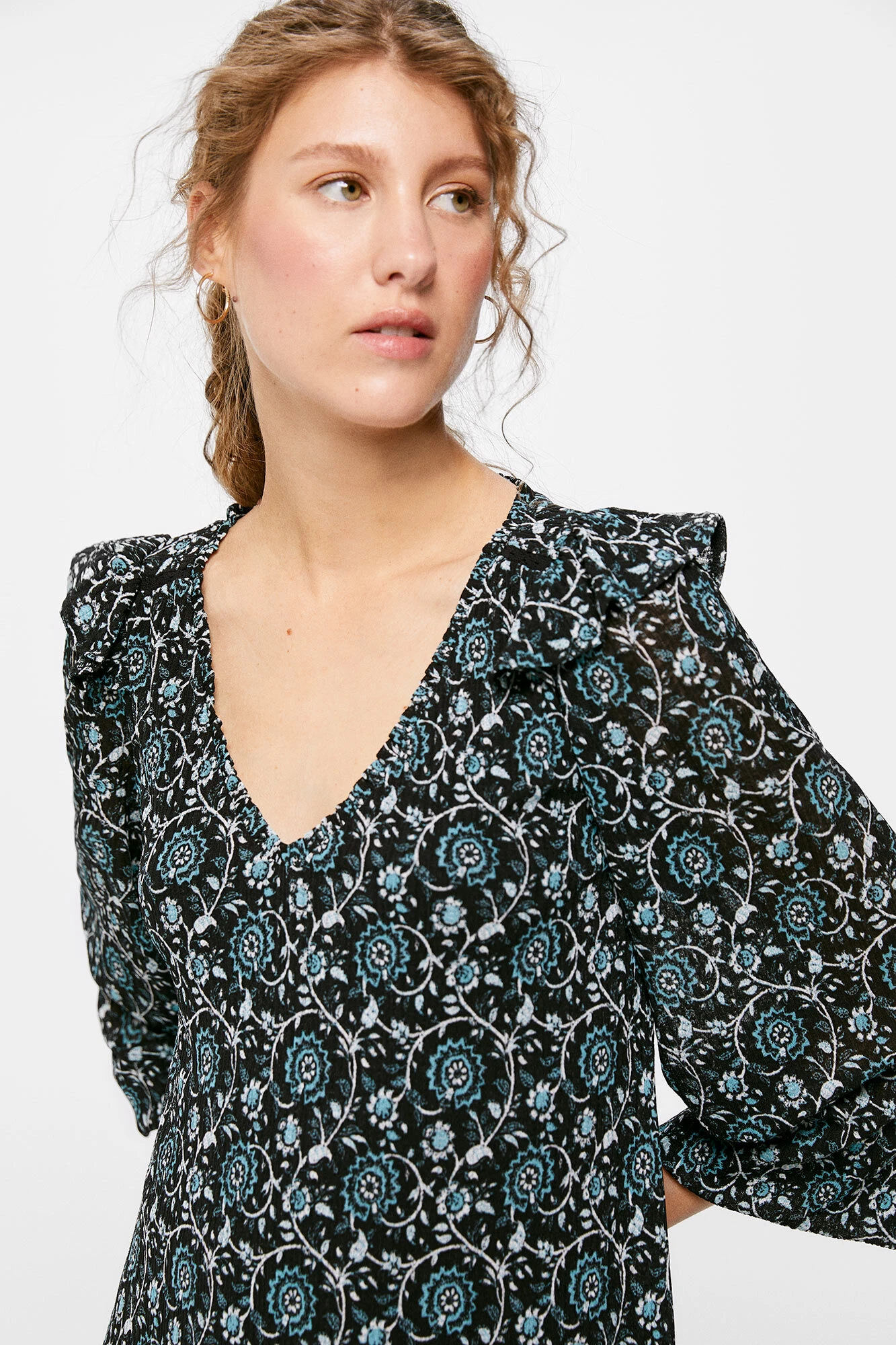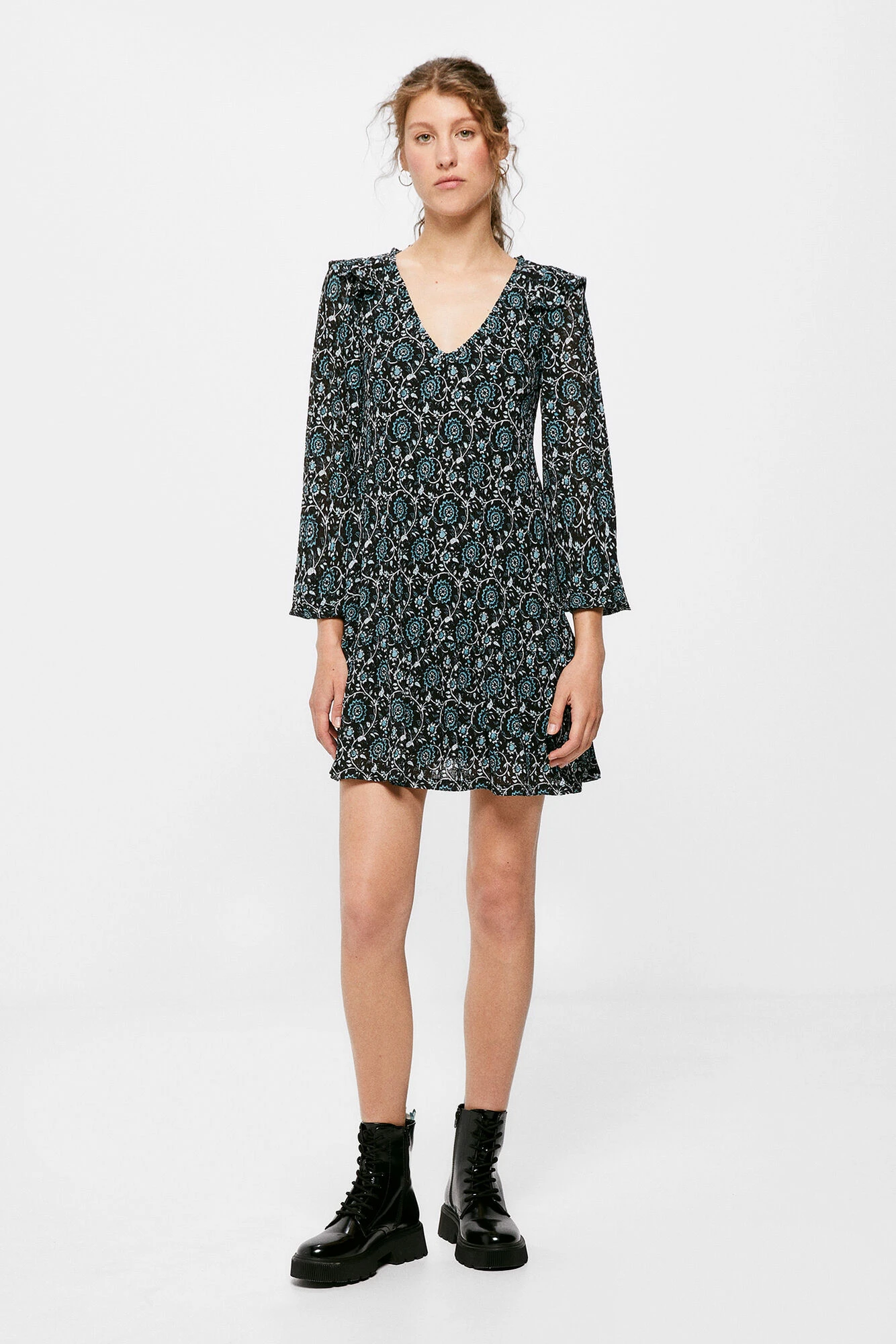 Vestido de línea « A » de manga larga con volumen, con escote en uve, con detalle de volantes en los hombros, con falda con vuelo y con estampado.