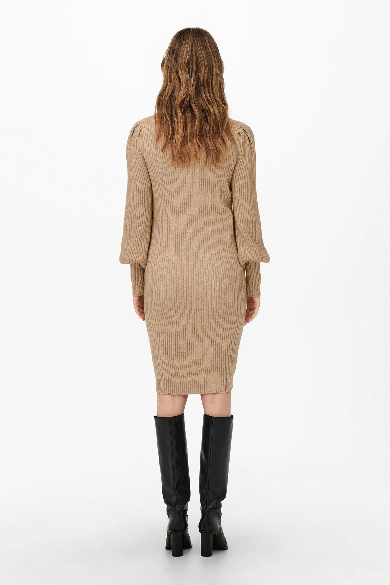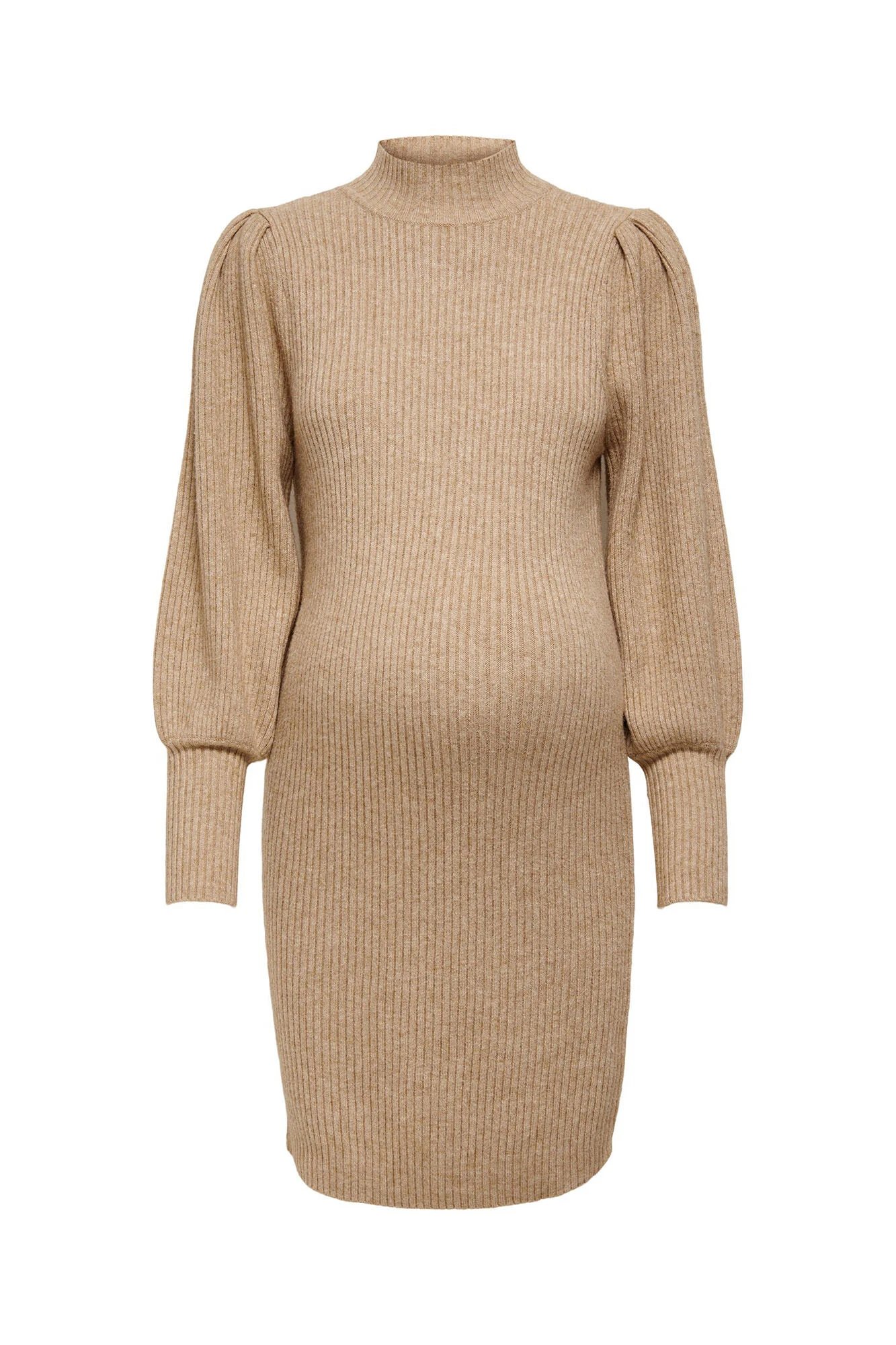 Vestido corto de punto acanalado y cuello alto. Mangas largas tipo globo. Diseñado para adaptarse y apoyar el cuerpo de la embarazada.