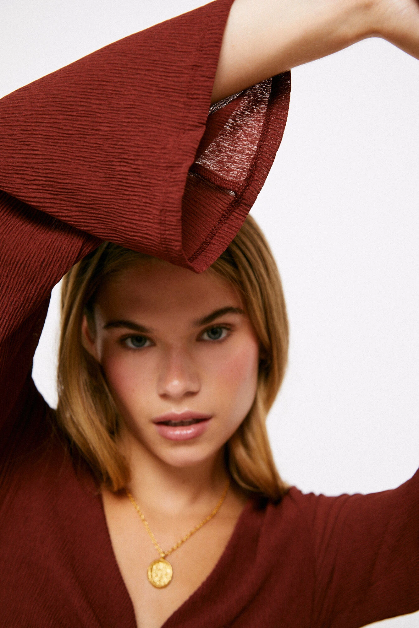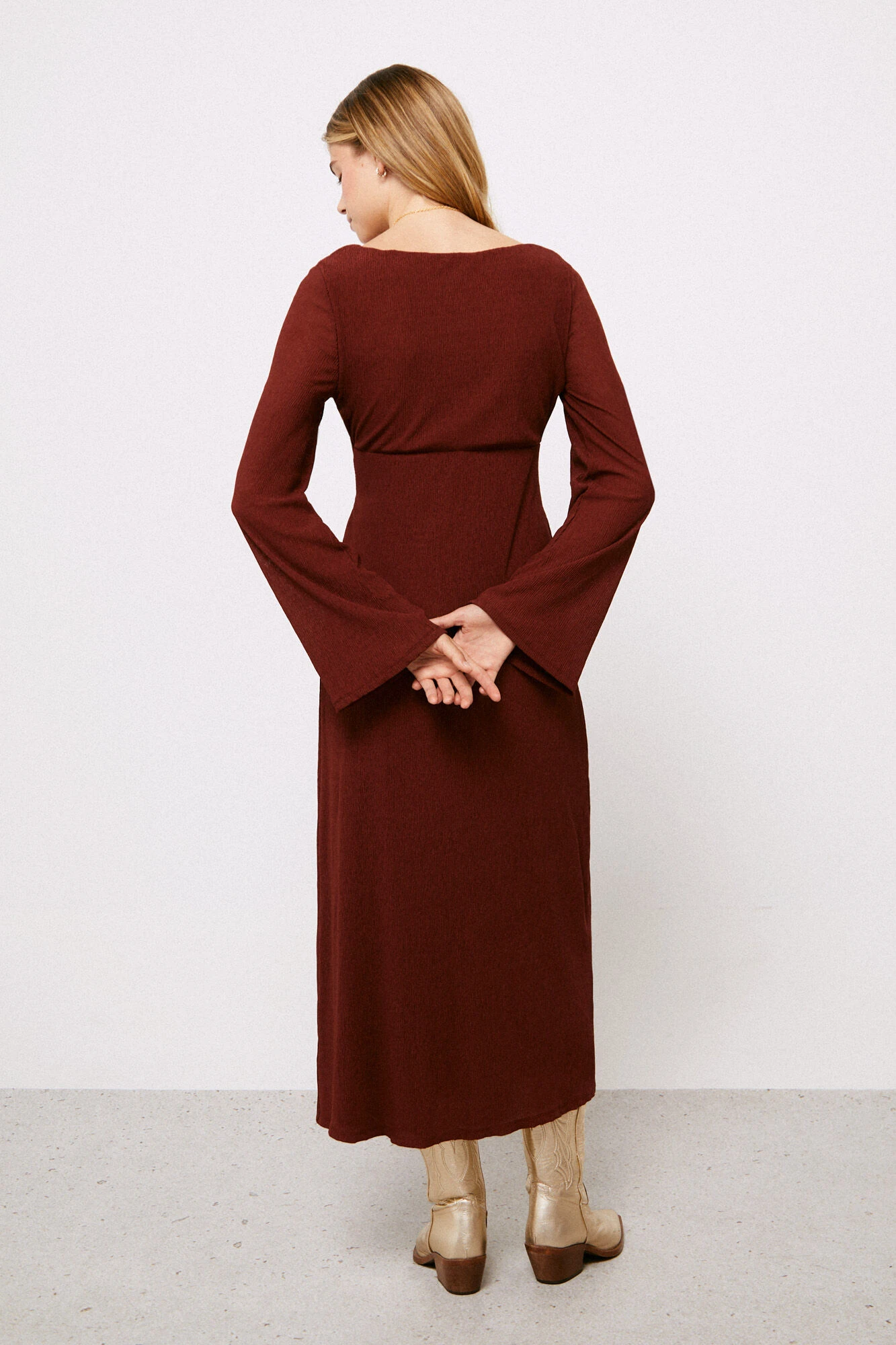 Vestido midi de manga larga, con escote en uve, con detalle de nudo en el escote con abertura, con corte en la cintura, con estructura y de color liso.