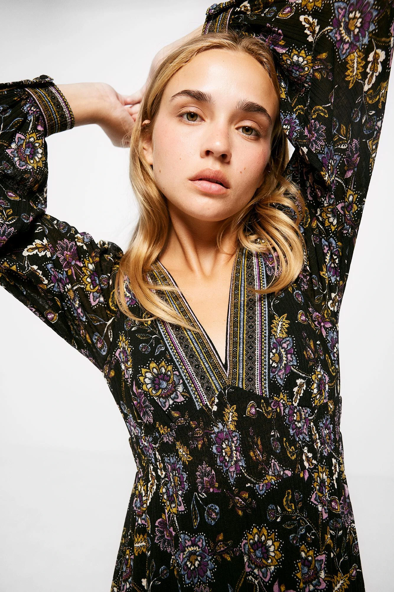 Vestido de manga larga con volumen, con escote en uve, con goma en la cintura, con estampado de flores y con cenefas en el escote en los puños y en el bajo de l … a falda.