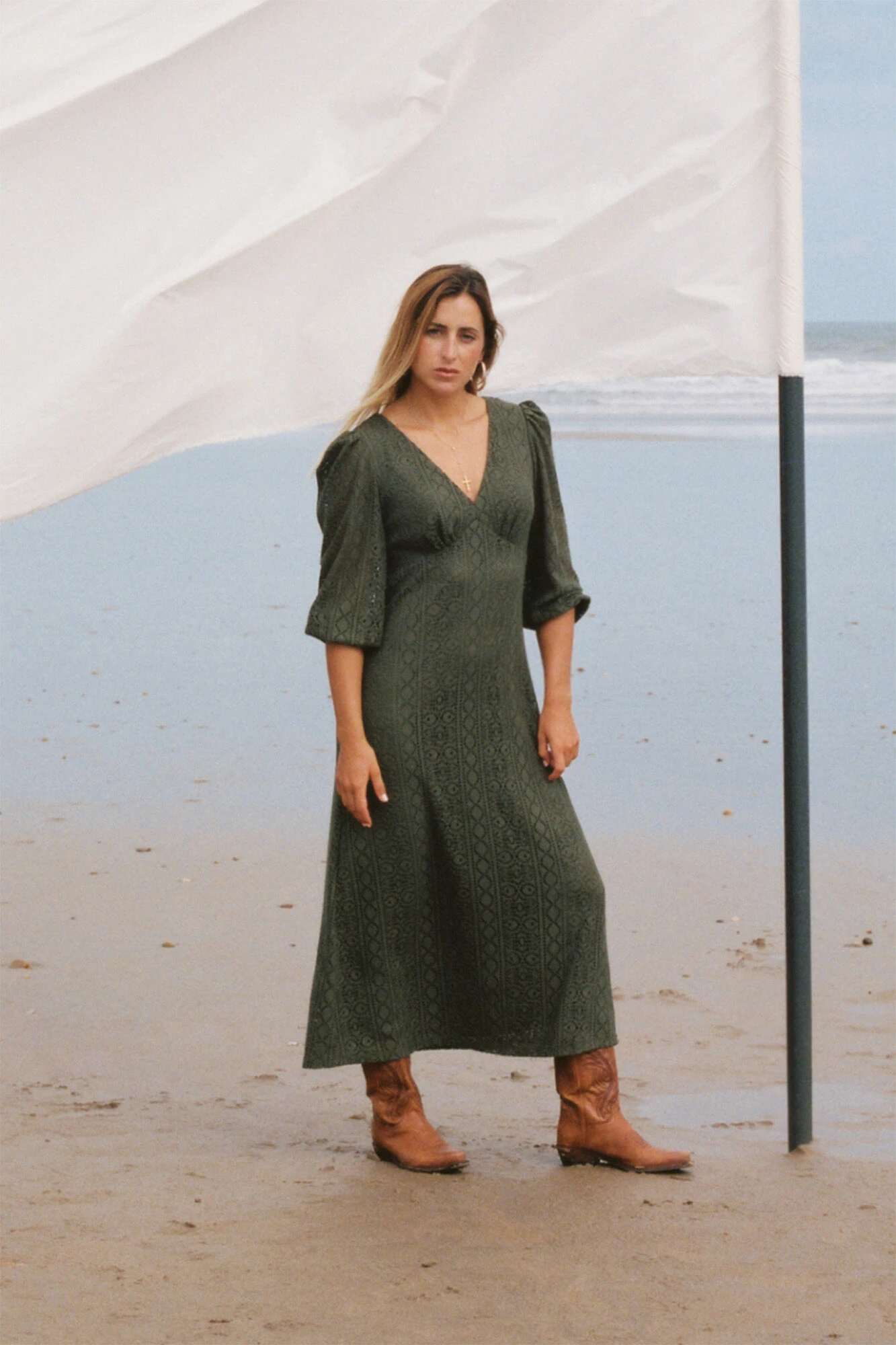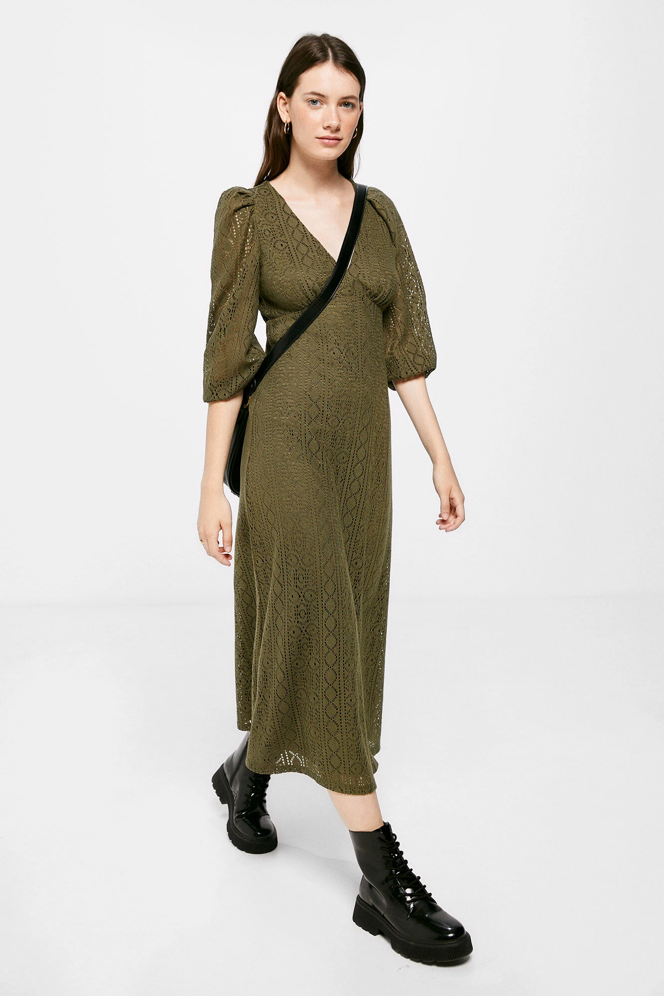 Vestido de manga 7/8s, con escote en uve, con corte debajo del pecho, con goma en los puños, con falda con vuelo y con estructura de crochet.