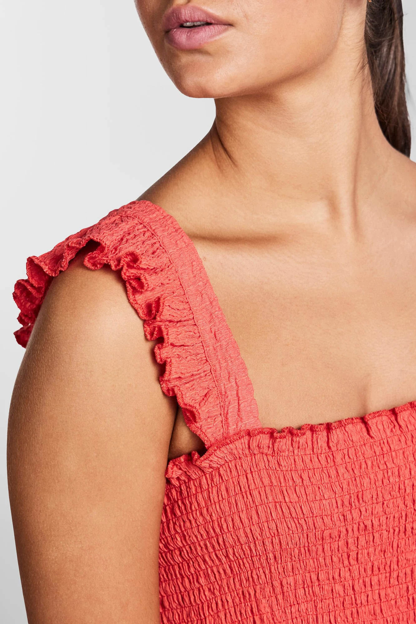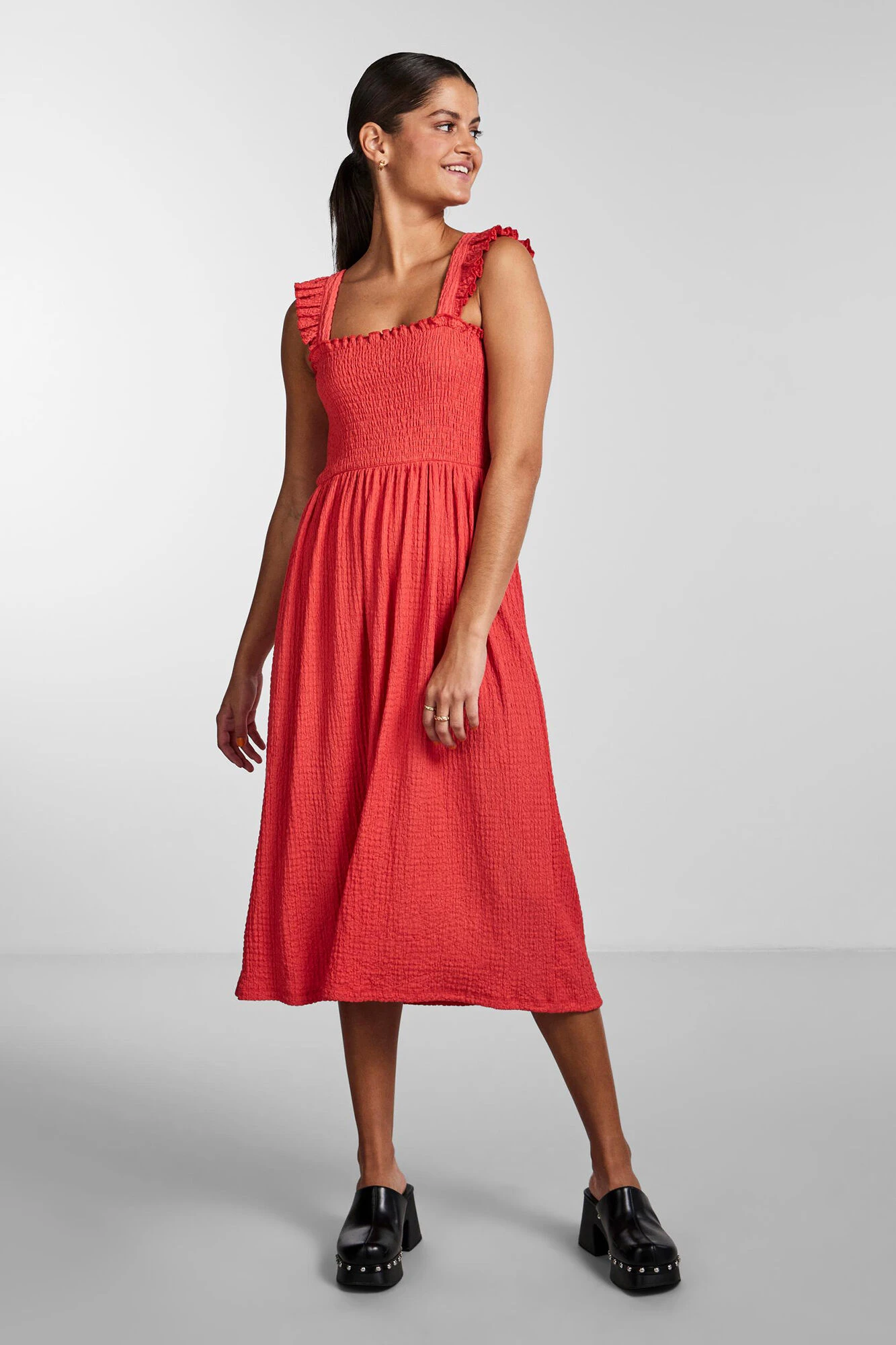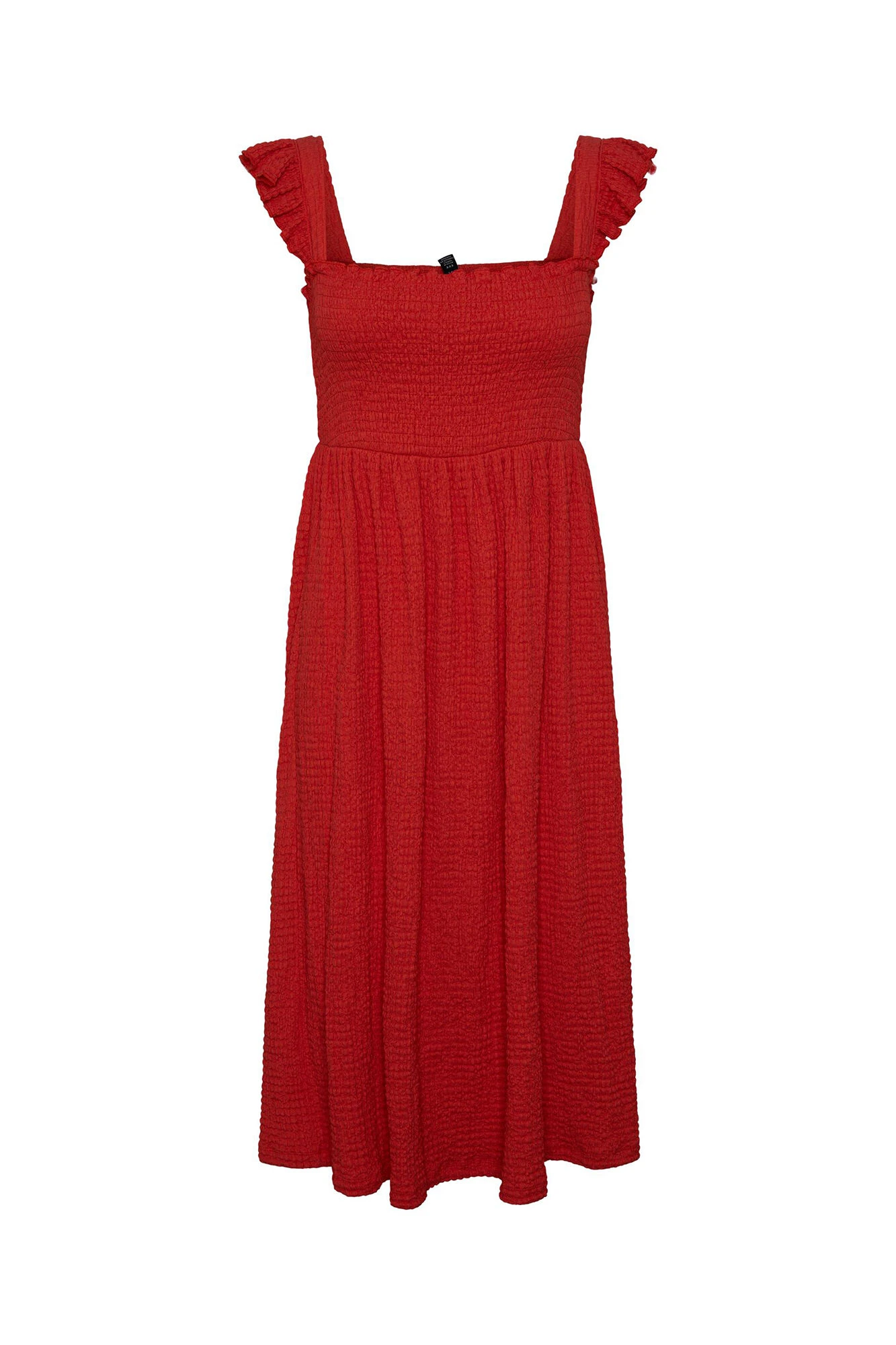 Vestido midi de mujer con escote de nido de abeja.Detalle de volante en el tirante.