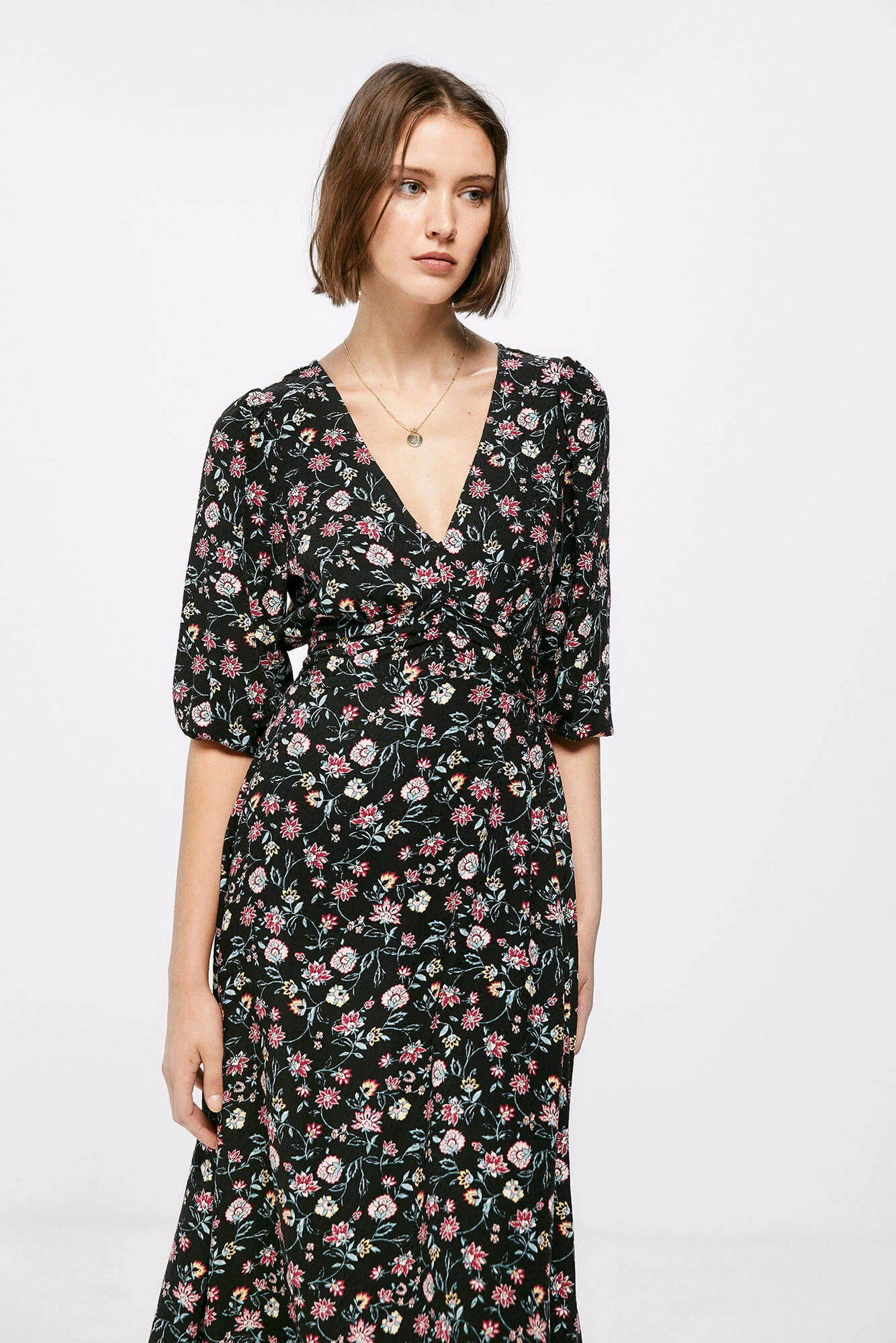 Vestido de manga 7/8s, con escote en uve, con cintura ajustada con frunces, con goma en la espalda, con falda con vuelo y con estampado de flores.