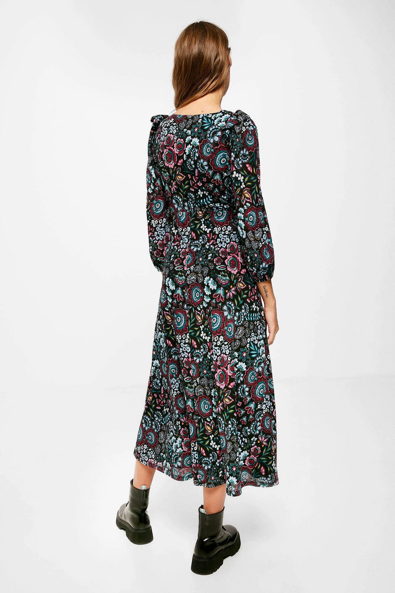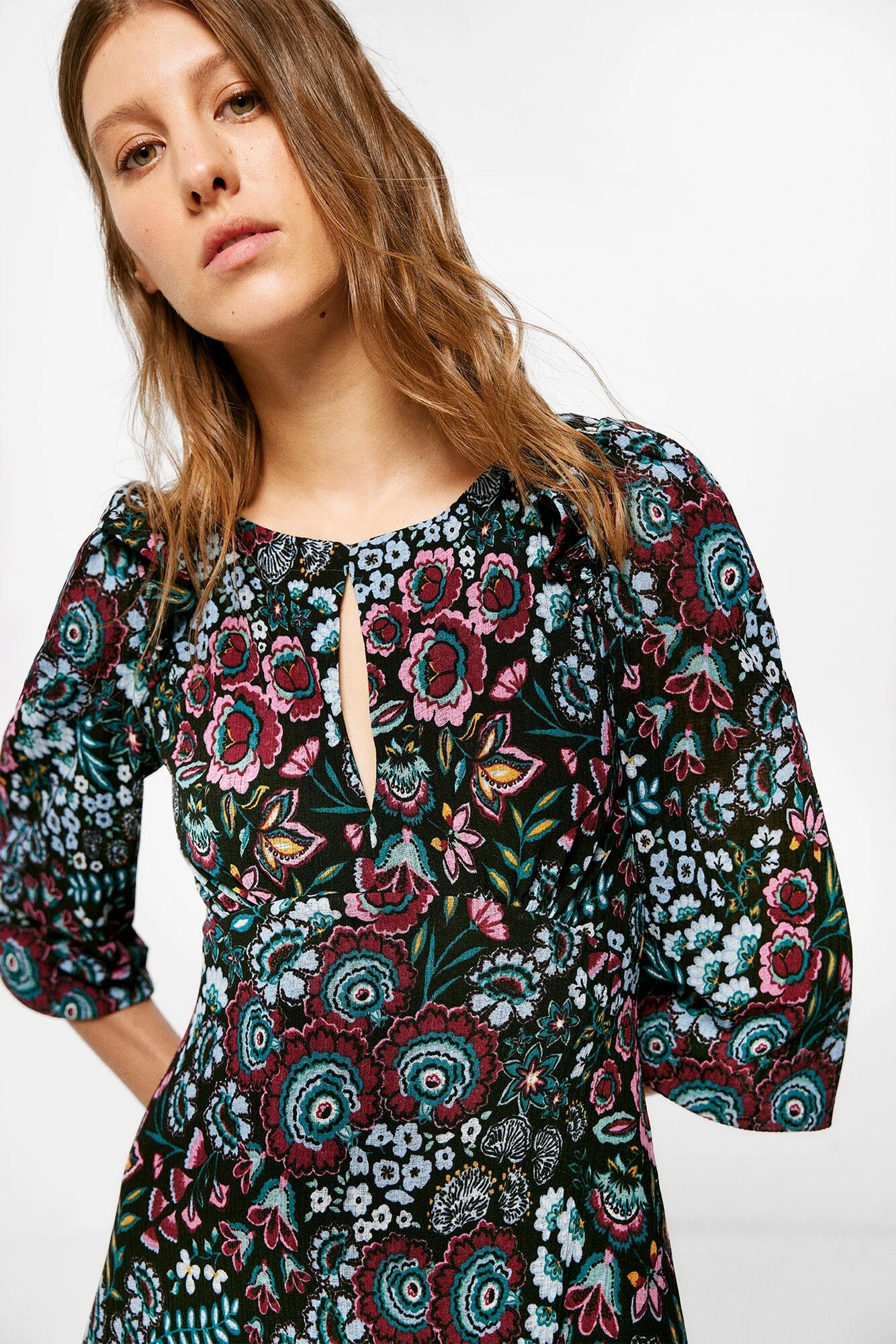 Vestido de manga larga con volumen, con cuello redondo, con abertura en el escote, con detalle de volantes en los hombros, con falda con vuelo y con estampado d … e flores.
