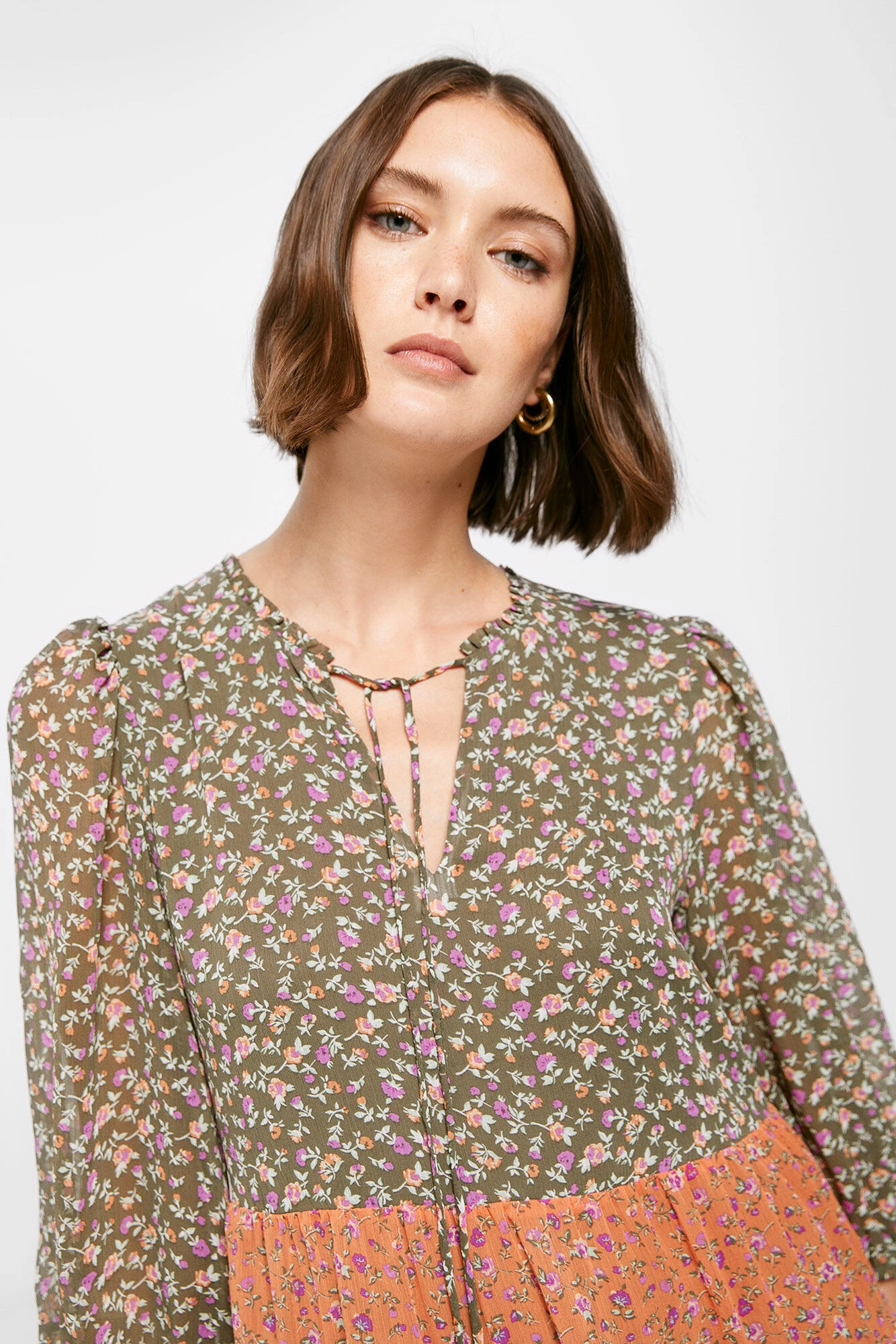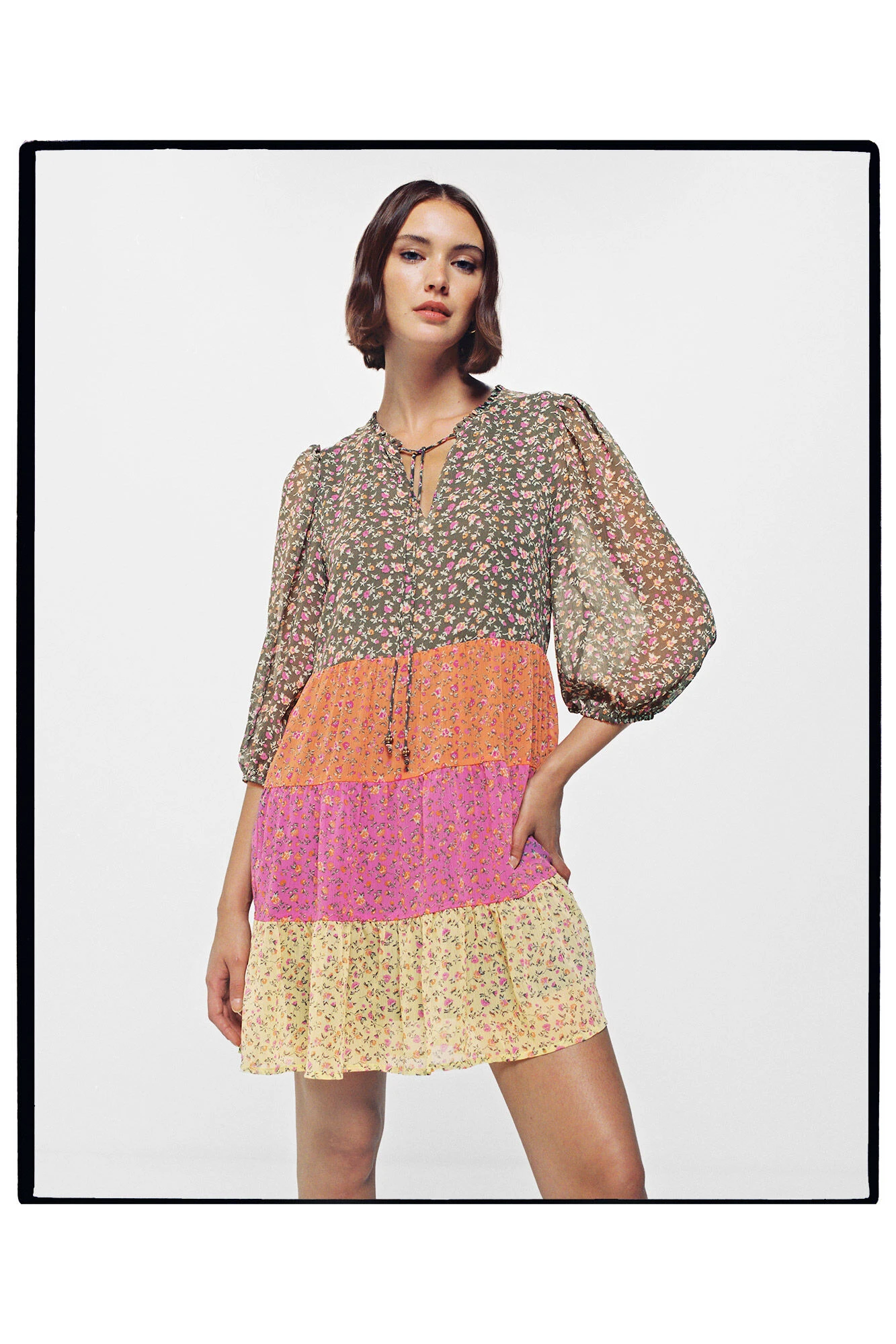 Vestido corto de manga 3/4s con volumen, con cuello redondo con abertura en el escote con lazo, con falda con paneles y con estampado de flores.